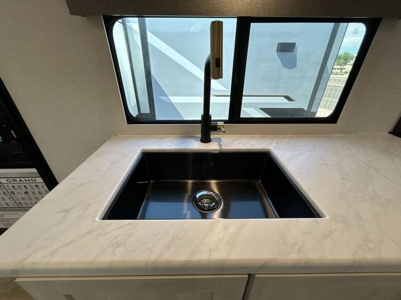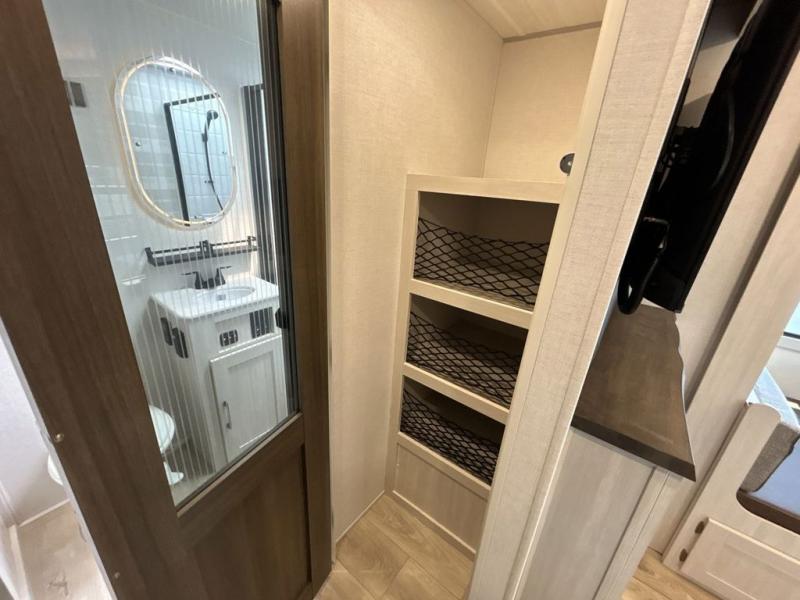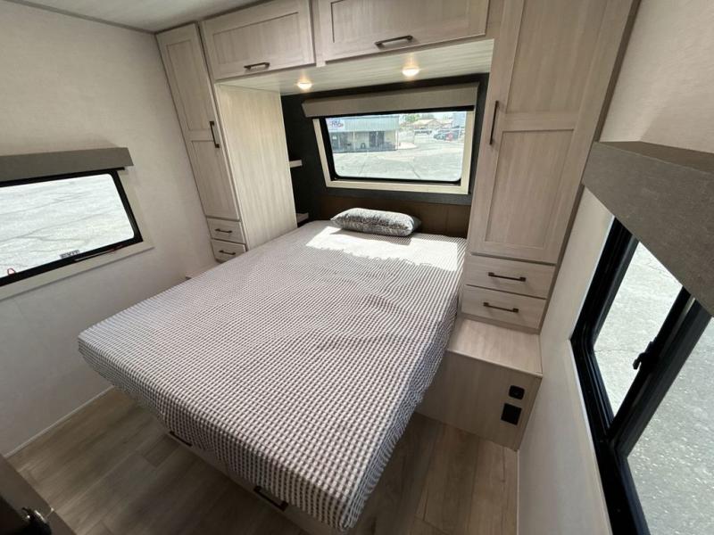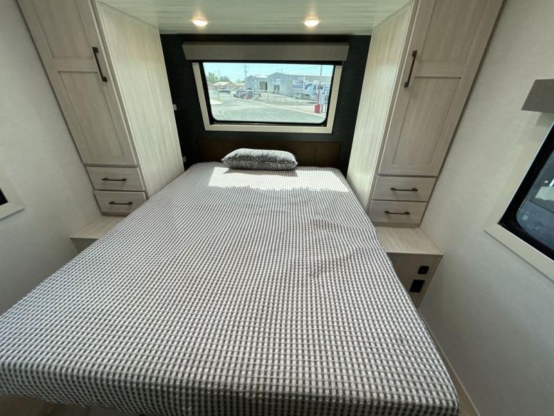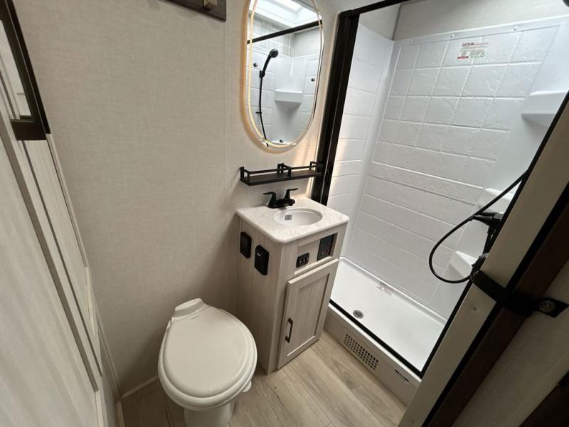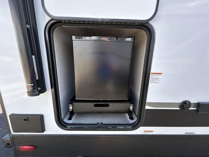 Whether you're camping with friends or family, you'll love the space and comfort found in this travel trailer. The outside kitchen is packed with features, such as a gas griddle, sink, refrigerator, and a shelf, plus there is a 21' electric awning for shade. Head inside to relax on the EZ- out sofa, or play a game at the booth dinette. You will also love the HD TV for your favorite shows at night. This model includes a full rear bath with a linen closet for clean towels and an upgraded slow-close shower door.