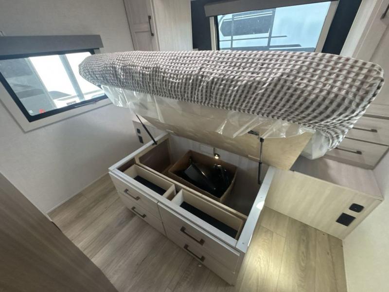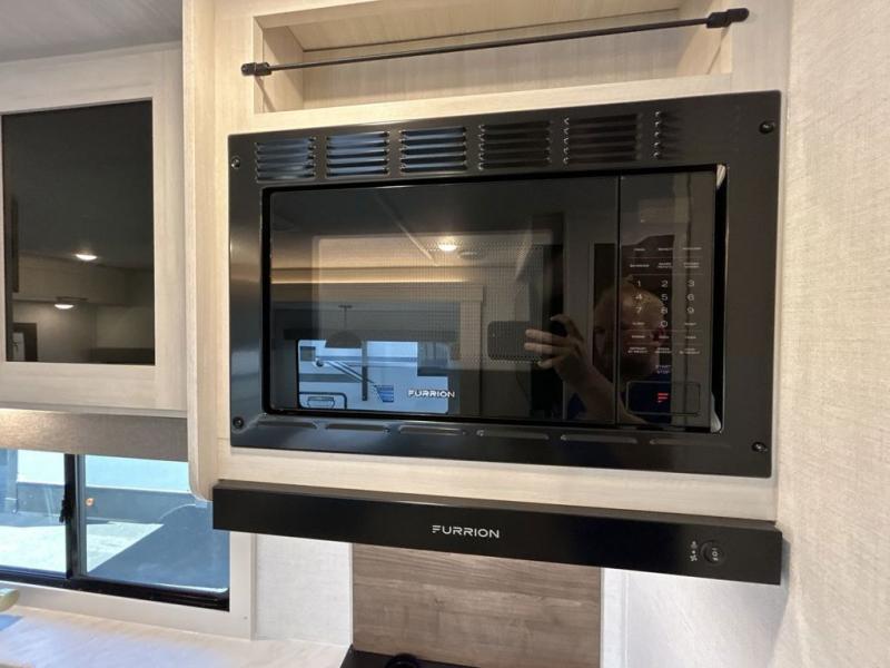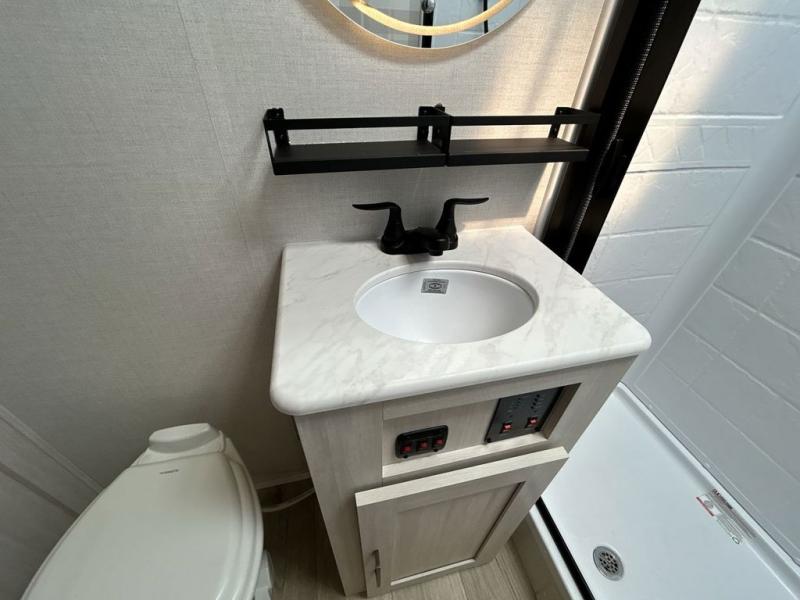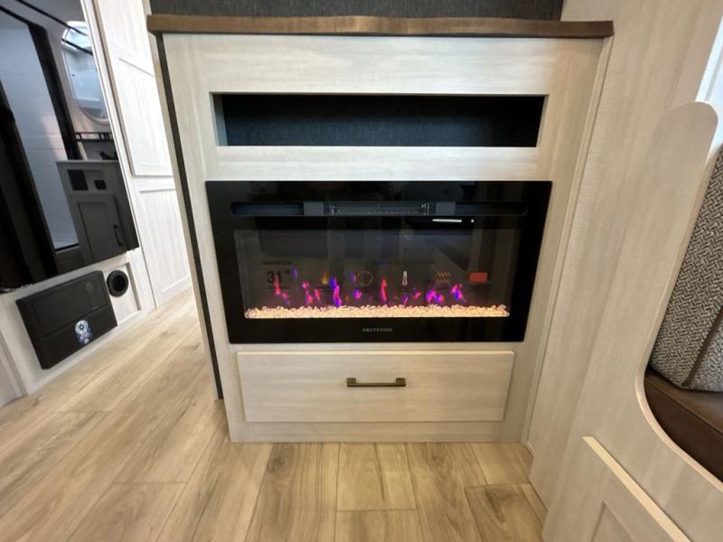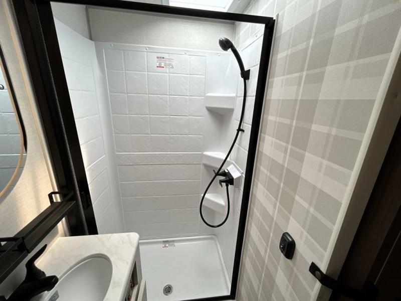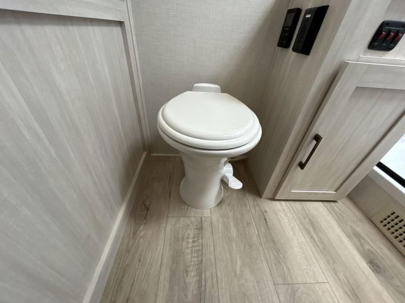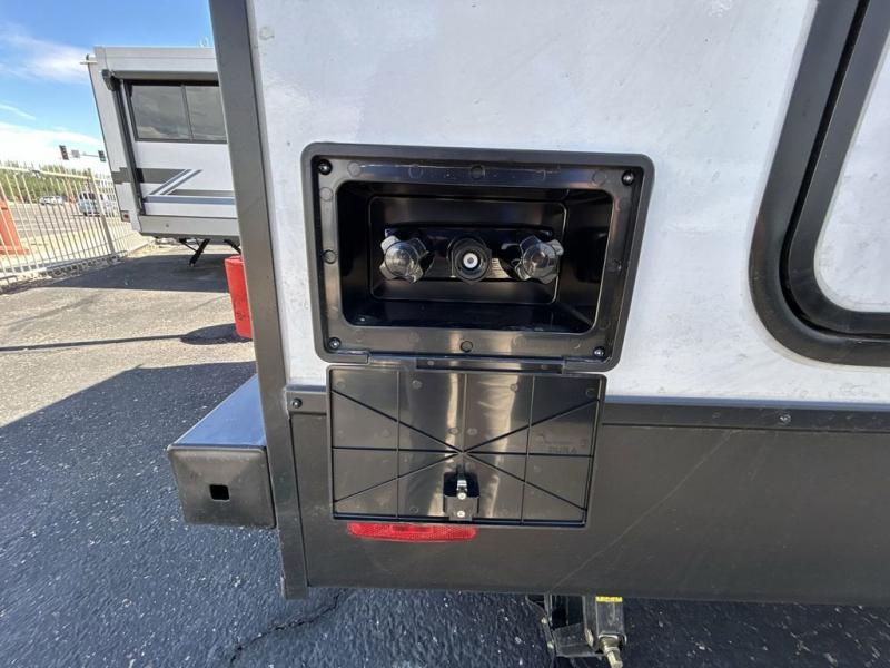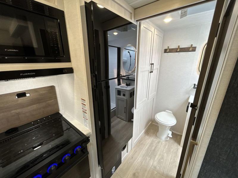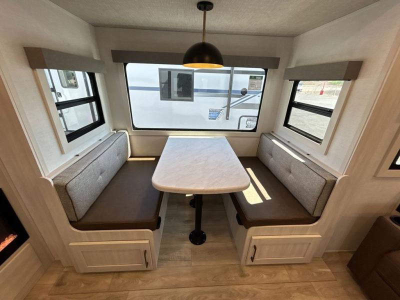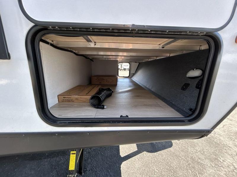 Whether you're camping with friends or family, you'll love the space and comfort found in this travel trailer. The outside kitchen is packed with features, such as a gas griddle, sink, refrigerator, and a shelf, plus there is a 21' electric awning for shade. Head inside to relax on the EZ- out sofa, or play a game at the booth dinette. You will also love the HD TV for your favorite shows at night. This model includes a full rear bath with a linen closet for clean towels and an upgraded slow-close shower door.