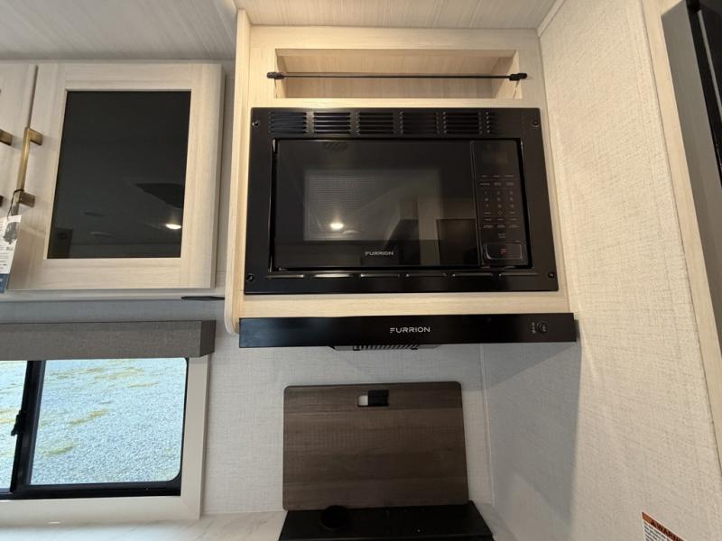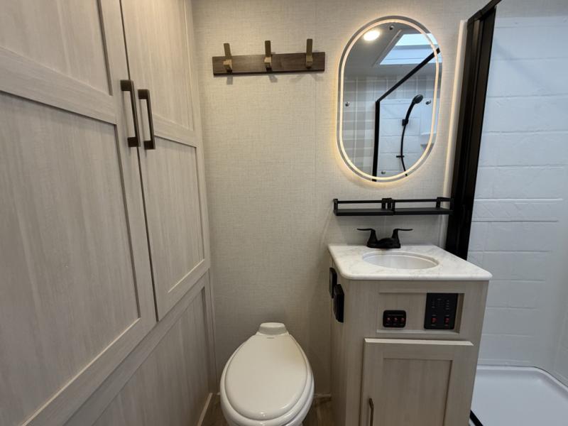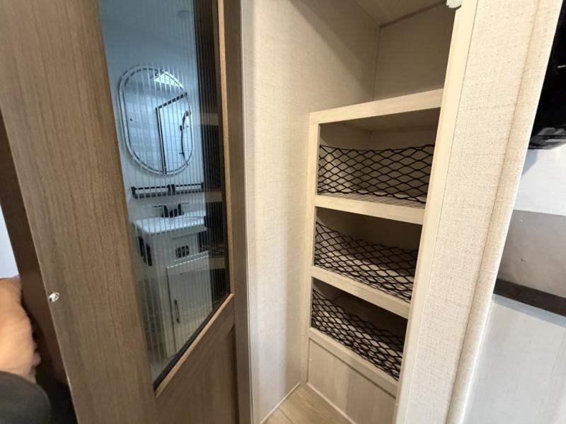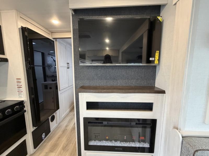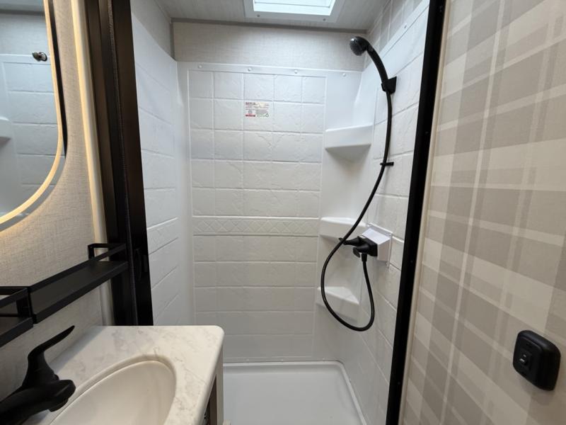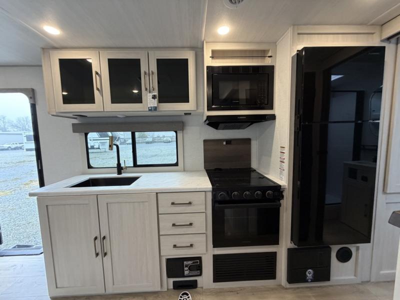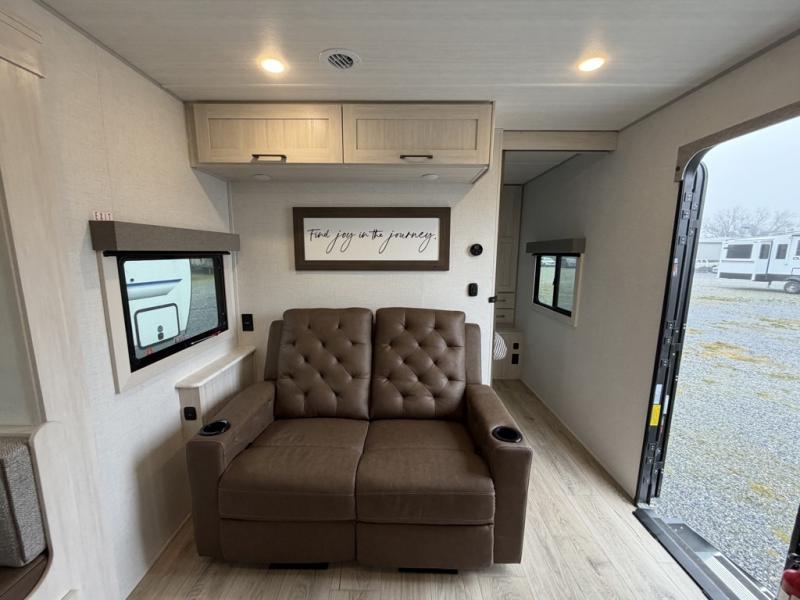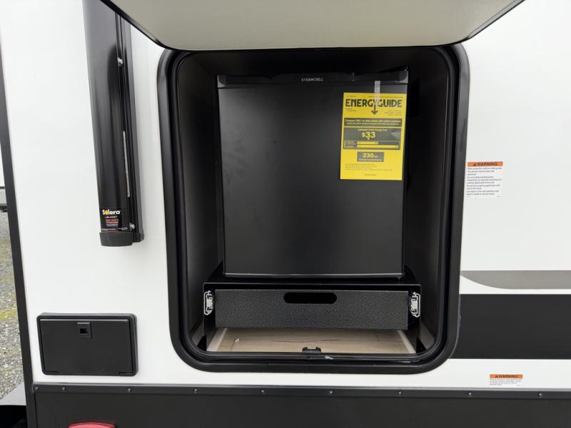 Whether you're camping with friends or family, you'll love the space and comfort found in this travel trailer. The outside kitchen is packed with features, such as a gas griddle, sink, refrigerator, and a shelf, plus there is a 21' electric awning for shade. Head inside to relax on the EZ- out sofa, or play a game at the booth dinette. You will also love the HD TV for your favorite shows at night. This model includes a full rear bath with a linen closet for clean towels and an upgraded slow-close shower door.