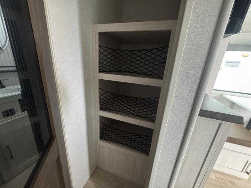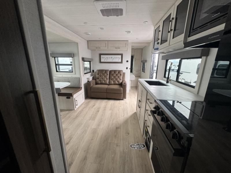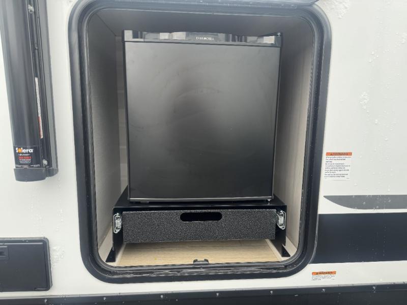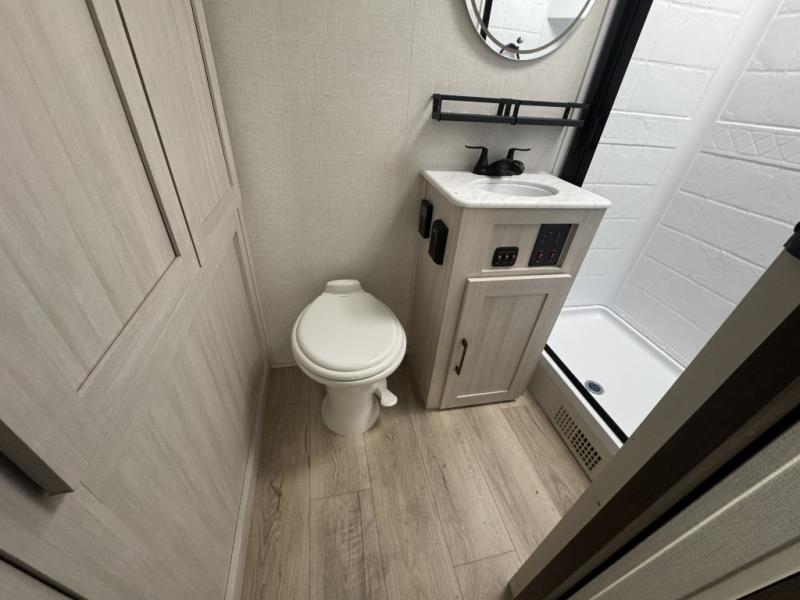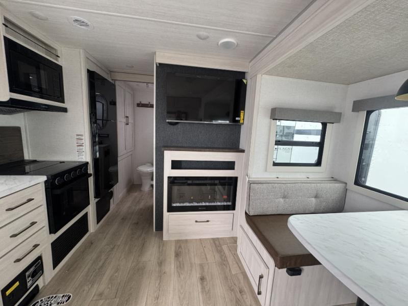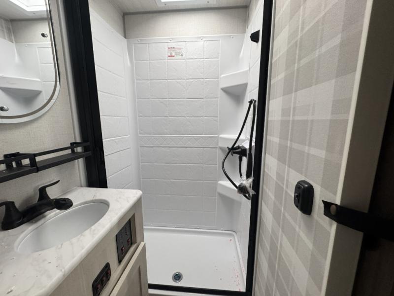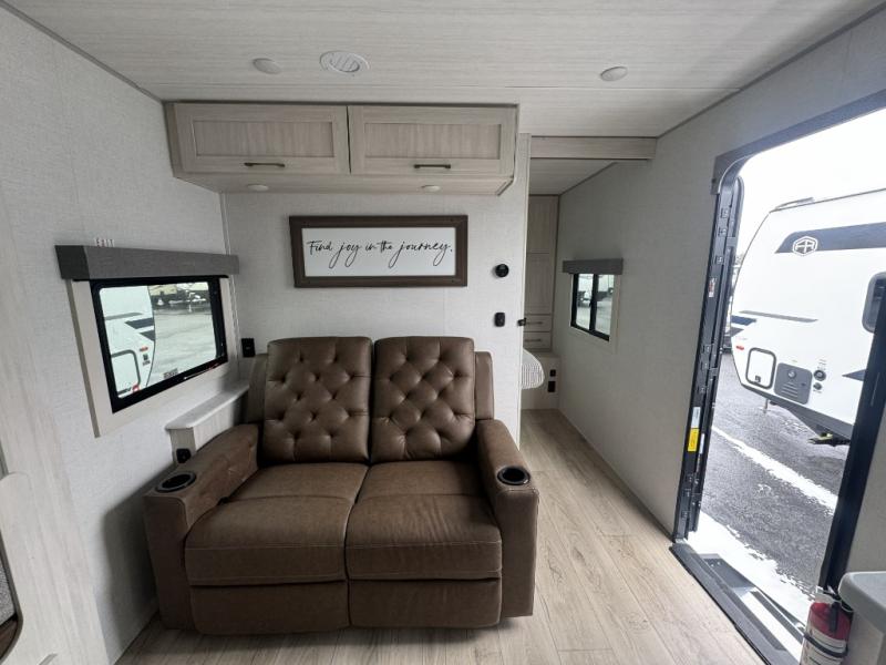 Whether you're camping with friends or family, you'll love the space and comfort found in this travel trailer. The outside kitchen is packed with features, such as a gas griddle, sink, refrigerator, and a shelf, plus there is a 21' electric awning for shade. Head inside to relax on the EZ- out sofa, or play a game at the booth dinette. You will also love the HD TV for your favorite shows at night. This model includes a full rear bath with a linen closet for clean towels and an upgraded slow-close shower door.