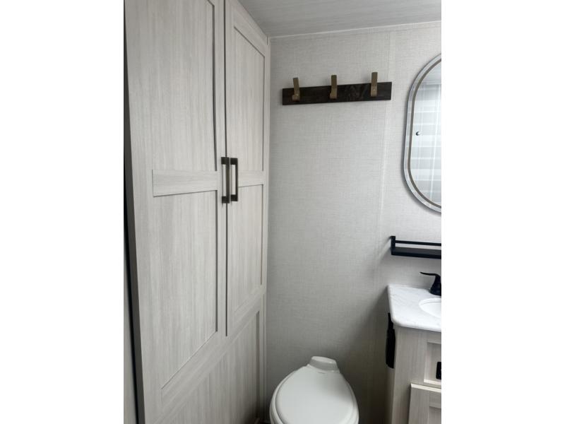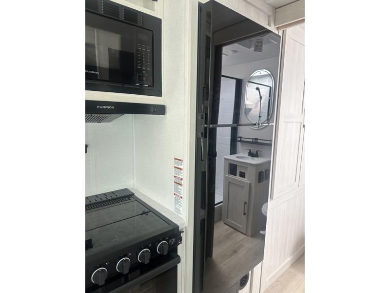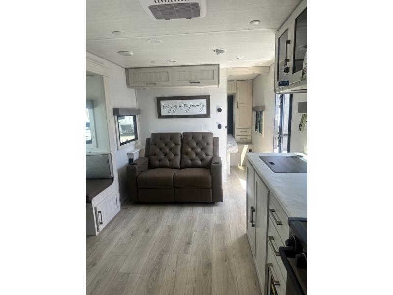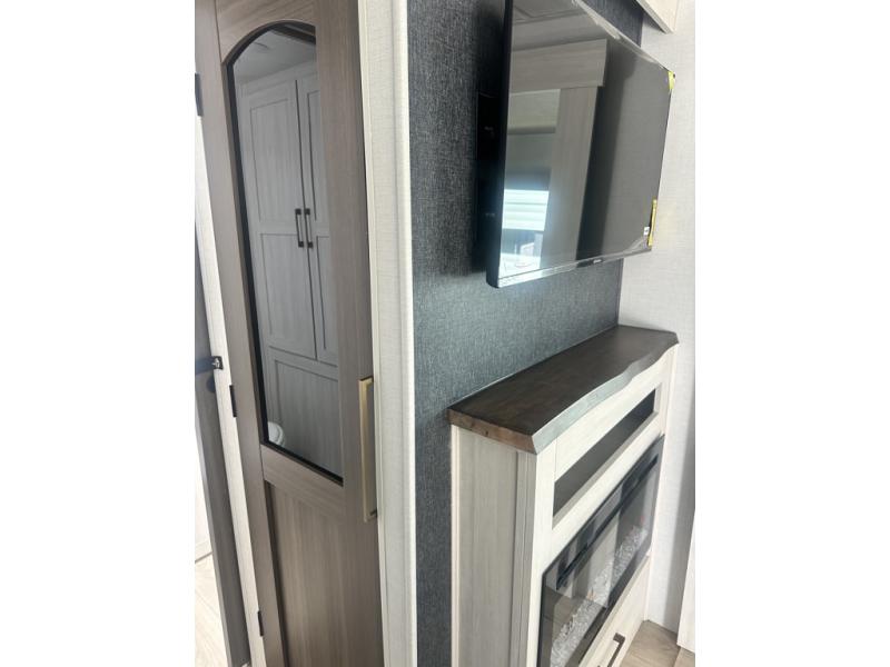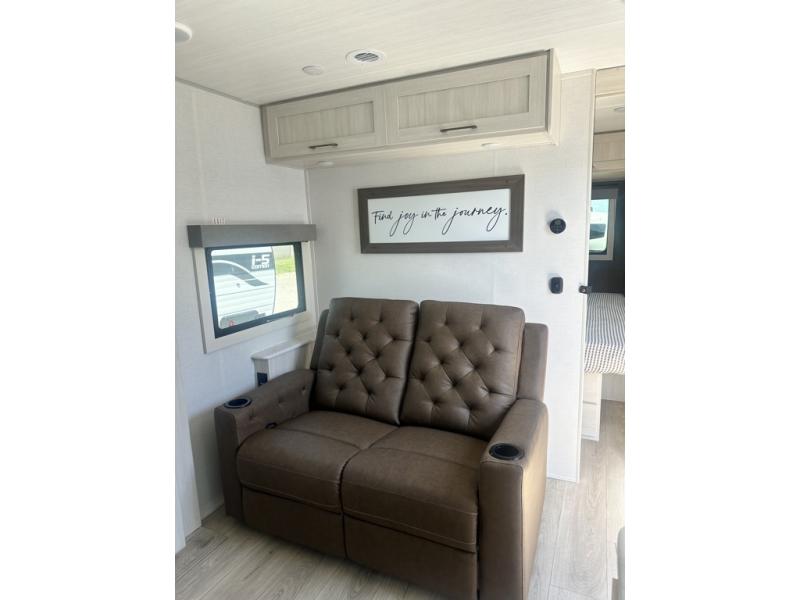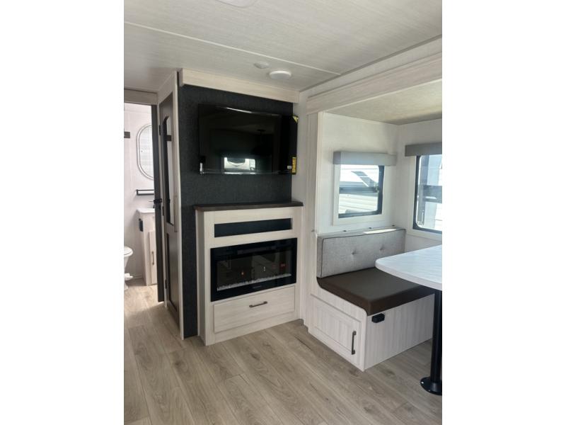 Whether you're camping with friends or family, you'll love the space and comfort found in this travel trailer. The outside kitchen is packed with features, such as a gas griddle, sink, refrigerator, and a shelf, plus there is a 21' electric awning for shade. Head inside to relax on the EZ- out sofa, or play a game at the booth dinette. You will also love the HD TV for your favorite shows at night. This model includes a full rear bath with a linen closet for clean towels and an upgraded slow-close shower door.