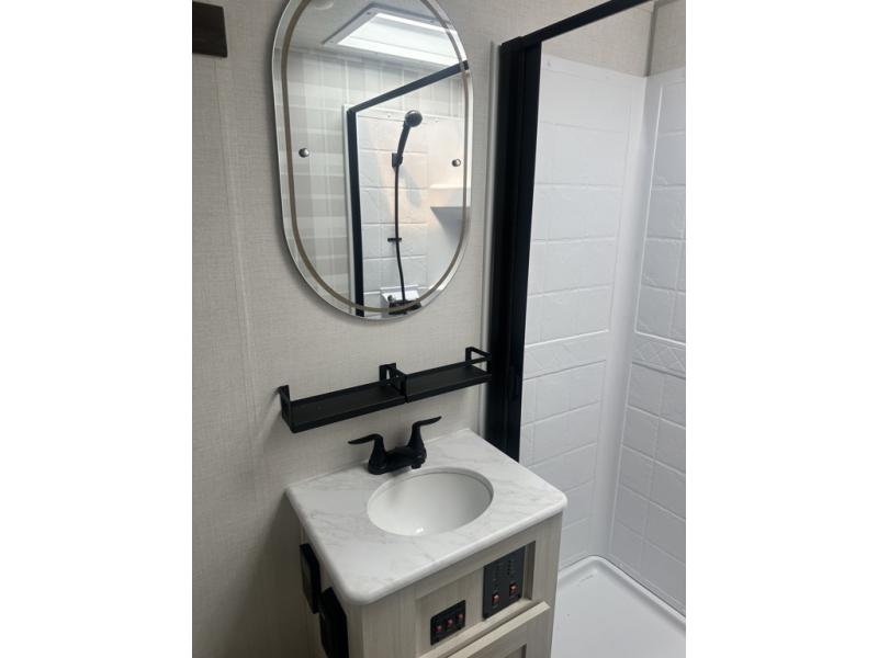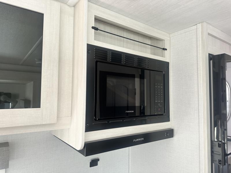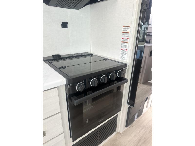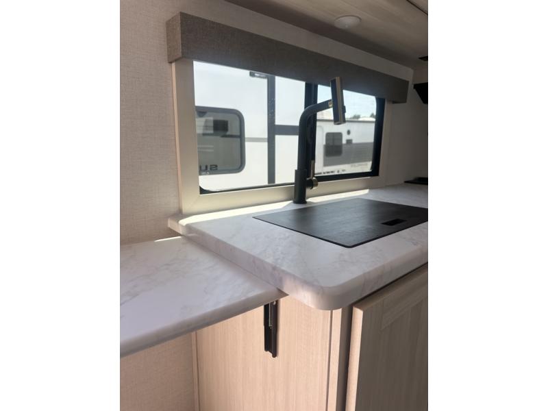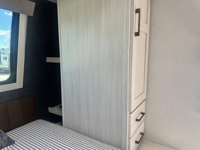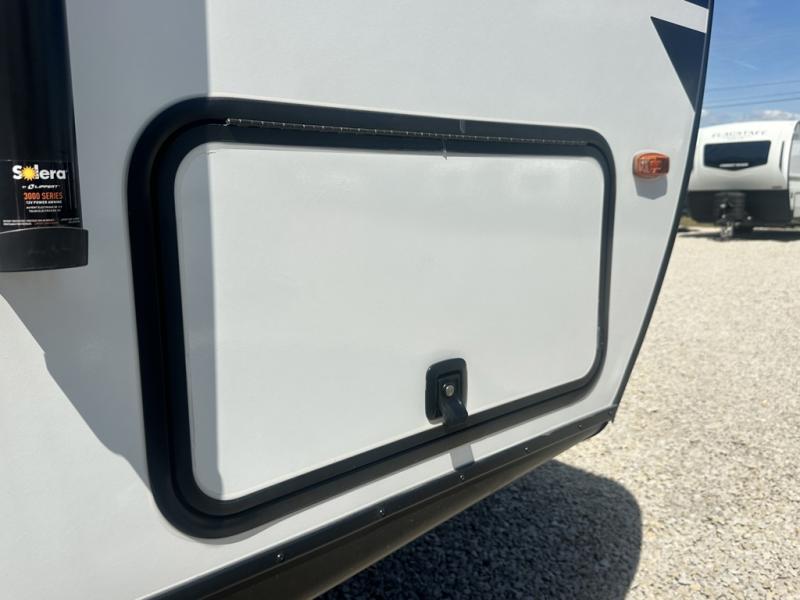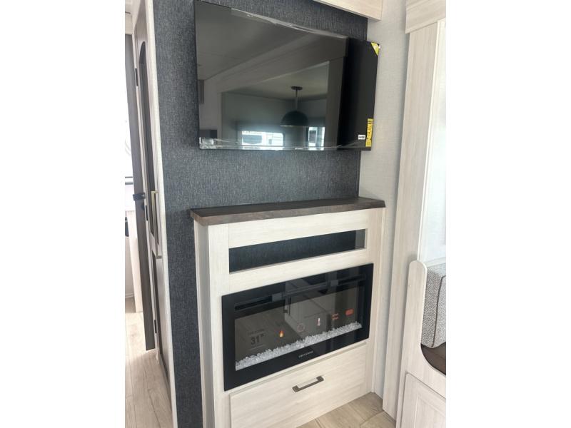 Whether you're camping with friends or family, you'll love the space and comfort found in this travel trailer. The outside kitchen is packed with features, such as a gas griddle, sink, refrigerator, and a shelf, plus there is a 21' electric awning for shade. Head inside to relax on the EZ- out sofa, or play a game at the booth dinette. You will also love the HD TV for your favorite shows at night. This model includes a full rear bath with a linen closet for clean towels and an upgraded slow-close shower door.