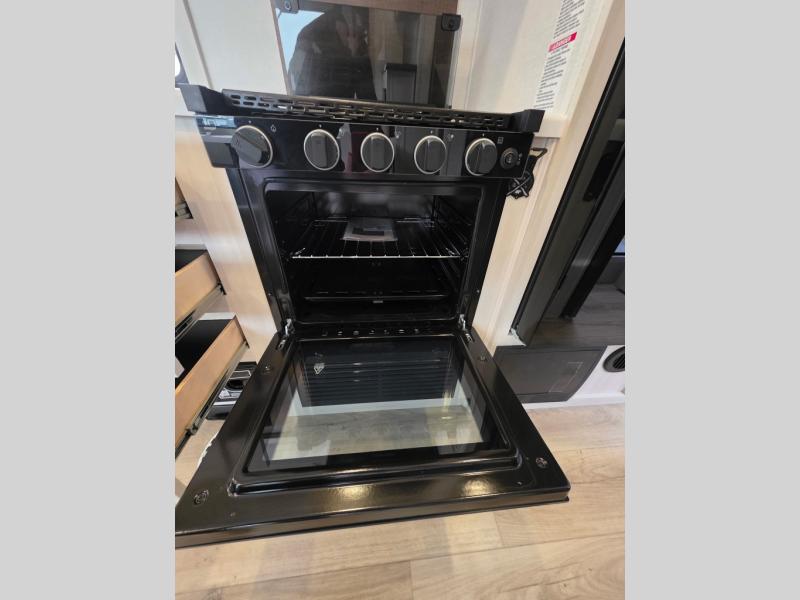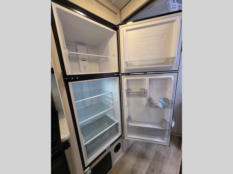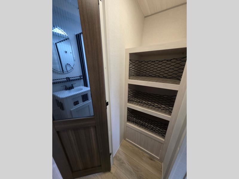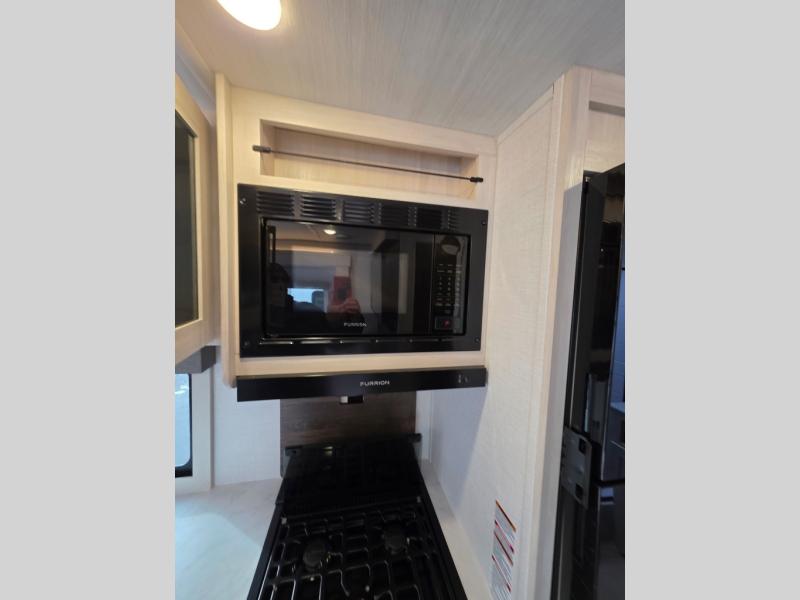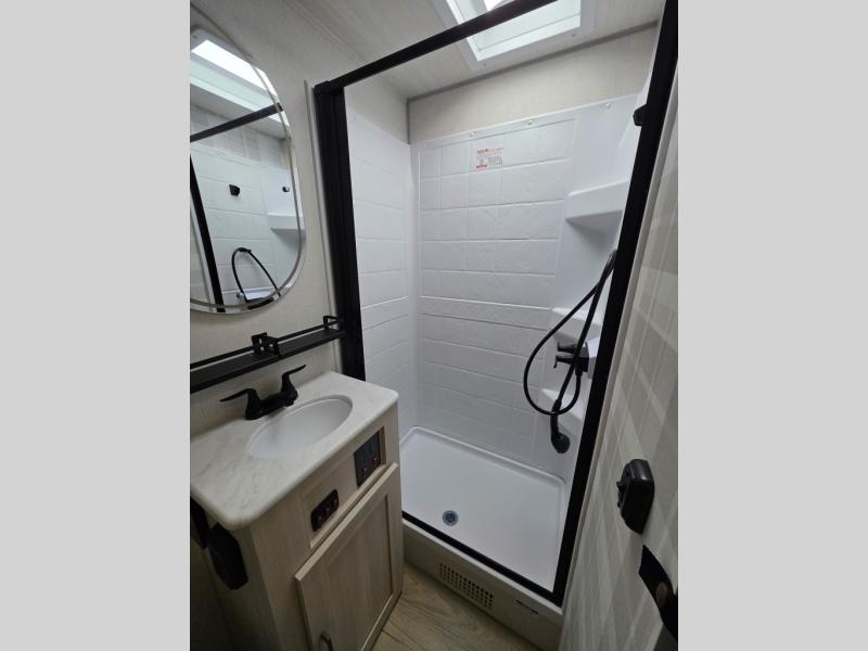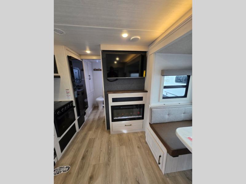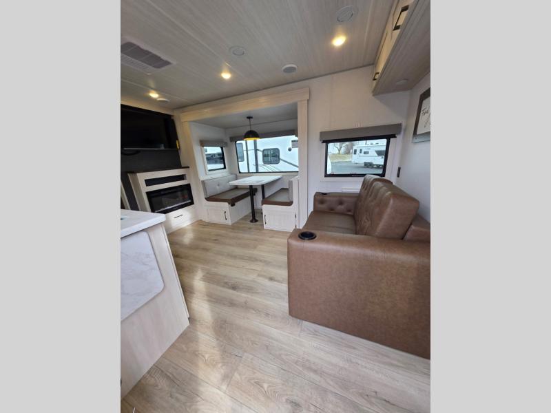 Whether you're camping with friends or family, you'll love the space and comfort found in this travel trailer. The outside kitchen is packed with features, such as a gas griddle, sink, refrigerator, and a shelf, plus there is a 21' electric awning for shade. Head inside to relax on the EZ- out sofa, or play a game at the booth dinette. You will also love the HD TV for your favorite shows at night. This model includes a full rear bath with a linen closet for clean towels and an upgraded slow-close shower door.