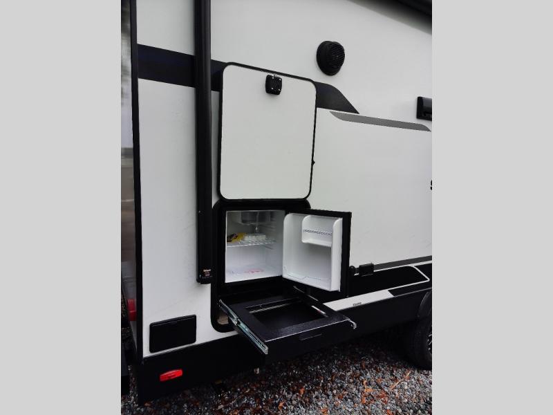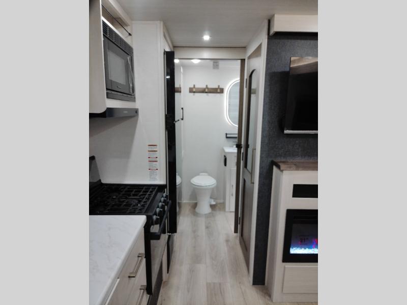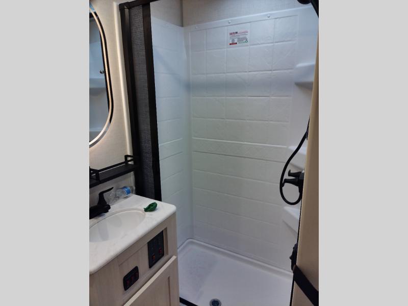Whether you're camping with friends or family, you'll love the space and comfort found in this travel trailer. The outside kitchen is packed with features, such as a gas griddle, sink, refrigerator, and a shelf, plus there is a 21' electric awning for shade. Head inside to relax on the EZ- out sofa, or play a game at the booth dinette. You will also love the HD TV for your favorite shows at night. This model includes a full rear bath with a linen closet for clean towels and an upgraded slow-close shower door.