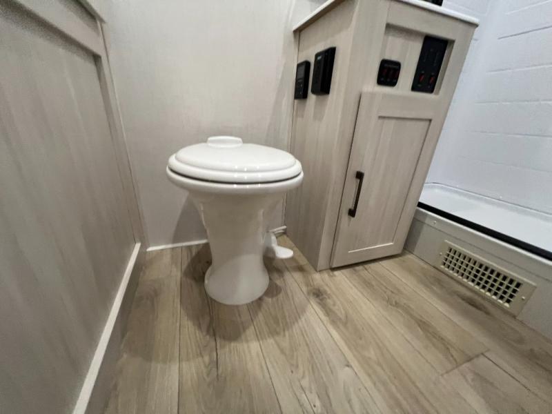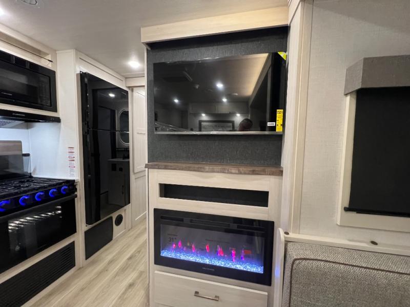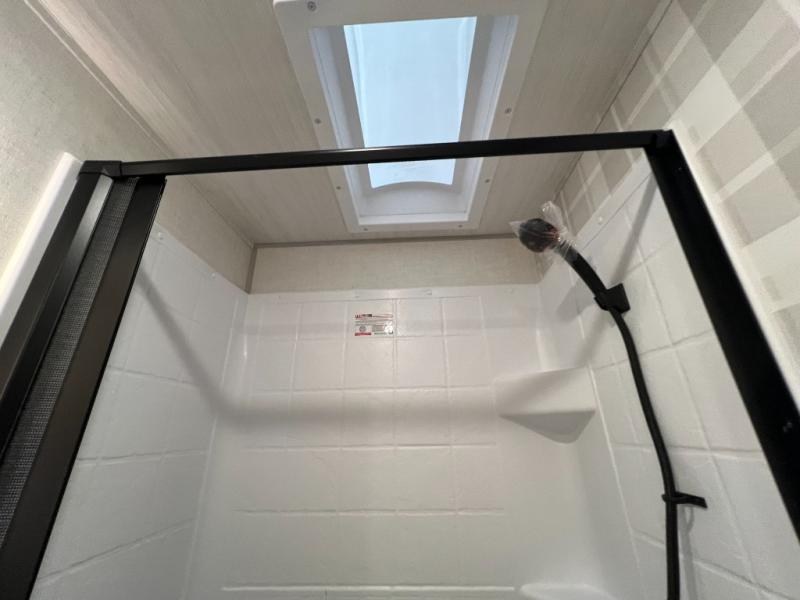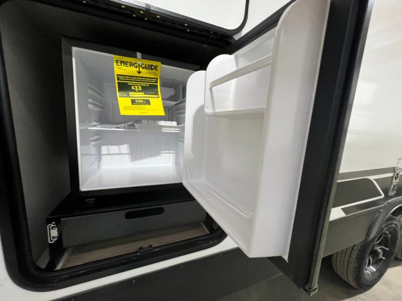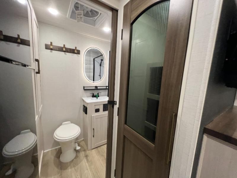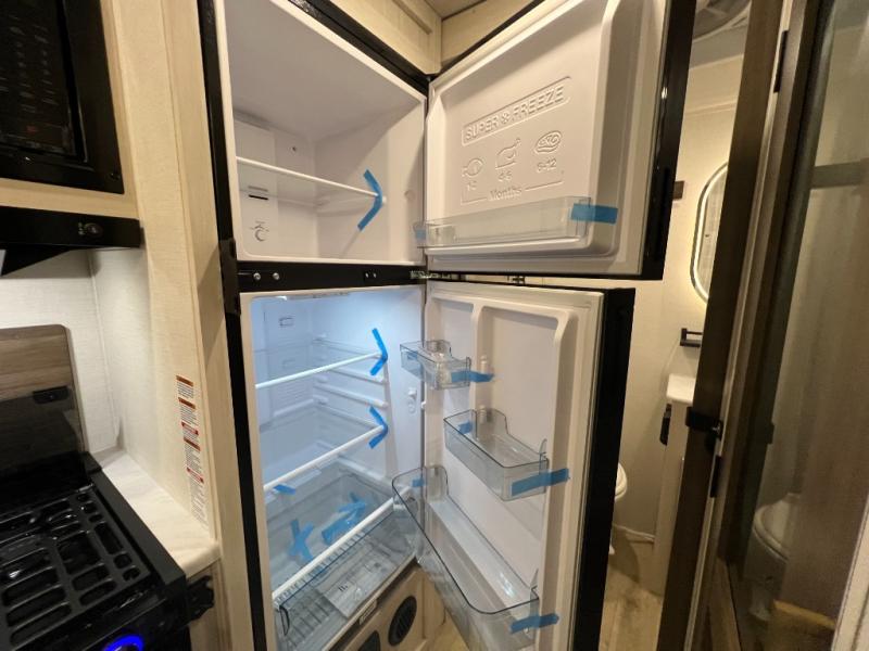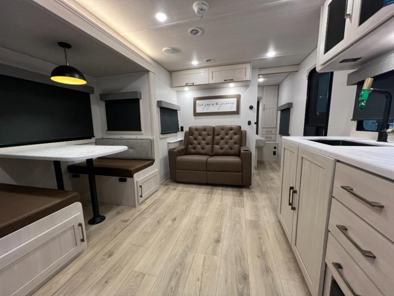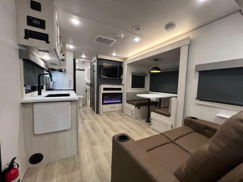 Whether you're camping with friends or family, you'll love the space and comfort found in this travel trailer. The outside kitchen is packed with features, such as a gas griddle, sink, refrigerator, and a shelf, plus there is a 21' electric awning for shade. Head inside to relax on the EZ- out sofa, or play a game at the booth dinette. You will also love the HD TV for your favorite shows at night. This model includes a full rear bath with a linen closet for clean towels and an upgraded slow-close shower door.