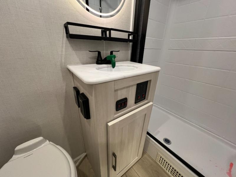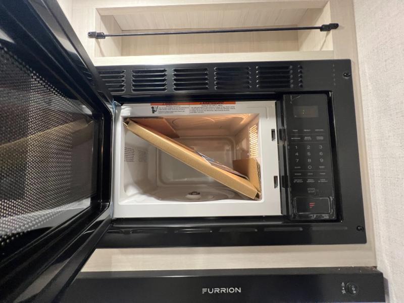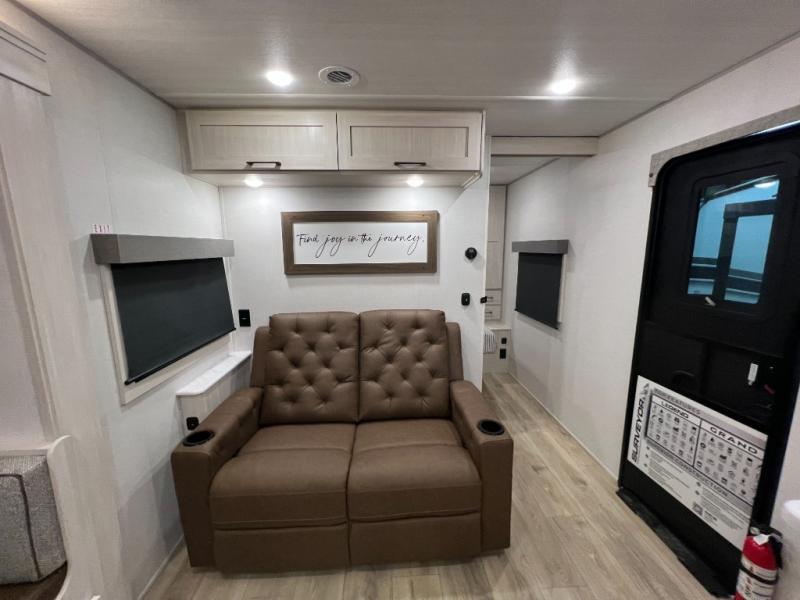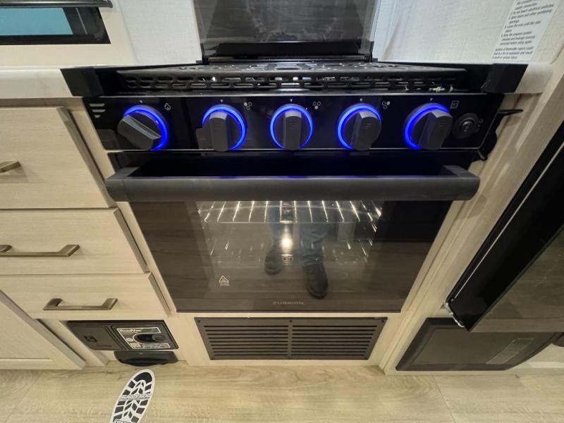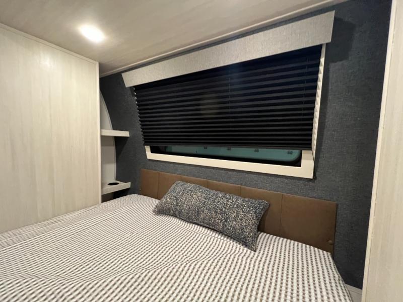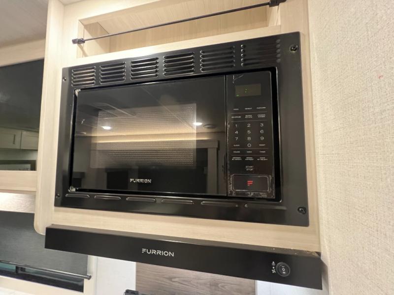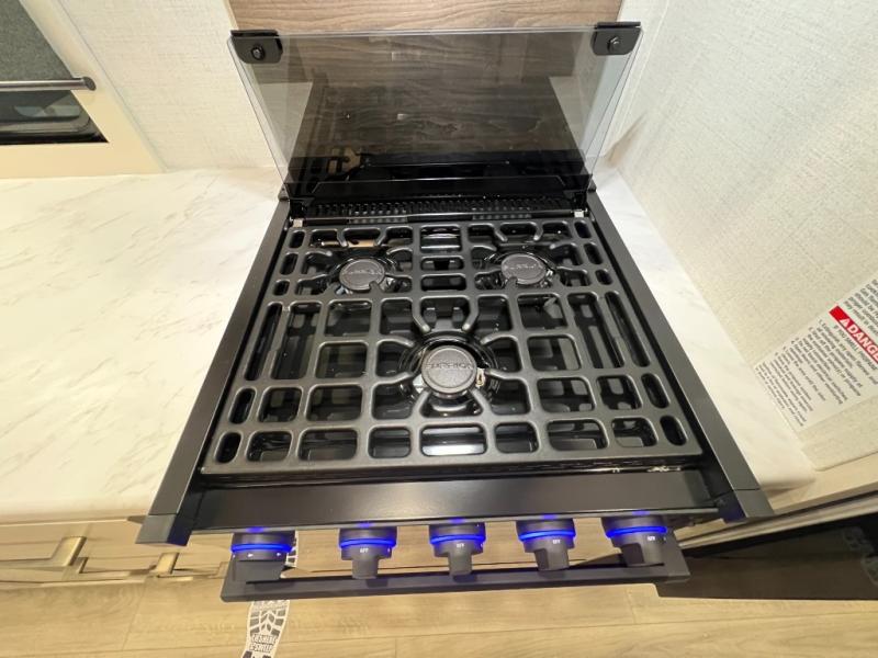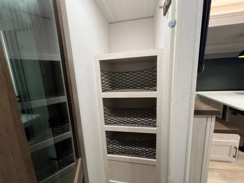 Whether you're camping with friends or family, you'll love the space and comfort found in this travel trailer. The outside kitchen is packed with features, such as a gas griddle, sink, refrigerator, and a shelf, plus there is a 21' electric awning for shade. Head inside to relax on the EZ- out sofa, or play a game at the booth dinette. You will also love the HD TV for your favorite shows at night. This model includes a full rear bath with a linen closet for clean towels and an upgraded slow-close shower door.