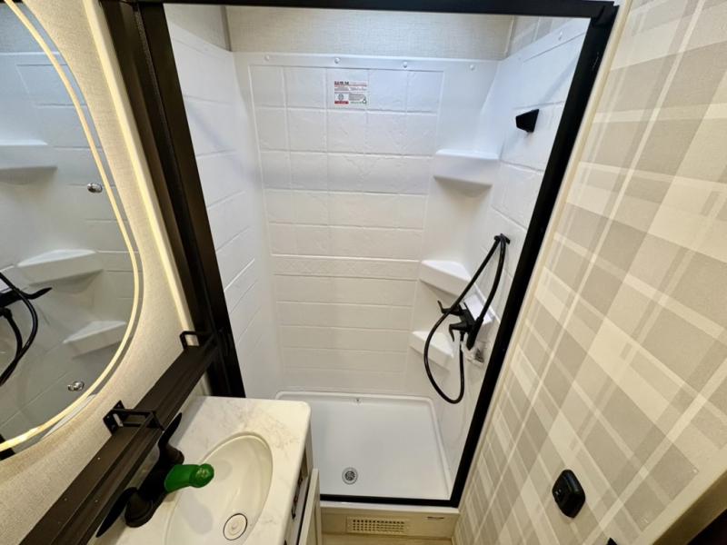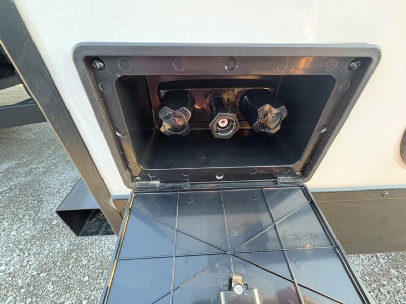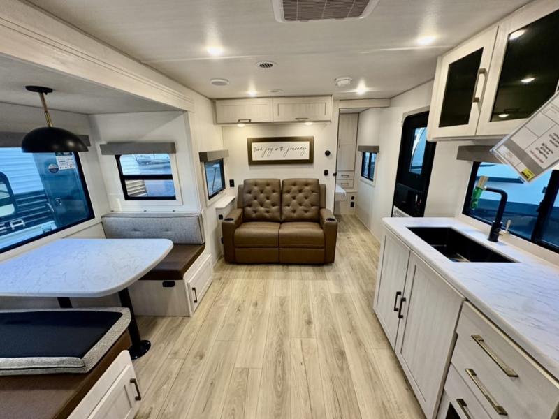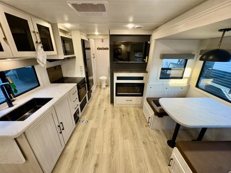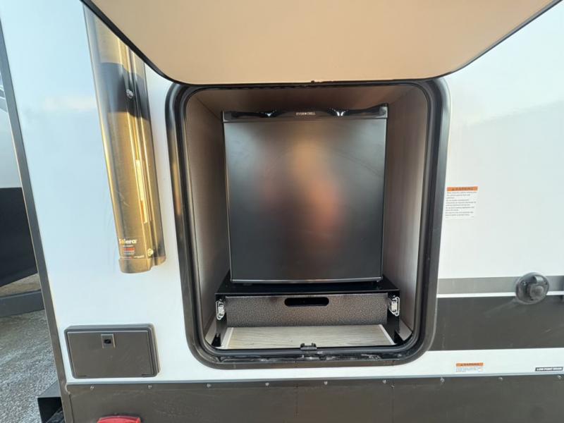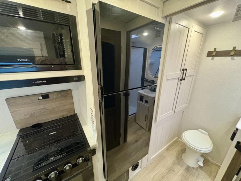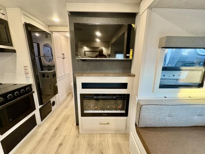 Whether you're camping with friends or family, you'll love the space and comfort found in this travel trailer. The outside kitchen is packed with features, such as a gas griddle, sink, refrigerator, and a shelf, plus there is a 21' electric awning for shade. Head inside to relax on the EZ- out sofa, or play a game at the booth dinette. You will also love the HD TV for your favorite shows at night. This model includes a full rear bath with a linen closet for clean towels and an upgraded slow-close shower door.