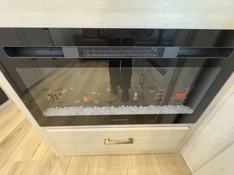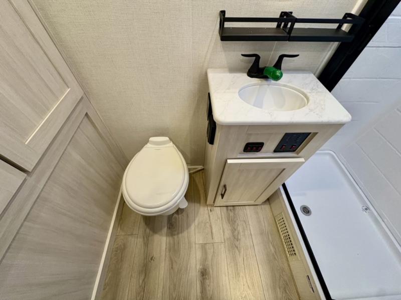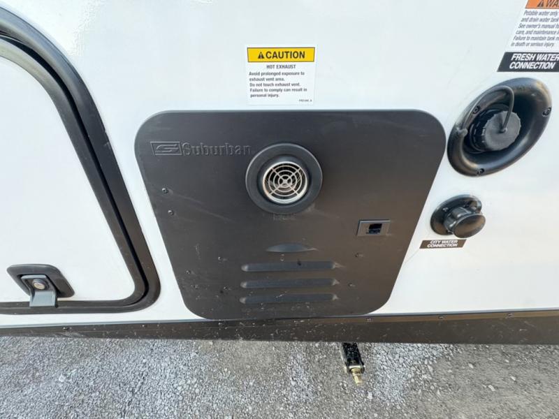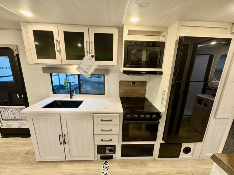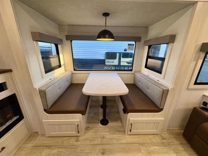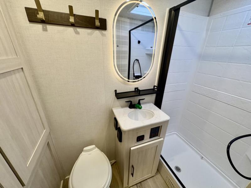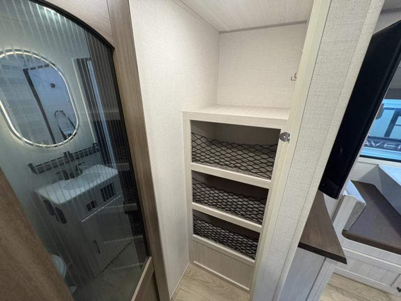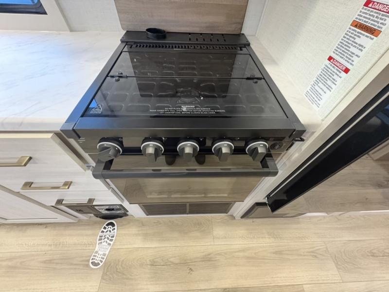 Whether you're camping with friends or family, you'll love the space and comfort found in this travel trailer. The outside kitchen is packed with features, such as a gas griddle, sink, refrigerator, and a shelf, plus there is a 21' electric awning for shade. Head inside to relax on the EZ- out sofa, or play a game at the booth dinette. You will also love the HD TV for your favorite shows at night. This model includes a full rear bath with a linen closet for clean towels and an upgraded slow-close shower door.