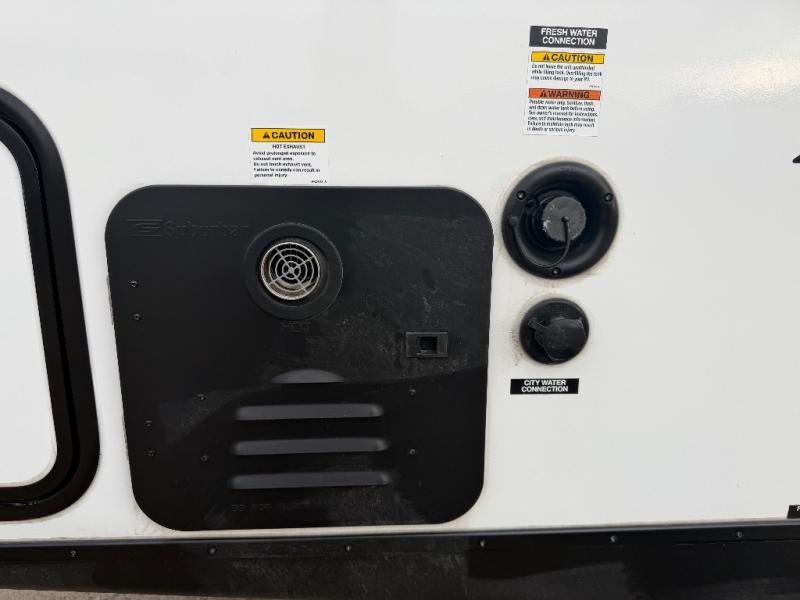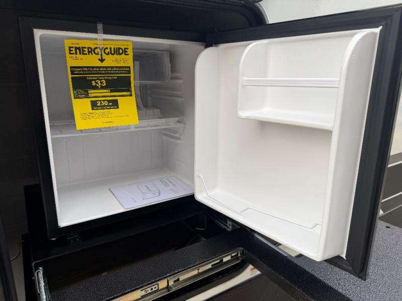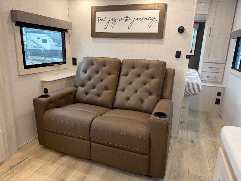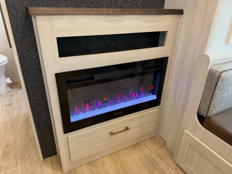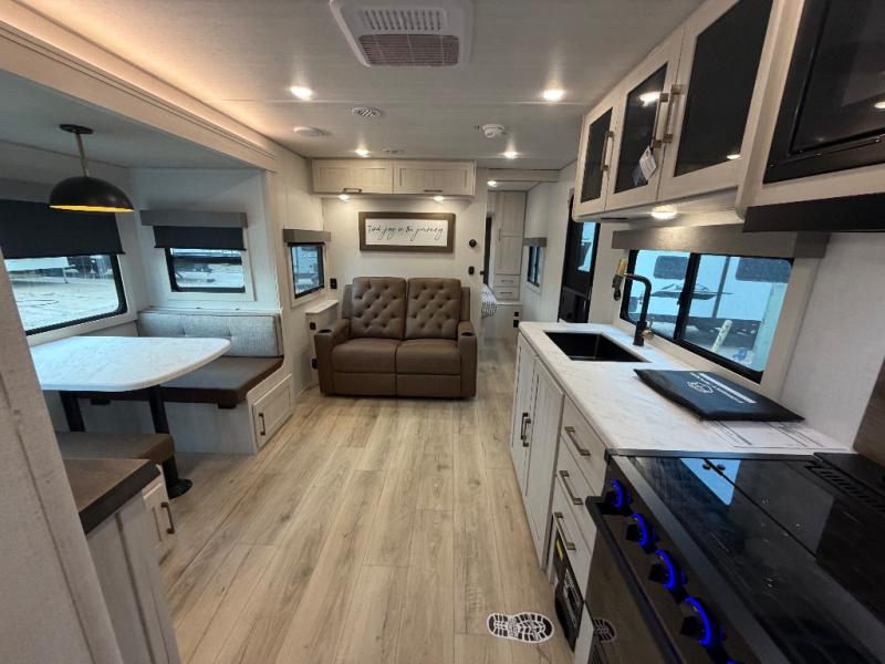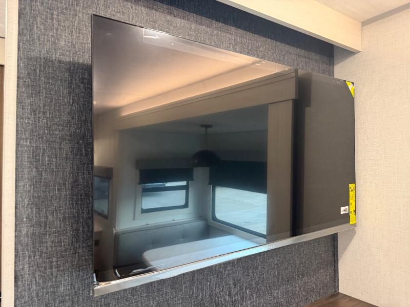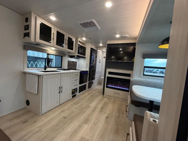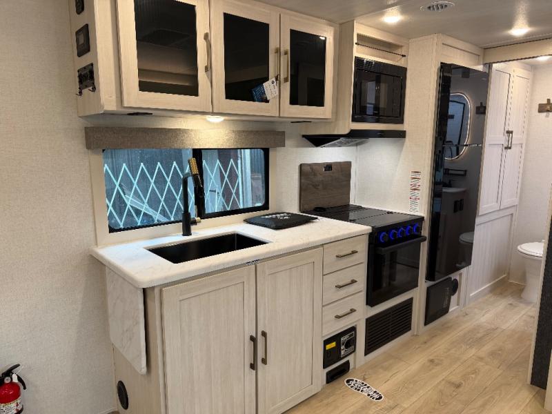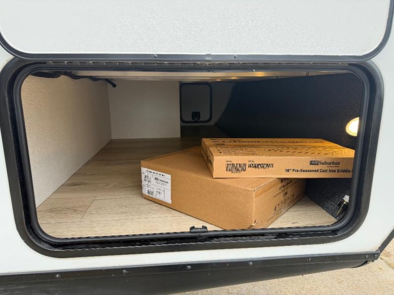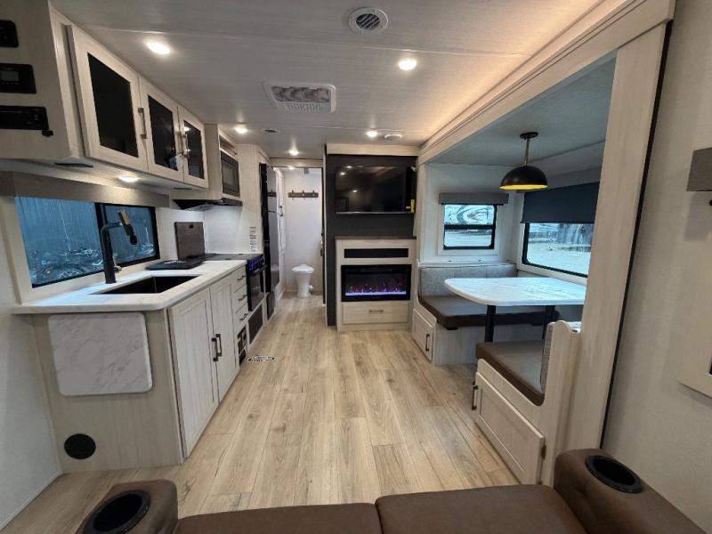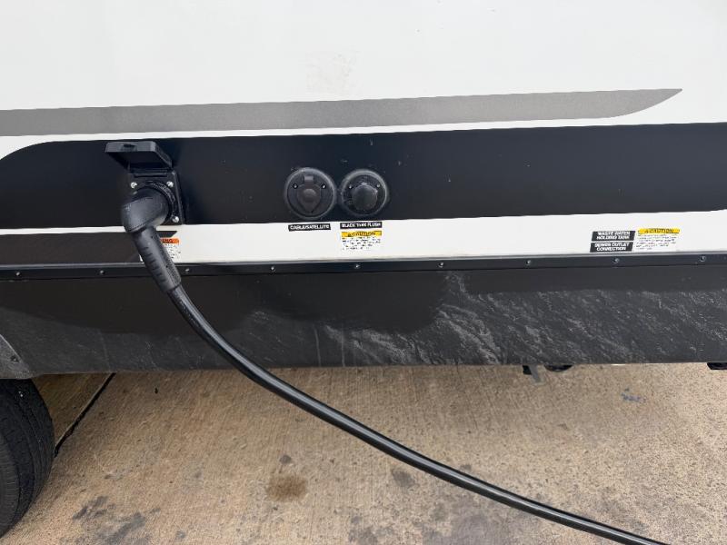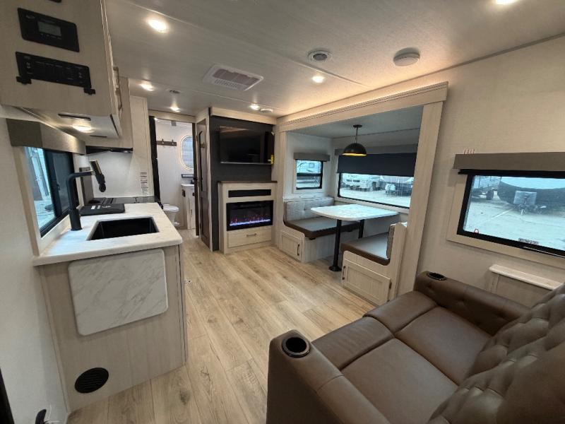 Whether you're camping with friends or family, you'll love the space and comfort found in this travel trailer. The outside kitchen is packed with features, such as a gas griddle, sink, refrigerator, and a shelf, plus there is a 21' electric awning for shade. Head inside to relax on the EZ- out sofa, or play a game at the booth dinette. You will also love the HD TV for your favorite shows at night. This model includes a full rear bath with a linen closet for clean towels and an upgraded slow-close shower door.