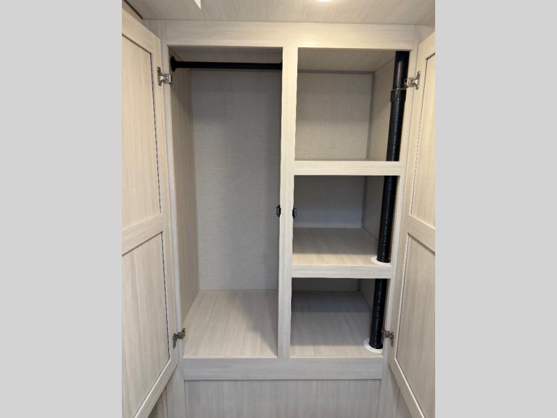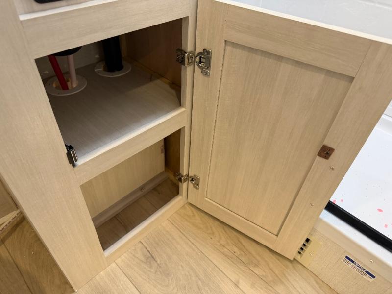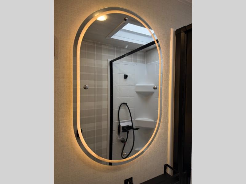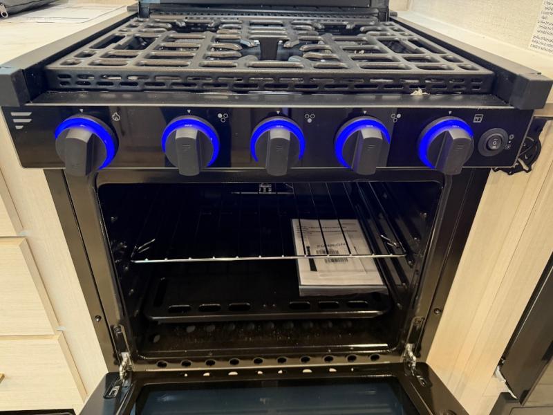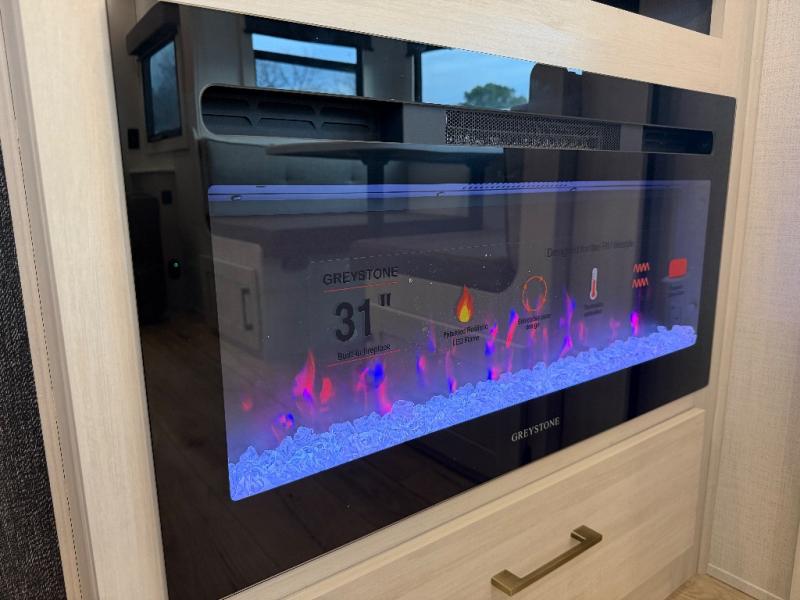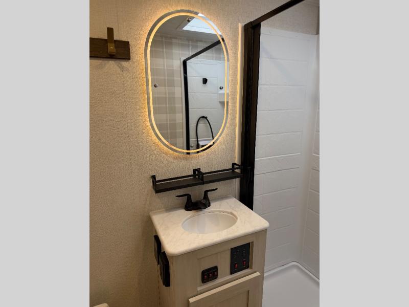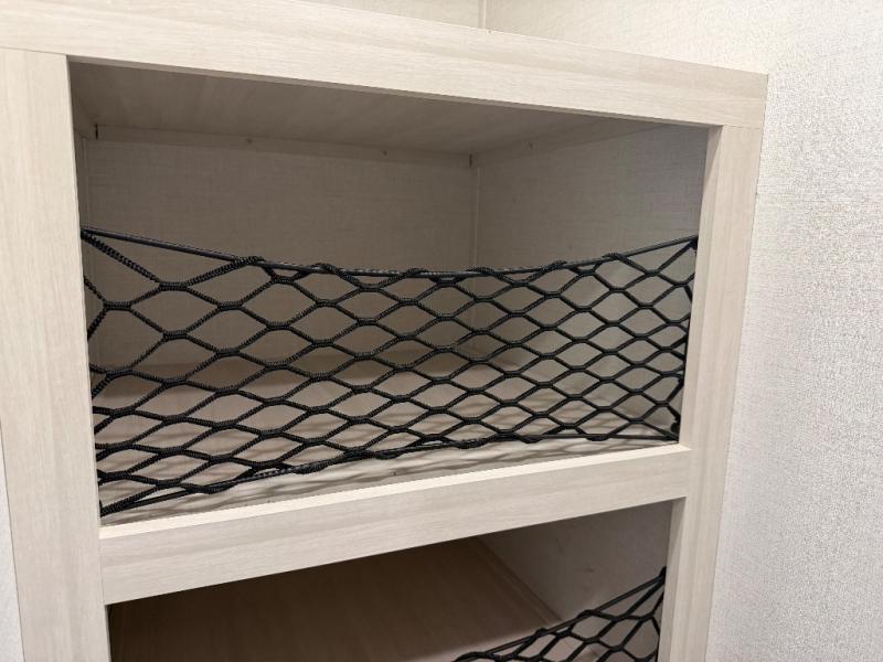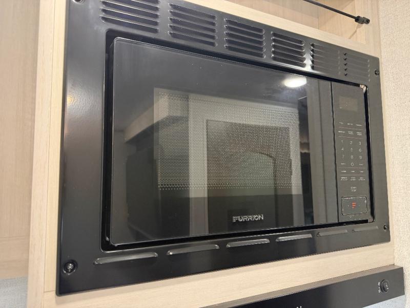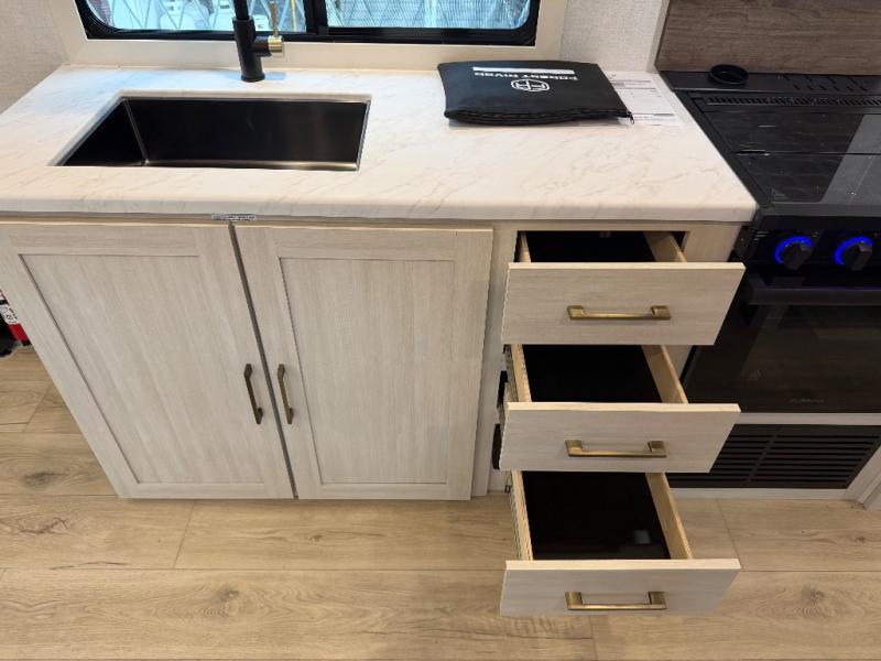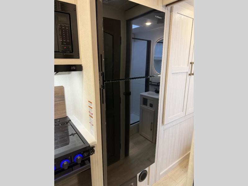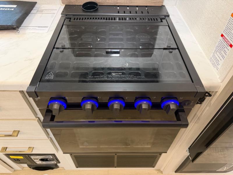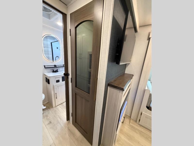 Whether you're camping with friends or family, you'll love the space and comfort found in this travel trailer. The outside kitchen is packed with features, such as a gas griddle, sink, refrigerator, and a shelf, plus there is a 21' electric awning for shade. Head inside to relax on the EZ- out sofa, or play a game at the booth dinette. You will also love the HD TV for your favorite shows at night. This model includes a full rear bath with a linen closet for clean towels and an upgraded slow-close shower door.