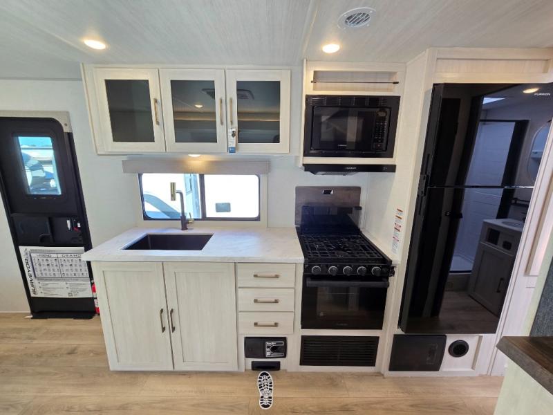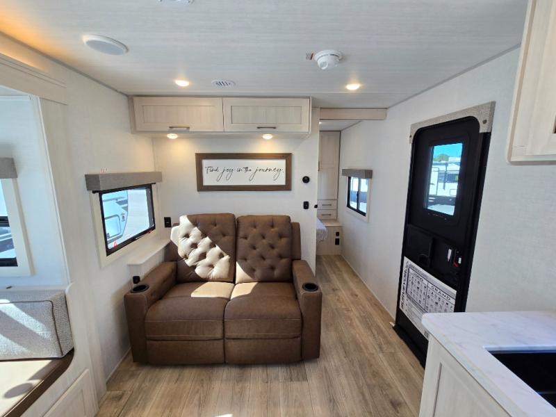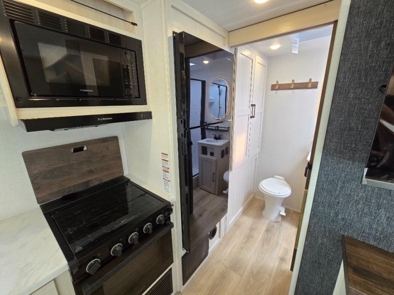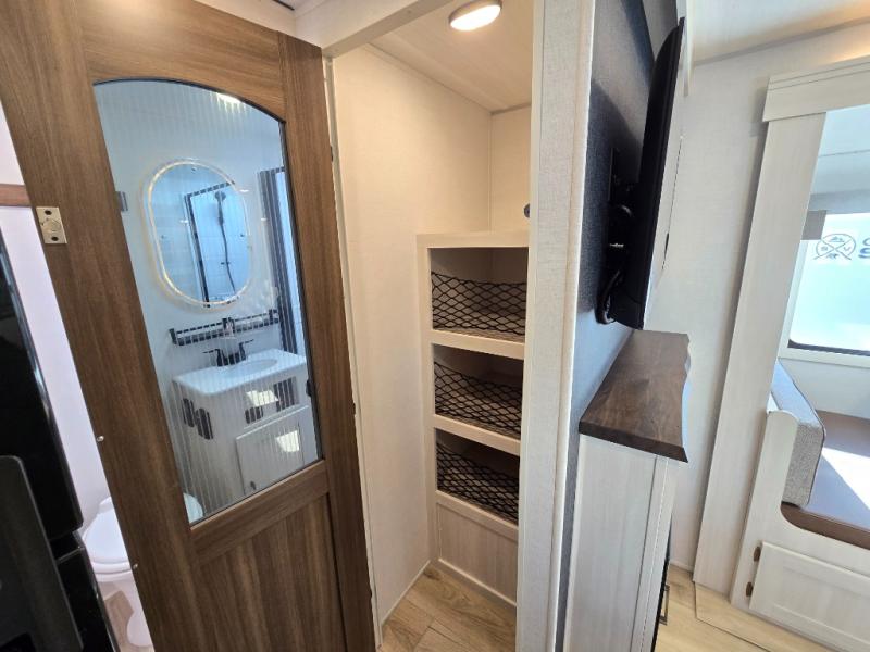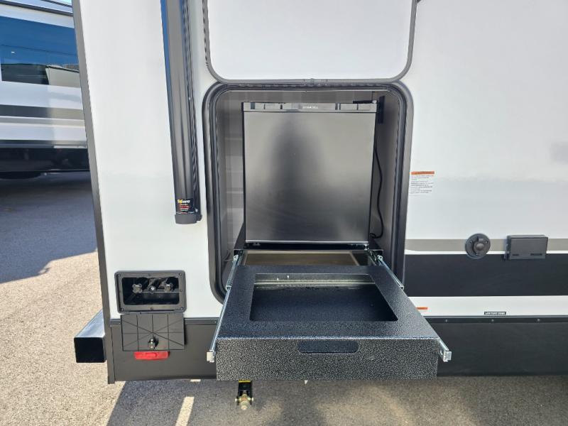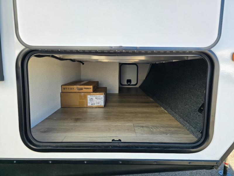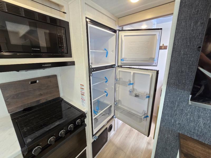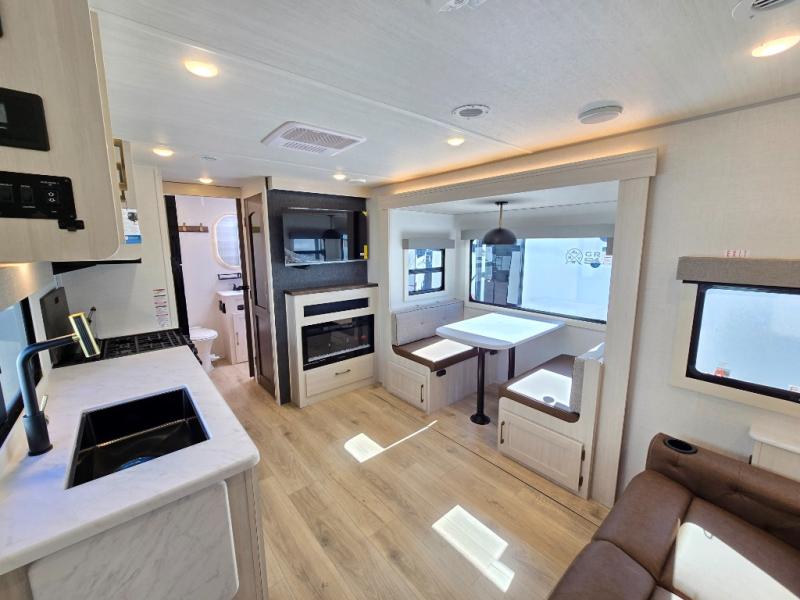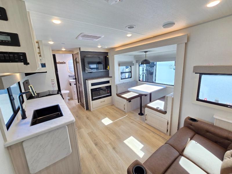Whether you're camping with friends or family, you'll love the space and comfort found in this travel trailer. The outside kitchen is packed with features, such as a gas griddle, sink, refrigerator, and a shelf, plus there is a 21' electric awning for shade. Head inside to relax on the EZ- out sofa, or play a game at the booth dinette. You will also love the HD TV for your favorite shows at night. This model includes a full rear bath with a linen closet for clean towels and an upgraded slow-close shower door.