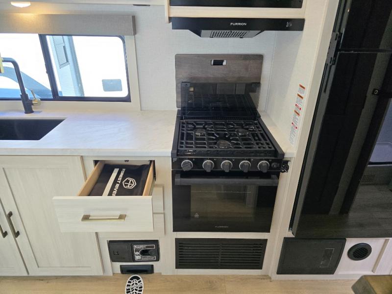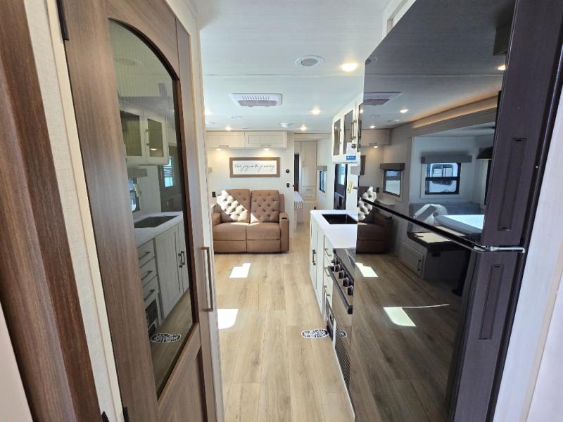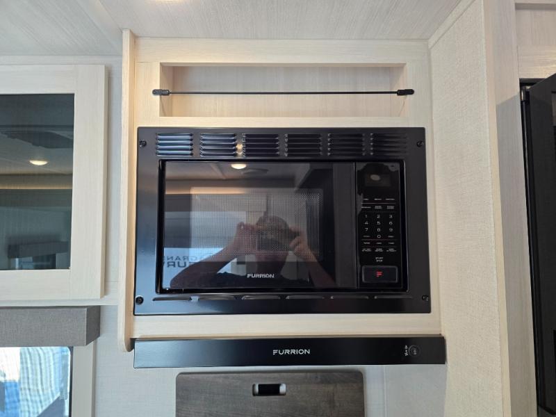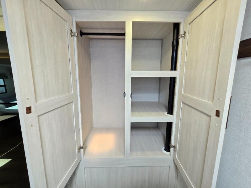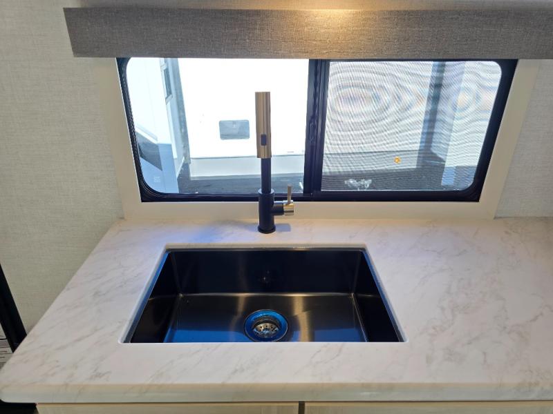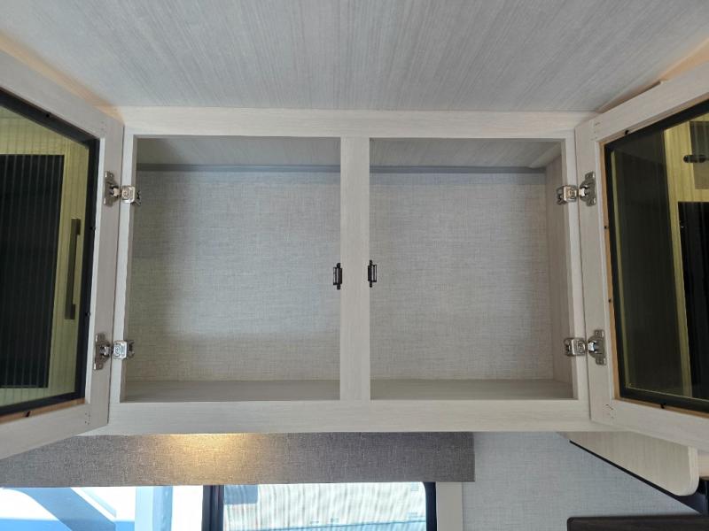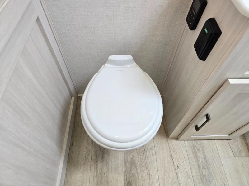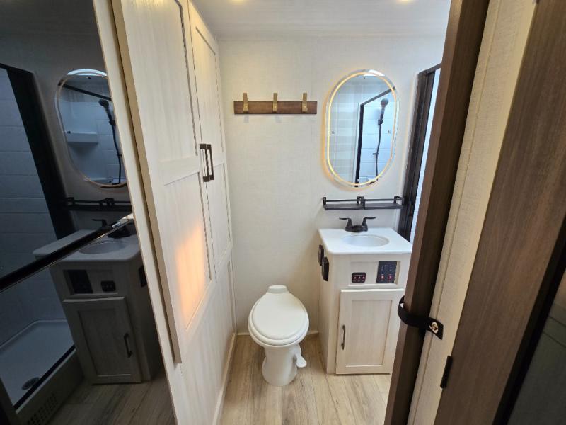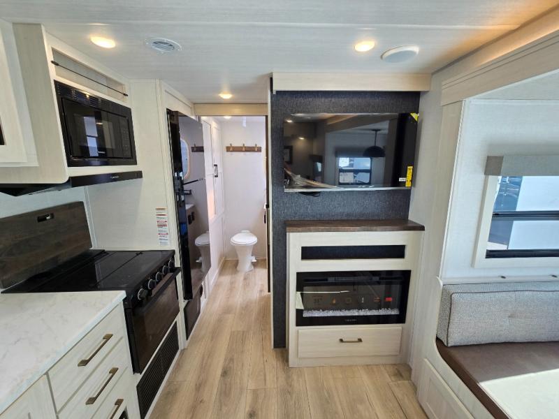 Whether you're camping with friends or family, you'll love the space and comfort found in this travel trailer. The outside kitchen is packed with features, such as a gas griddle, sink, refrigerator, and a shelf, plus there is a 21' electric awning for shade. Head inside to relax on the EZ- out sofa, or play a game at the booth dinette. You will also love the HD TV for your favorite shows at night. This model includes a full rear bath with a linen closet for clean towels and an upgraded slow-close shower door.