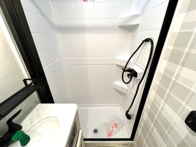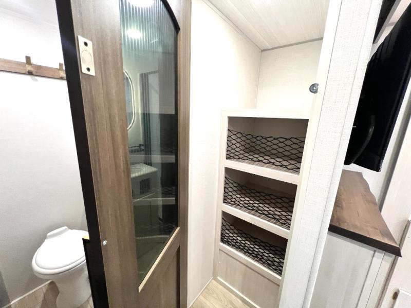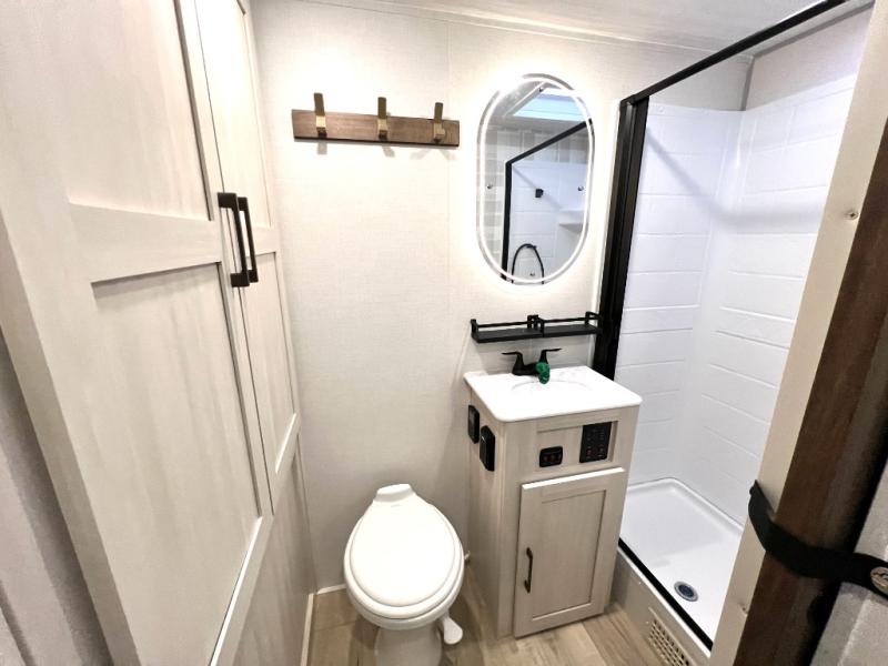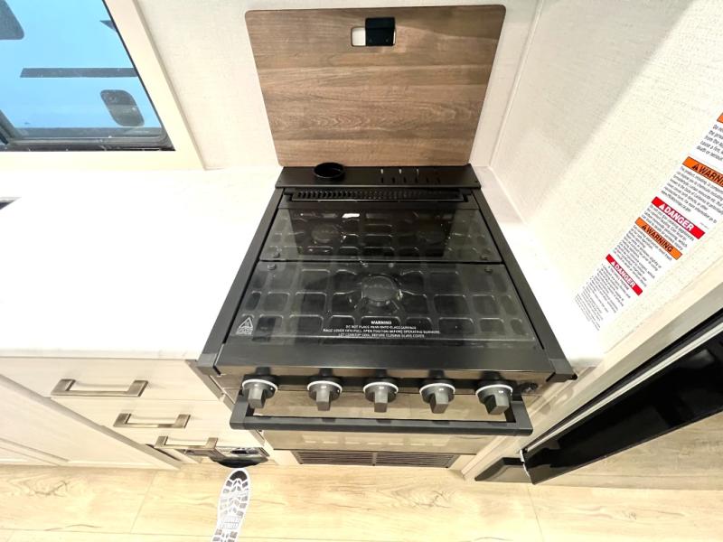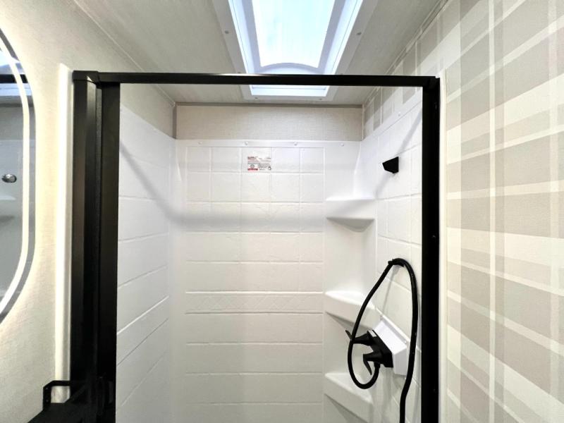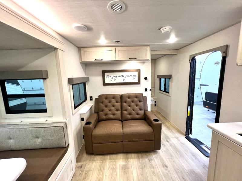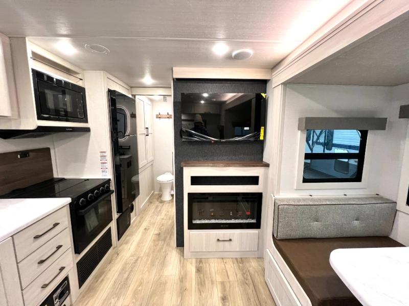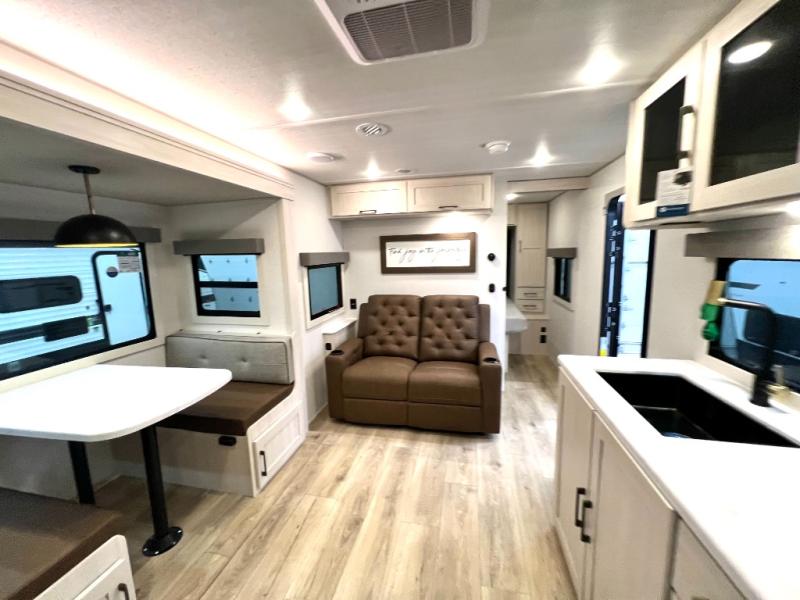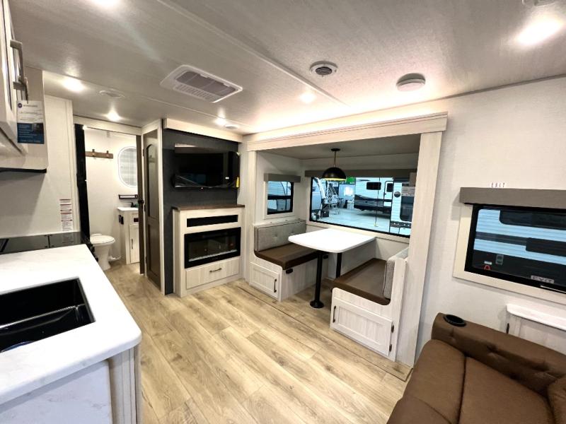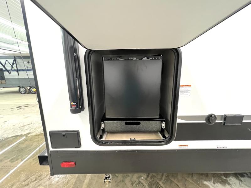 Whether you're camping with friends or family, you'll love the space and comfort found in this travel trailer. The outside kitchen is packed with features, such as a gas griddle, sink, refrigerator, and a shelf, plus there is a 21' electric awning for shade. Head inside to relax on the EZ- out sofa, or play a game at the booth dinette. You will also love the HD TV for your favorite shows at night. This model includes a full rear bath with a linen closet for clean towels and an upgraded slow-close shower door.