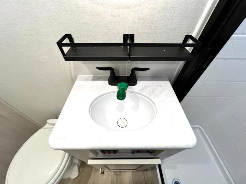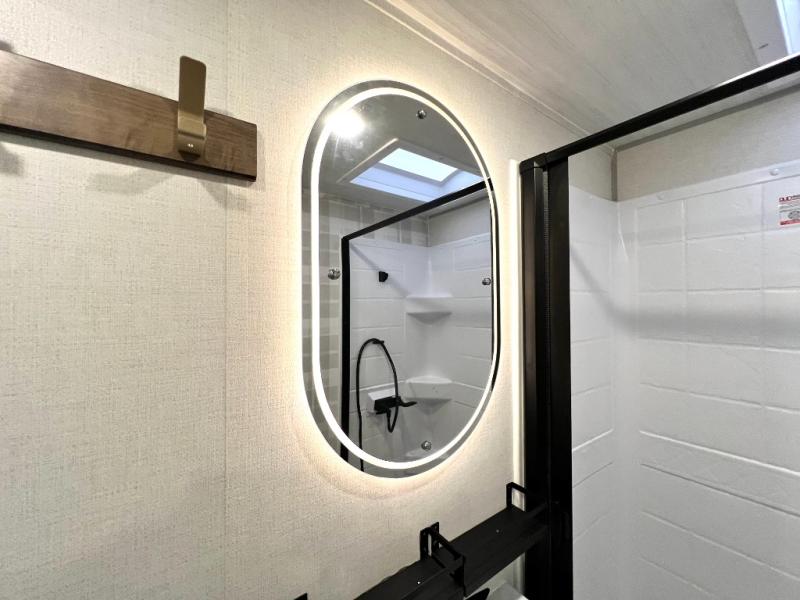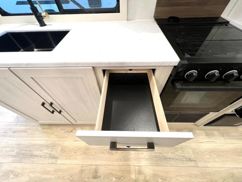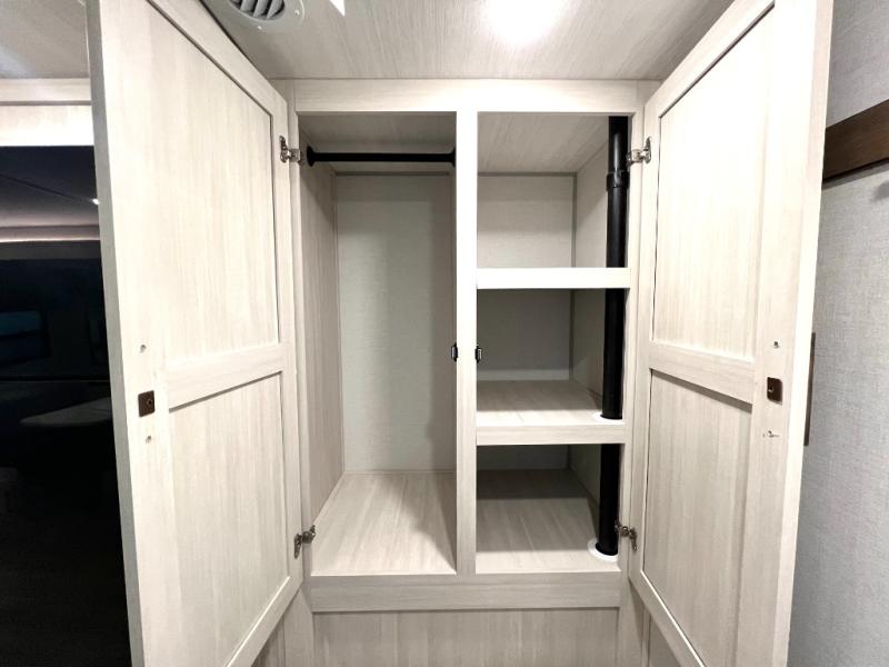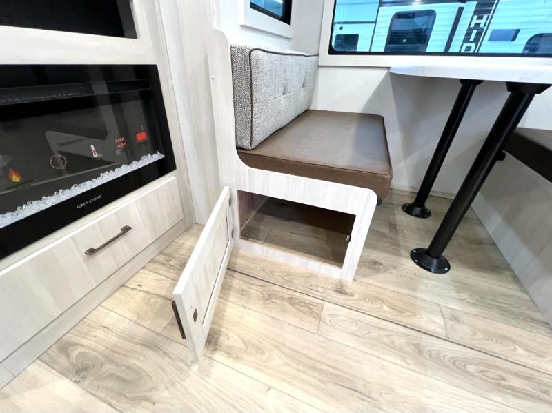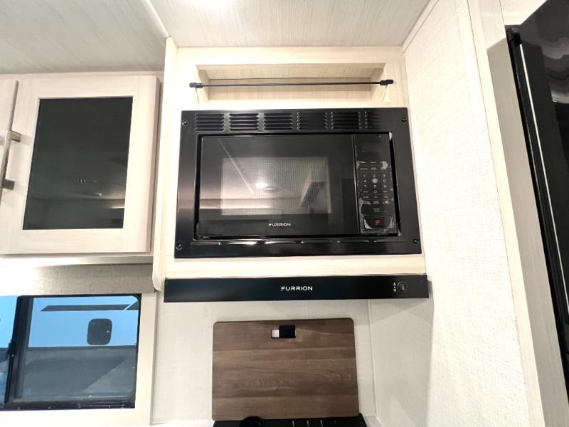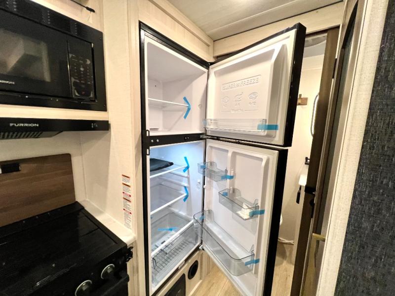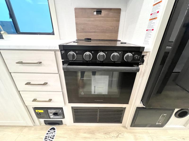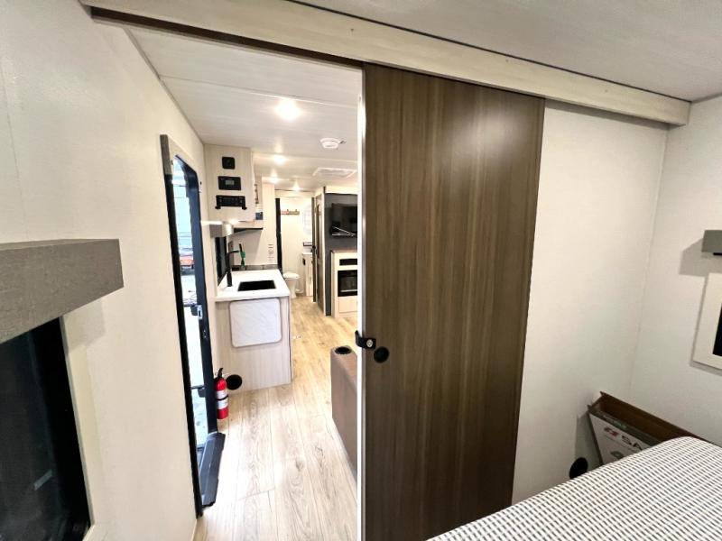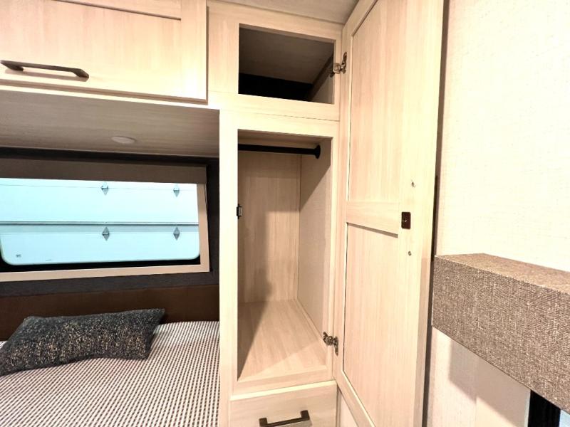 Whether you're camping with friends or family, you'll love the space and comfort found in this travel trailer. The outside kitchen is packed with features, such as a gas griddle, sink, refrigerator, and a shelf, plus there is a 21' electric awning for shade. Head inside to relax on the EZ- out sofa, or play a game at the booth dinette. You will also love the HD TV for your favorite shows at night. This model includes a full rear bath with a linen closet for clean towels and an upgraded slow-close shower door.