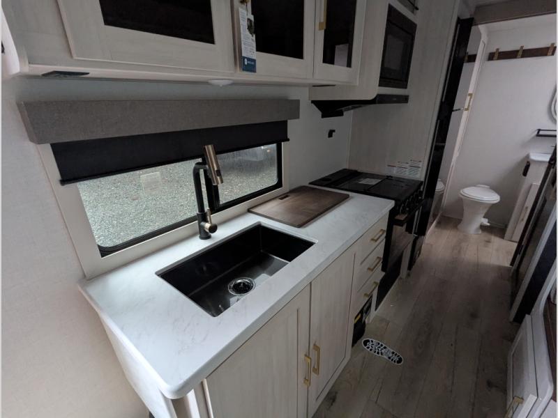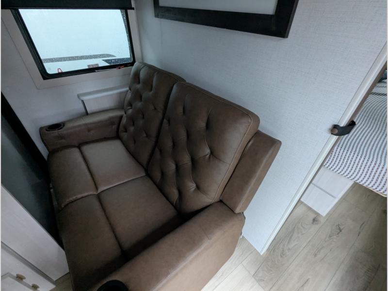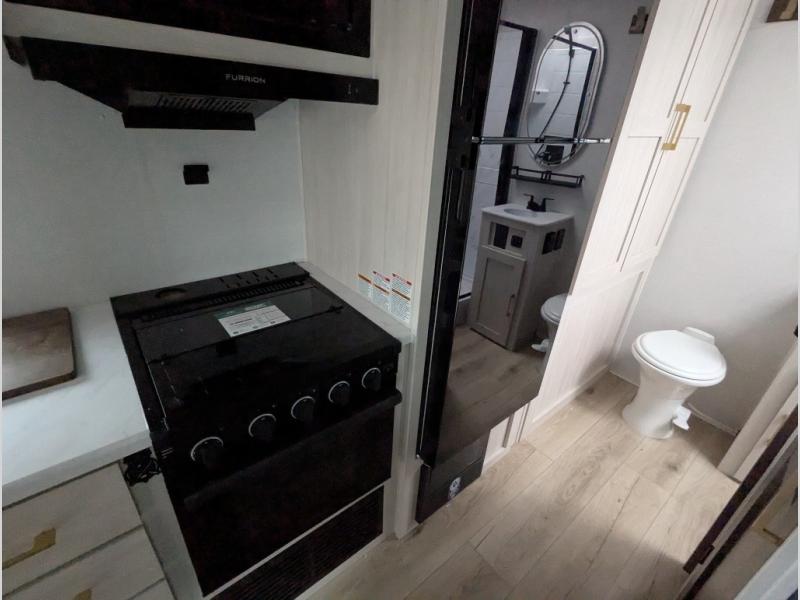 Whether you're camping with friends or family, you'll love the space and comfort found in this travel trailer. The outside kitchen is packed with features, such as a gas griddle, sink, refrigerator, and a shelf, plus there is a 21' electric awning for shade. Head inside to relax on the EZ- out sofa, or play a game at the booth dinette. You will also love the HD TV for your favorite shows at night. This model includes a full rear bath with a linen closet for clean towels and an upgraded slow-close shower door.