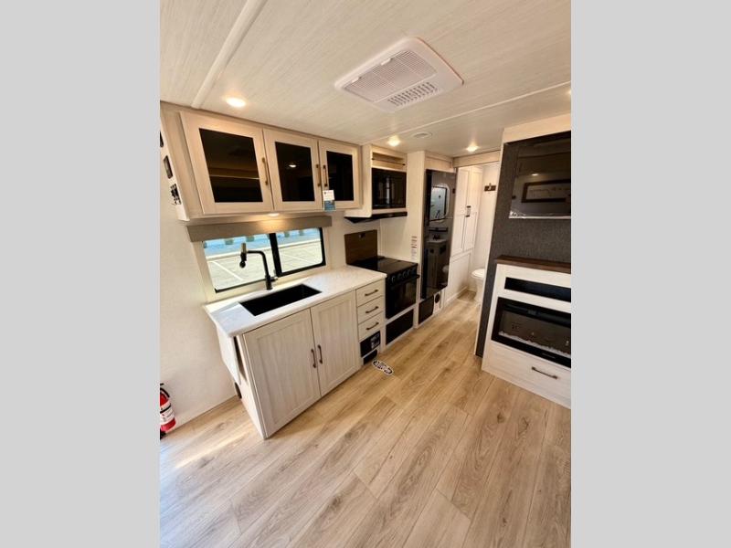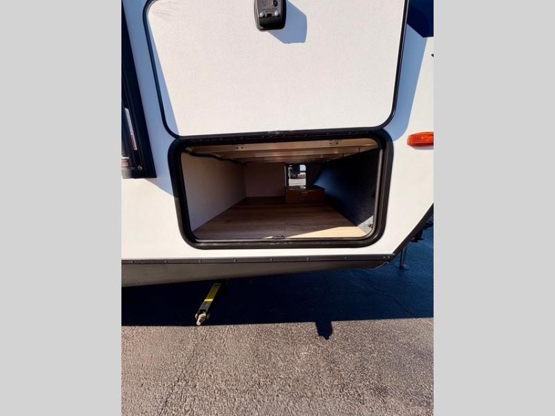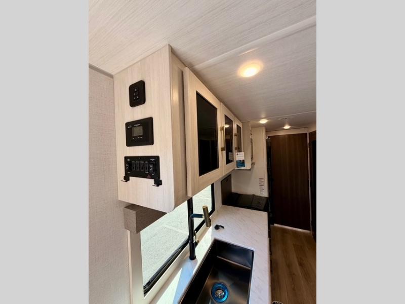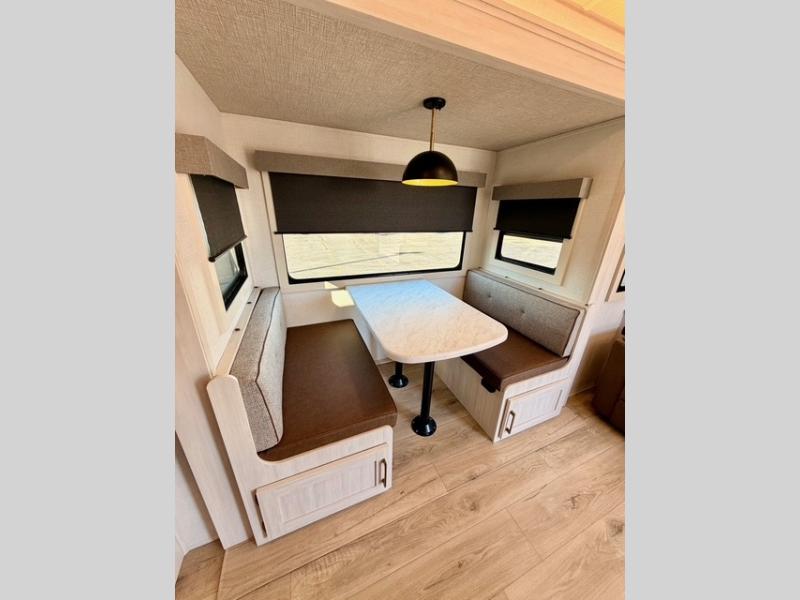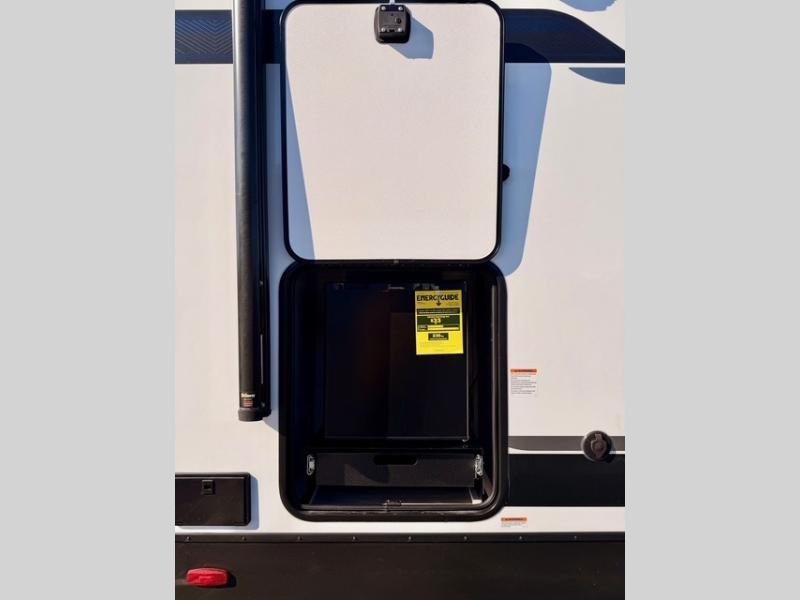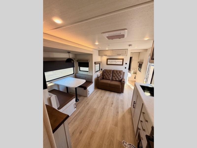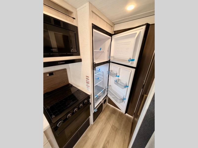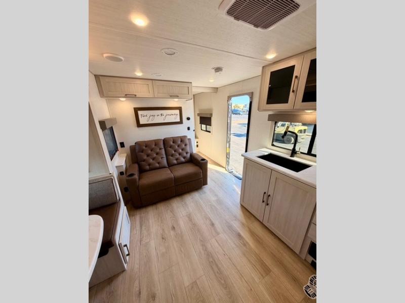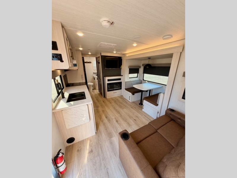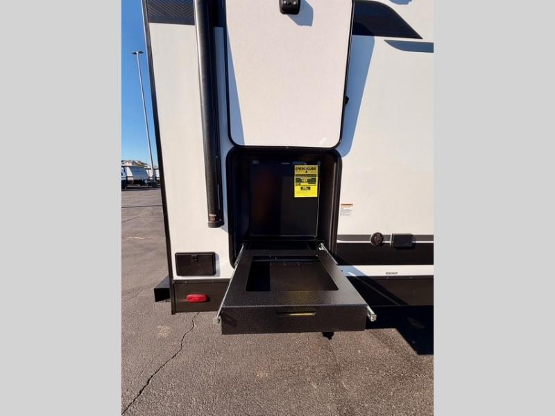 Whether you're camping with friends or family, you'll love the space and comfort found in this travel trailer. The outside kitchen is packed with features, such as a gas griddle, sink, refrigerator, and a shelf, plus there is a 21' electric awning for shade. Head inside to relax on the EZ- out sofa, or play a game at the booth dinette. You will also love the HD TV for your favorite shows at night. This model includes a full rear bath with a linen closet for clean towels and an upgraded slow-close shower door.