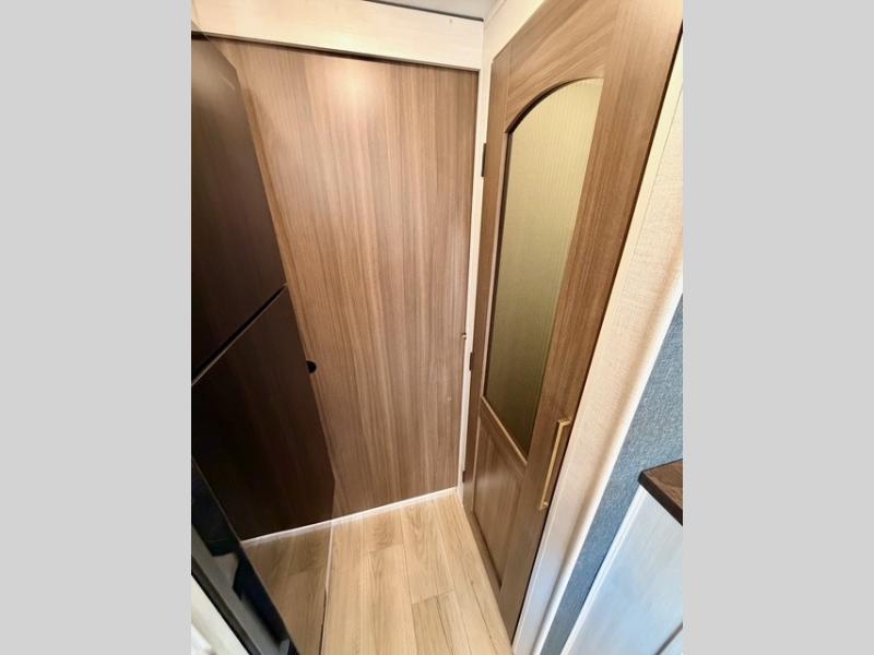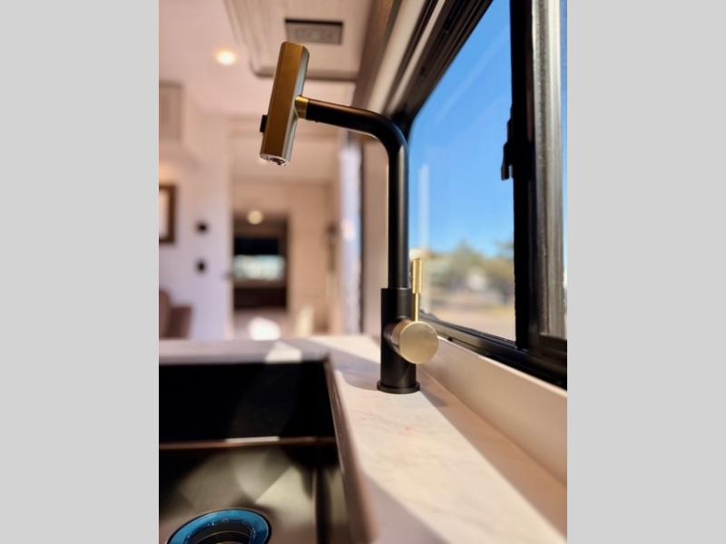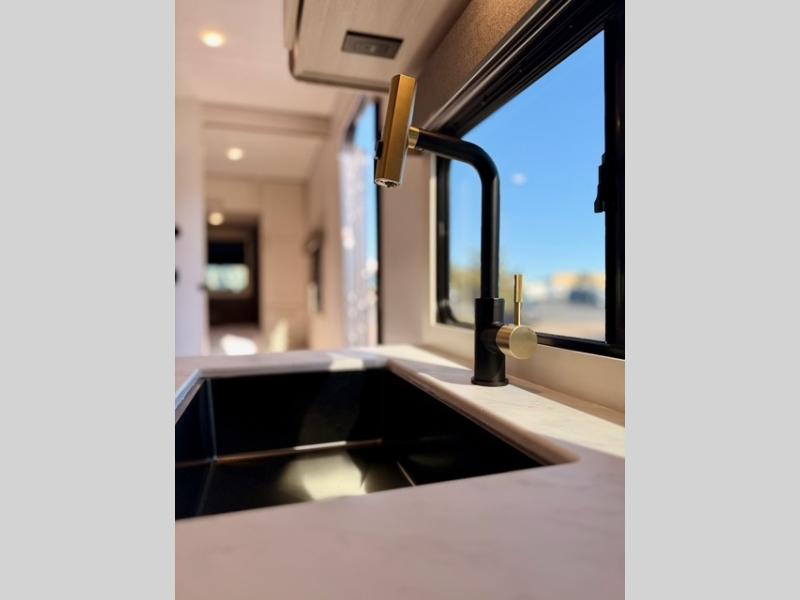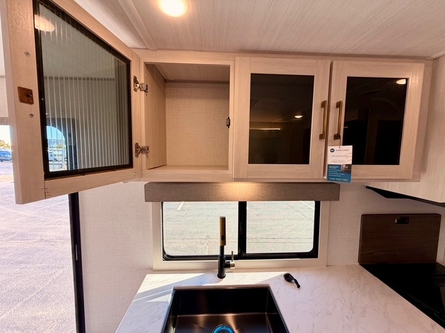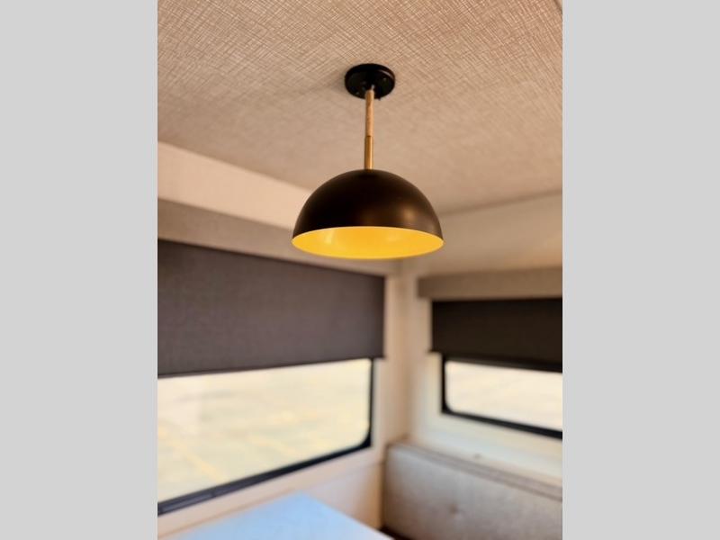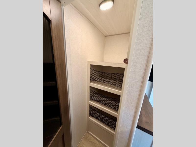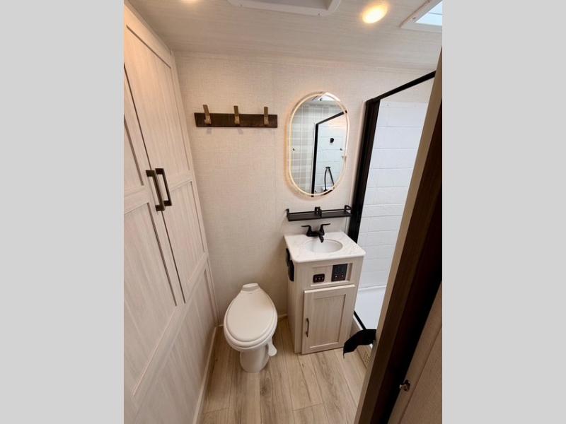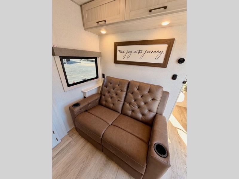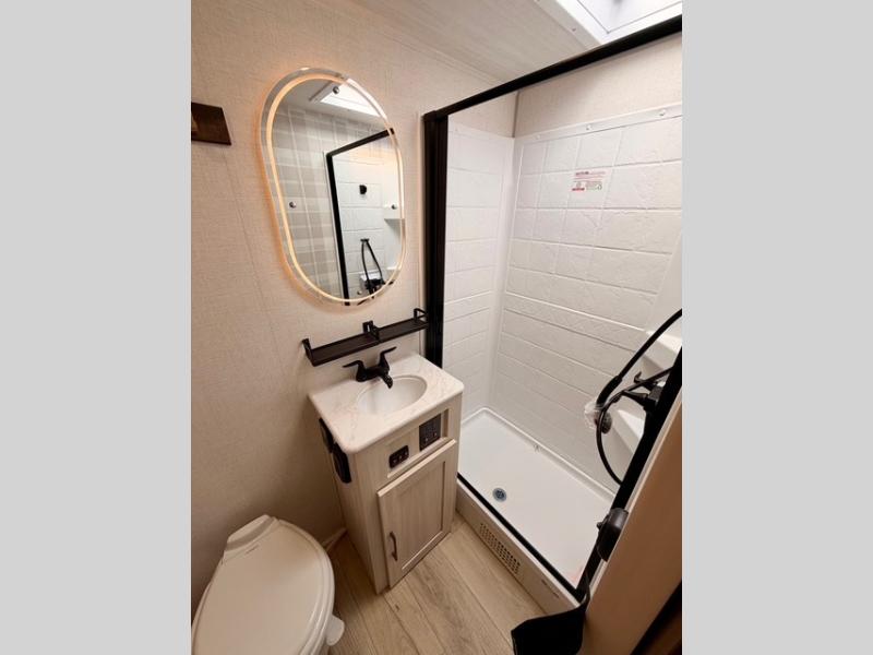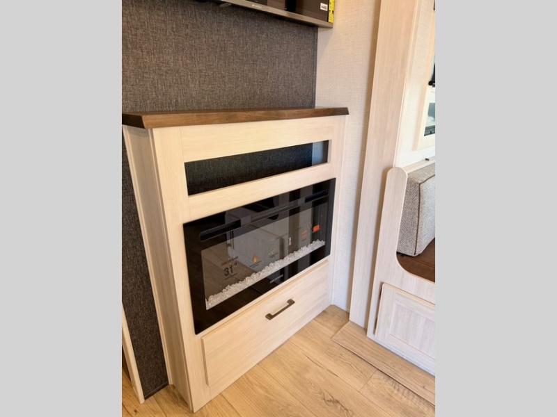 Whether you're camping with friends or family, you'll love the space and comfort found in this travel trailer. The outside kitchen is packed with features, such as a gas griddle, sink, refrigerator, and a shelf, plus there is a 21' electric awning for shade. Head inside to relax on the EZ- out sofa, or play a game at the booth dinette. You will also love the HD TV for your favorite shows at night. This model includes a full rear bath with a linen closet for clean towels and an upgraded slow-close shower door.