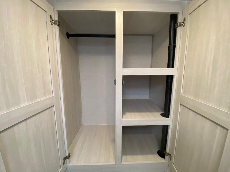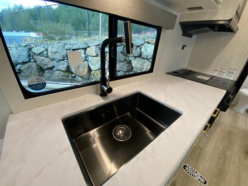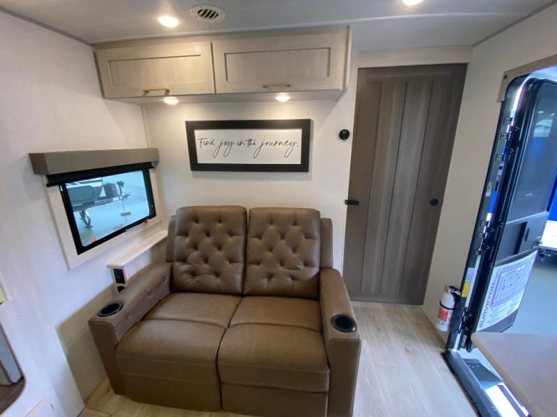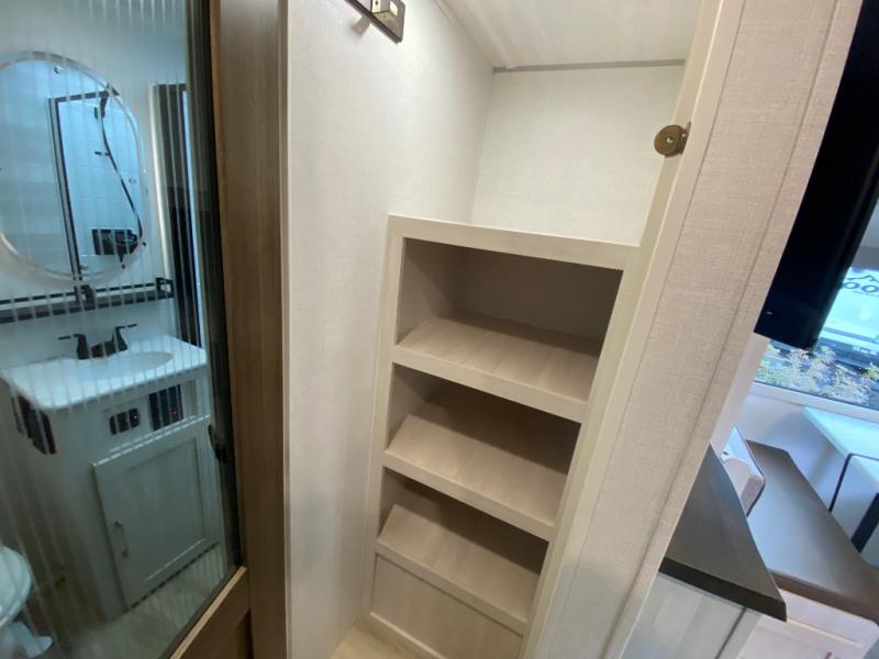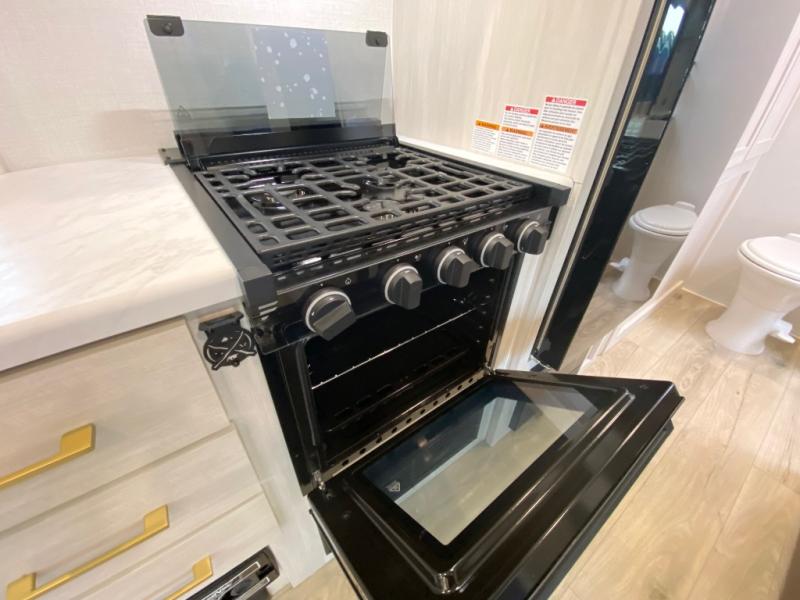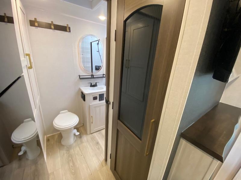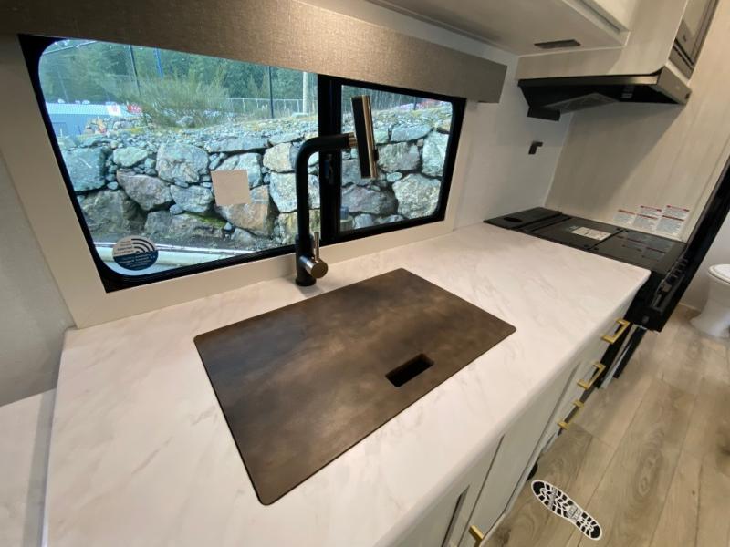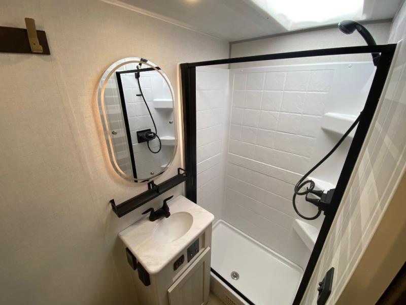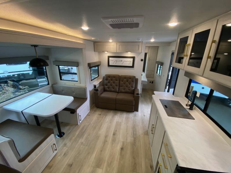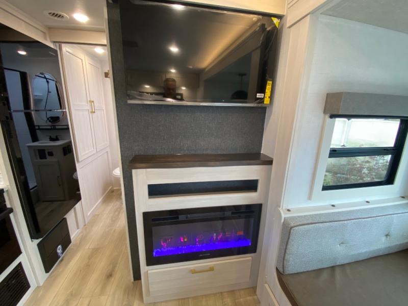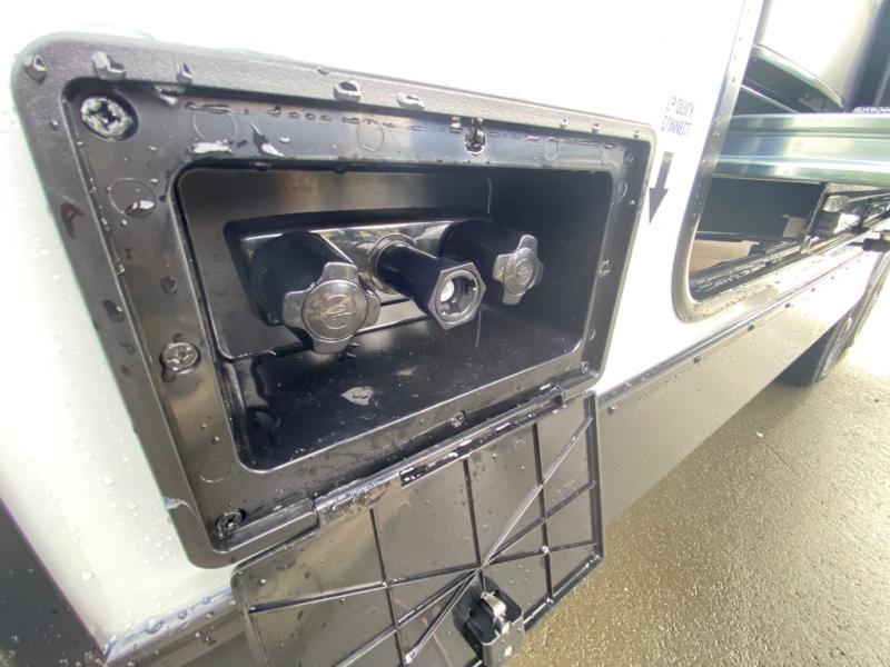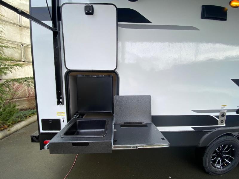 Whether you're camping with friends or family, you'll love the space and comfort found in this travel trailer. The outside kitchen is packed with features, such as a gas griddle, sink, refrigerator, and a shelf, plus there is a 21' electric awning for shade. Head inside to relax on the EZ- out sofa, or play a game at the booth dinette. You will also love the HD TV for your favorite shows at night. This model includes a full rear bath with a linen closet for clean towels and an upgraded slow-close shower door.