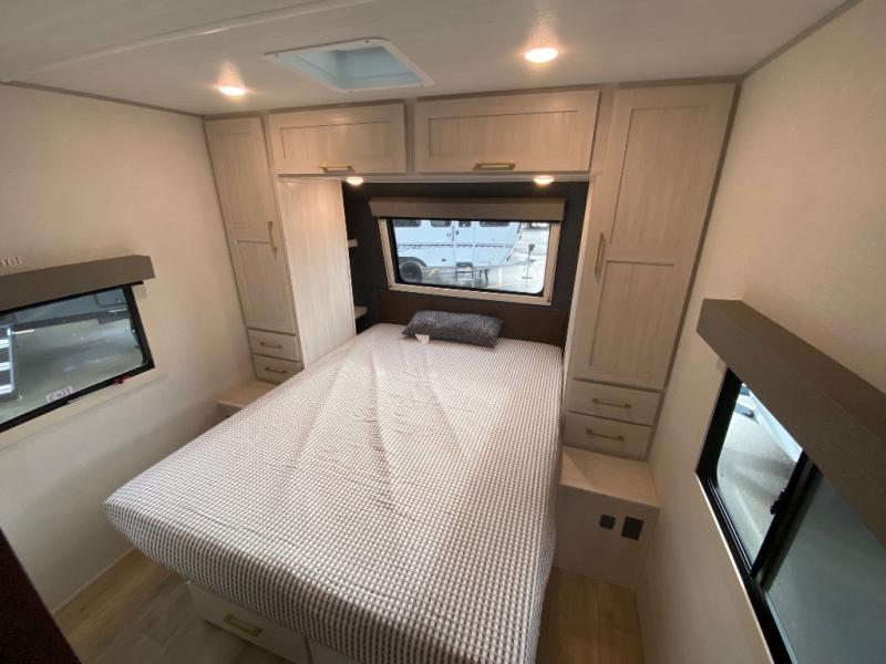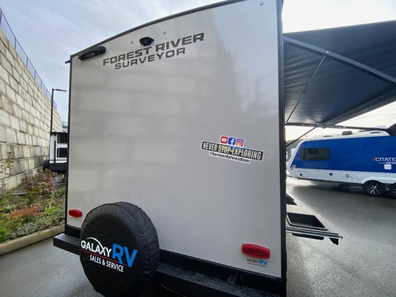 With any Surveyor Legend travel trailer by Forest River you will enjoy quality craftsmanship, convenient amenities, and at-home comforts. The Azdel composite walls provide a longer-lasting trailer, and the power tongue jack with hitch light makes getting back on the road quick and easy. There are also Goodyear® tires and a tire pressure monitoring system (TPMS) for more confident, hassle-free towing. Each model is built with thoughtful details like slam-latch exterior baggage doors and an automotive-style tinted front windshield that gives the front cap a sleek look while letting in natural light. You’ll appreciate camping with a tankless water heater for endless hot showers, a 2" rear accessory hitch to bring bikes or extra gear along, plus a central vacuum system that helps keep your easy-to-clean interior looking fresh.
