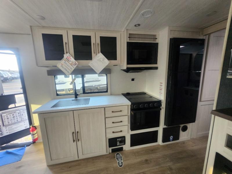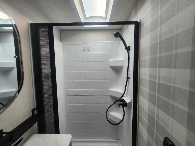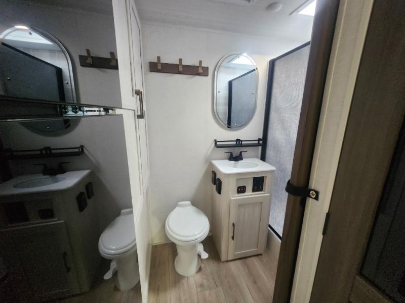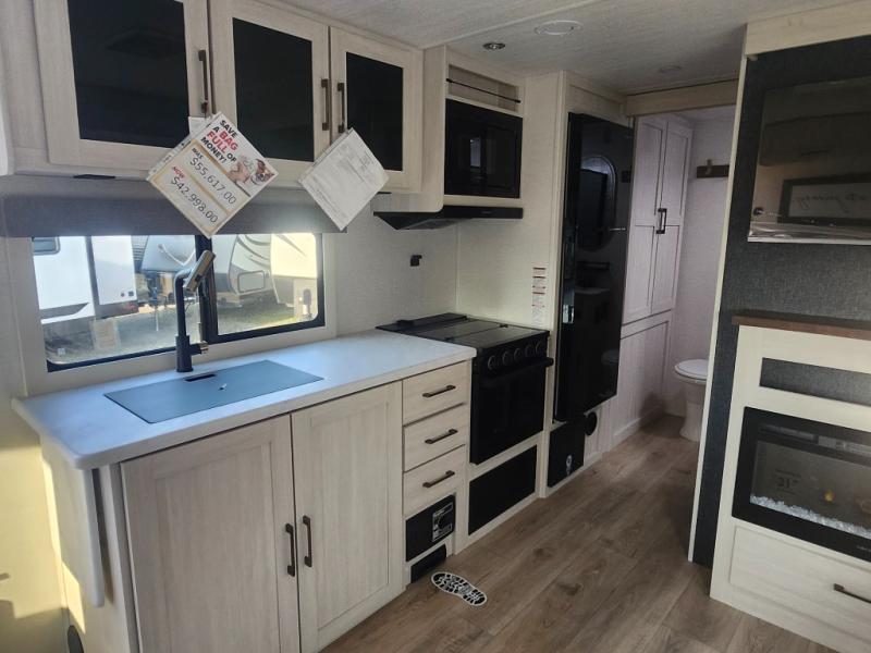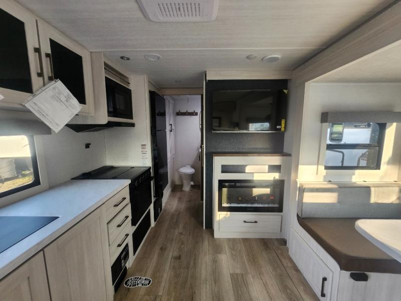 Whether you're camping with friends or family, you'll love the space and comfort found in this travel trailer. The outside kitchen is packed with features, such as a gas griddle, sink, refrigerator, and a shelf, plus there is a 21' electric awning for shade. Head inside to relax on the EZ- out sofa, or play a game at the booth dinette. You will also love the HD TV for your favorite shows at night. This model includes a full rear bath with a linen closet for clean towels and an upgraded slow-close shower door.