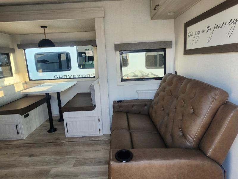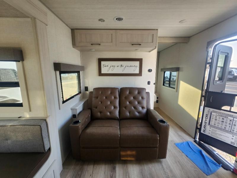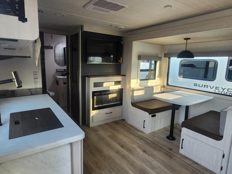 With any Surveyor Legend travel trailer by Forest River you will enjoy quality craftsmanship, convenient amenities, and at-home comforts. The Azdel composite walls provide a longer-lasting trailer, and the power tongue jack with hitch light makes getting back on the road quick and easy. There are also Goodyear® tires and a tire pressure monitoring system (TPMS) for more confident, hassle-free towing. Each model is built with thoughtful details like slam-latch exterior baggage doors and an automotive-style tinted front windshield that gives the front cap a sleek look while letting in natural light. You’ll appreciate camping with a tankless water heater for endless hot showers, a 2" rear accessory hitch to bring bikes or extra gear along, plus a central vacuum system that helps keep your easy-to-clean interior looking fresh.