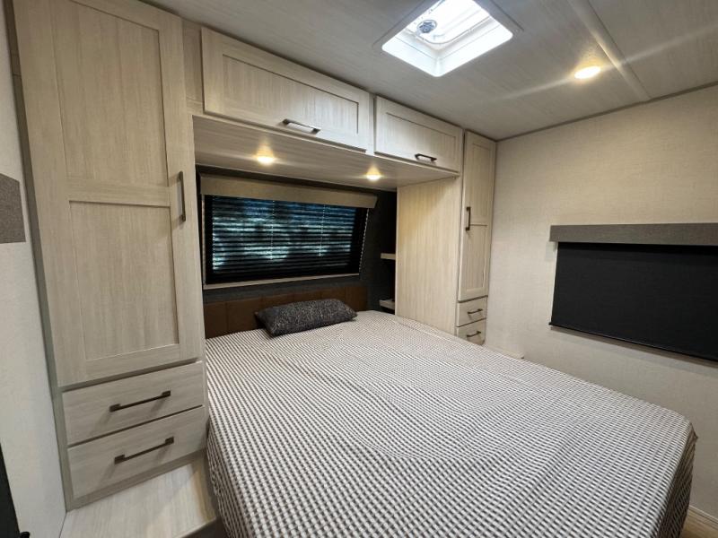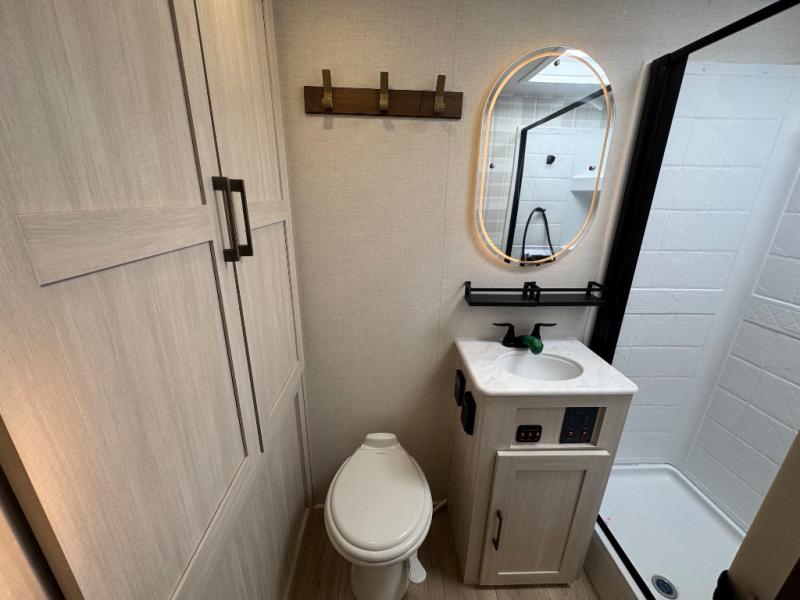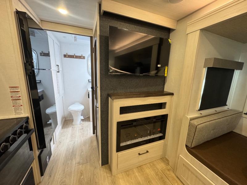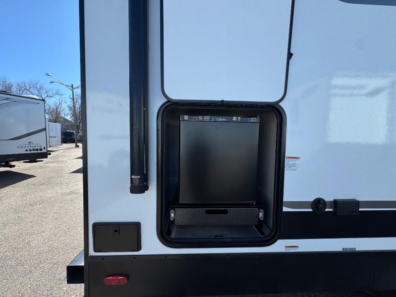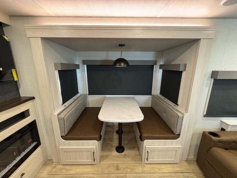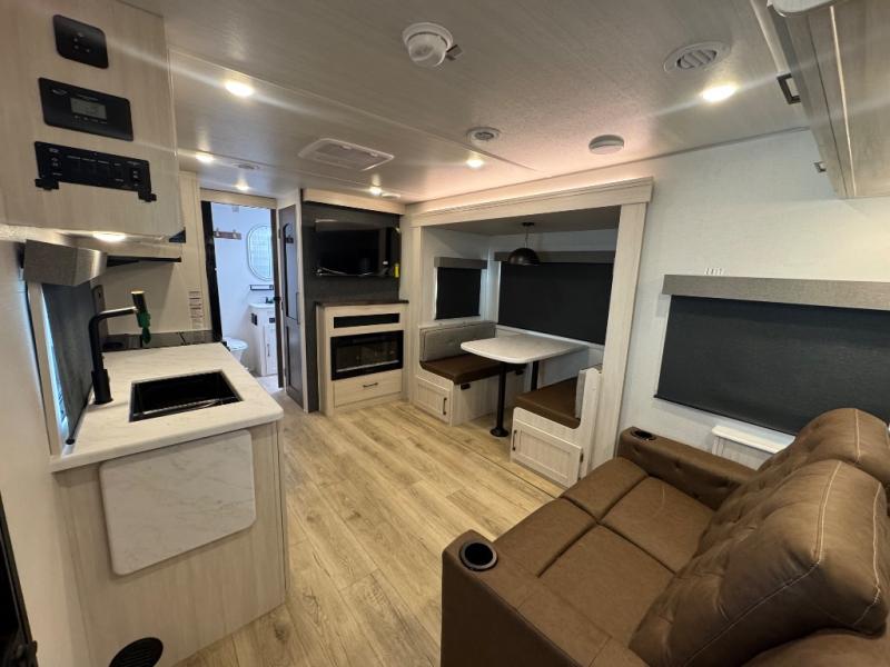 Fun at the campground begins in this spacious travel trailer for five to six! You will enjoy having your own front private bedroom with a queen bed, while your guests sleep on the EZ-out sofa and booth dinette in the main living area. Breakfast can be made in the full kitchen on the residential range or outside on the exterior kitchen. There is ample storage space throughout this model, including dual bedroom wardrobes, overhead cabinets, a bath linen closet, and a walk-in pantry.