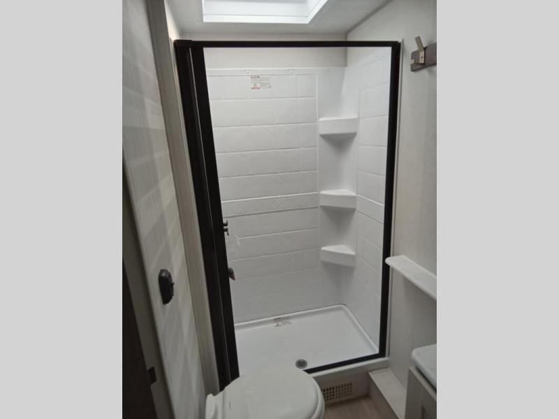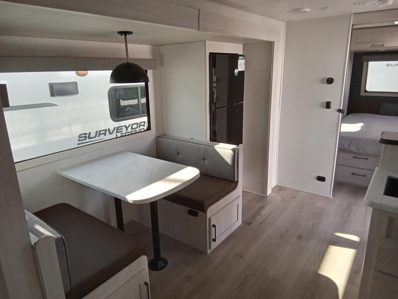 With any Surveyor Legend travel trailer by Forest River you will enjoy quality craftsmanship, convenient amenities, and at-home comforts. The Azdel composite walls provide a longer-lasting trailer, and the power tongue jack with a hitch light will get you back on the road in no-time. There are also Goodyear tires and a tire pressure monitoring system for hassle-free towing. Each model includes the Surveyor Legend Package that comes standard with oversized dinette storage access doors, front slam latch baggage doors, plus an automotive style tinted front windshield. You'll appreciate camping with a tankless water heater for endless hot showers, a 2" accessory hitch to bring bikes along, plus carpet-free interiors and a central vacuum system for easy clean up.