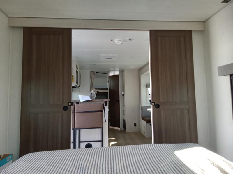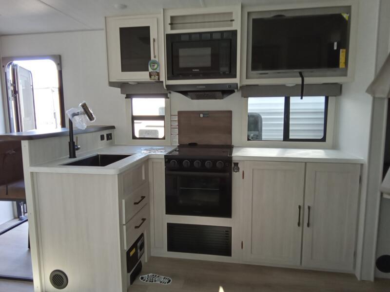 Every trip to the campground will be spent in comfort with this single slide out travel trailer. Once you arrive at the site, remove the kayaks or bikes from the rear storage door, start lunch on the outside kitchen, and put out the 15' power awning with LED lights. The interior includes a booth dinette slide with storage, a bar top with stools, plus an HD TV for movie nights. After a day of fun, head to the front private bedroom for a great night's rest on the queen bed, and you can store your belongings in the dual bedroom wardrobes!