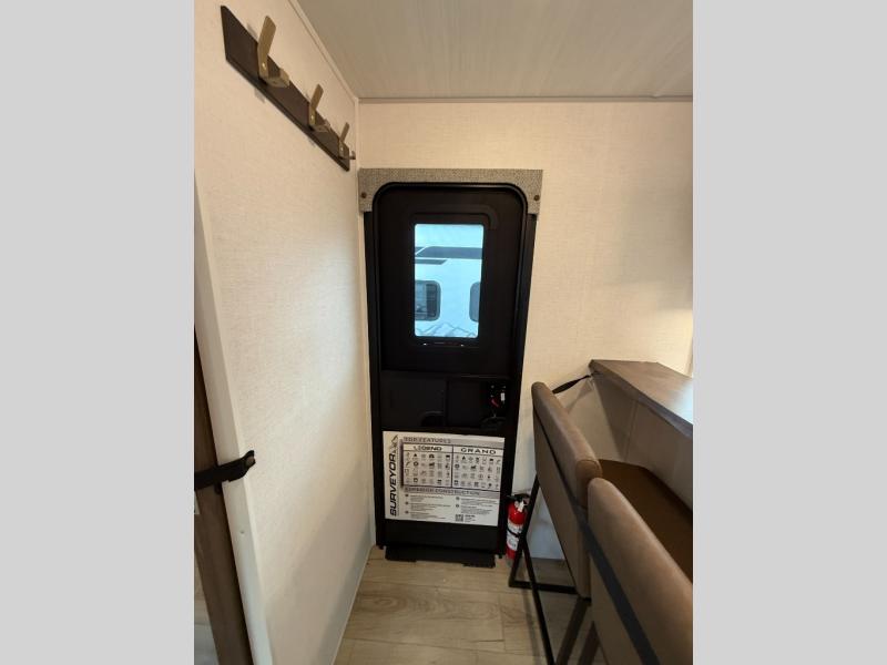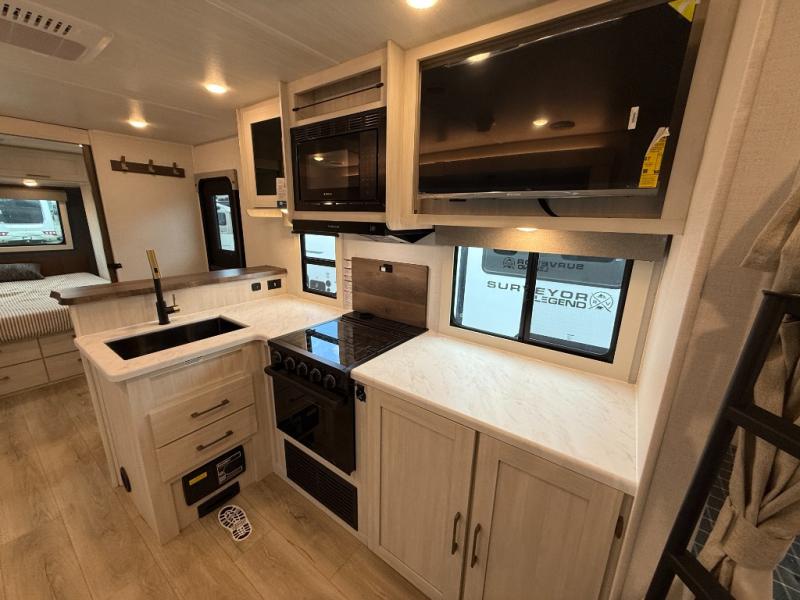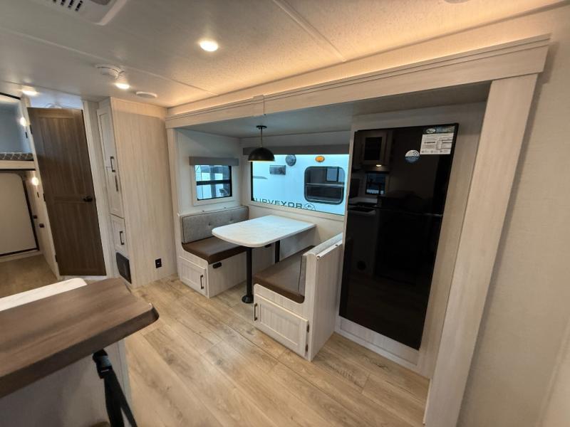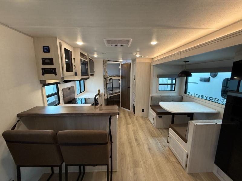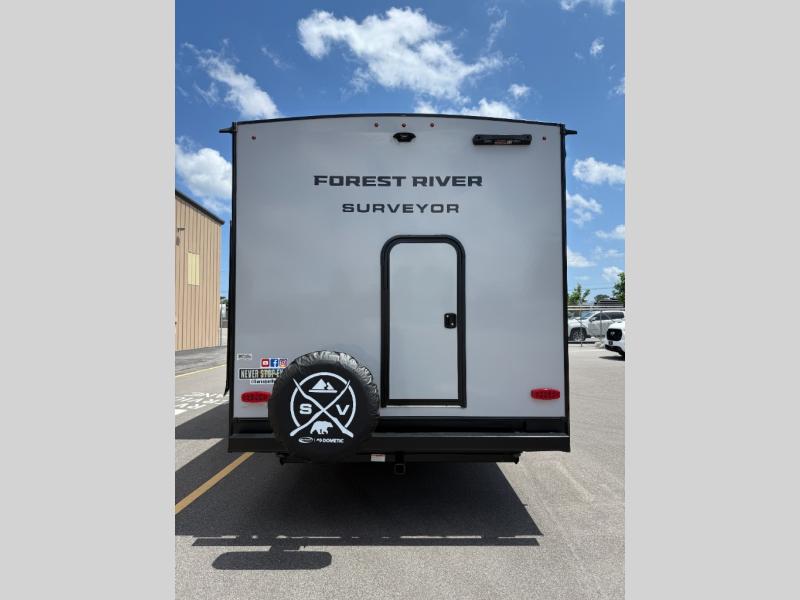 With any Surveyor Legend travel trailer by Forest River you will enjoy quality craftsmanship, convenient amenities, and at-home comforts. The Azdel composite walls provide a longer-lasting trailer, and the power tongue jack with a hitch light will get you back on the road in no-time. There are also Goodyear tires and a tire pressure monitoring system for hassle-free towing. Each model includes the Surveyor Legend Package that comes standard with oversized dinette storage access doors, front slam latch baggage doors, plus an automotive style tinted front windshield. You'll appreciate camping with a tankless water heater for endless hot showers, a 2" accessory hitch to bring bikes along, plus carpet-free interiors and a central vacuum system for easy clean up.