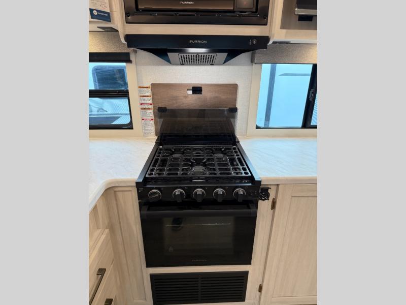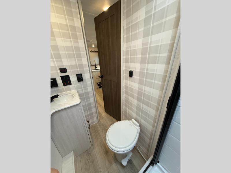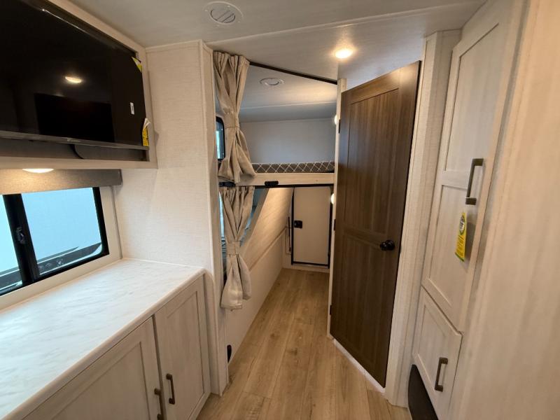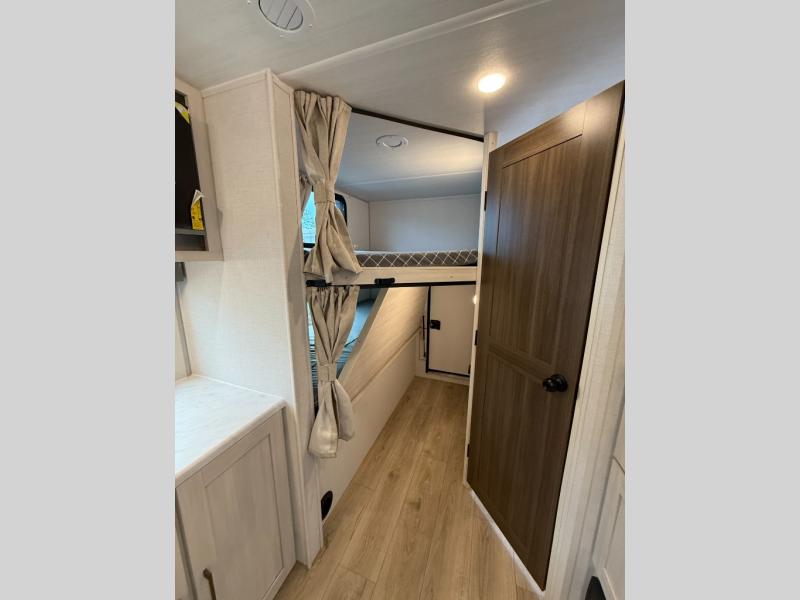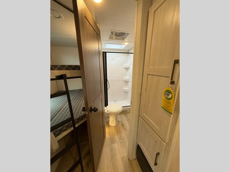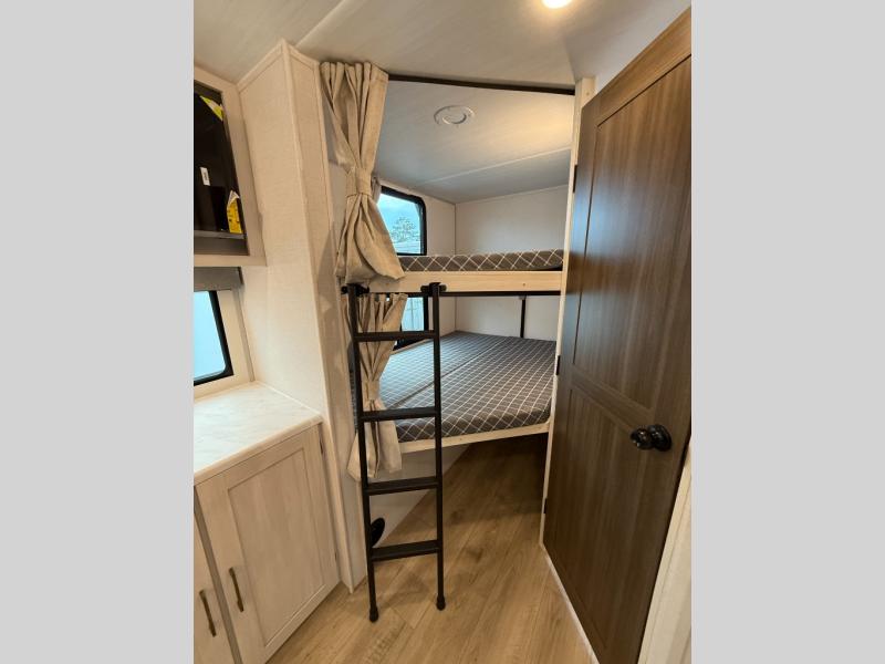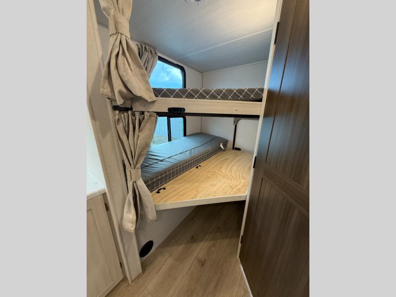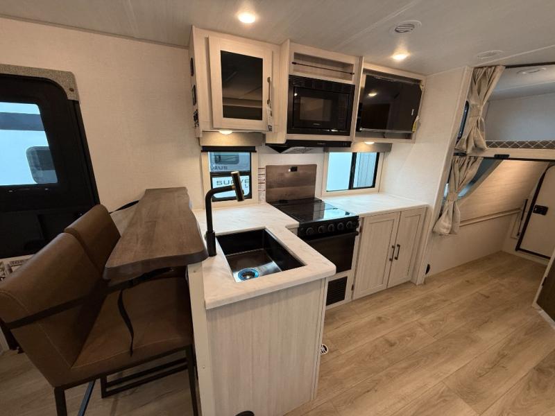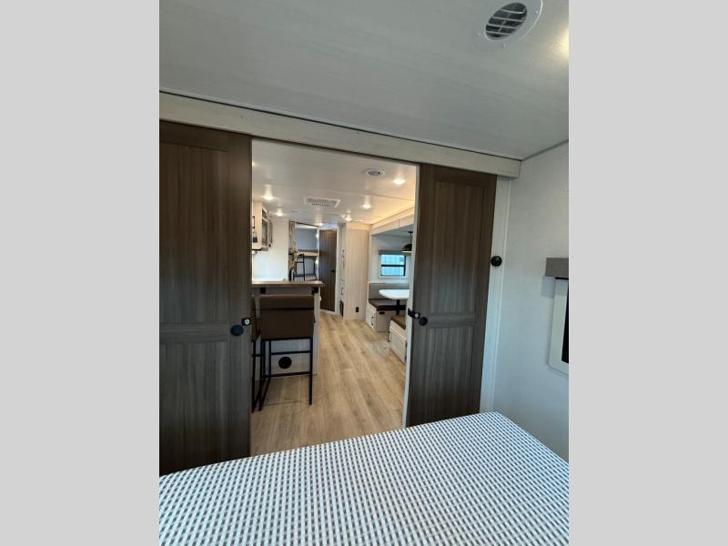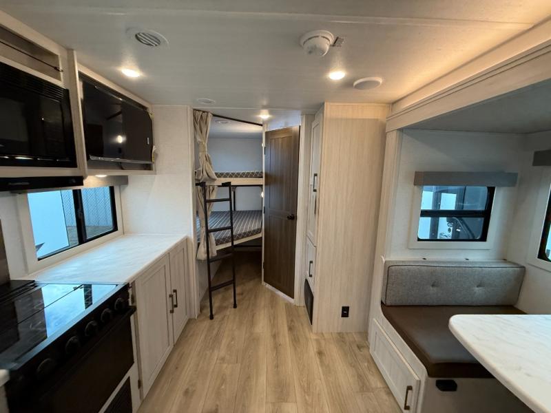 Every trip to the campground will be spent in comfort with this single slide out travel trailer. Once you arrive at the site, remove the kayaks or bikes from the rear storage door, start lunch on the outside kitchen, and put out the 15' power awning with LED lights. The interior includes a booth dinette slide with storage, a bar top with stools, plus an HD TV for movie nights. After a day of fun, head to the front private bedroom for a great night's rest on the queen bed, and you can store your belongings in the dual bedroom wardrobes!
