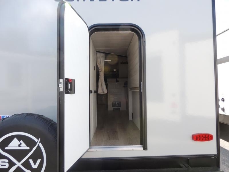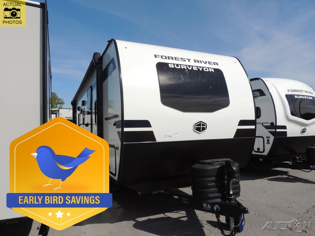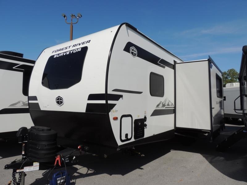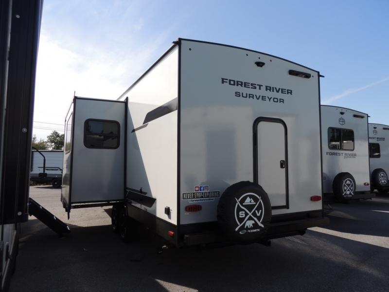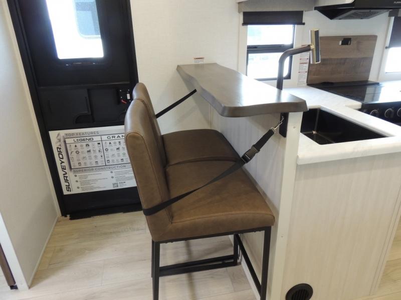 With any Surveyor Legend travel trailer by Forest River you will enjoy quality craftsmanship, convenient amenities, and at-home comforts. The Azdel composite walls provide a longer-lasting trailer, and the power tongue jack with a hitch light will get you back on the road in no-time. There are also Goodyear tires and a tire pressure monitoring system for hassle-free towing. Each model includes the Surveyor Legend Package that comes standard with oversized dinette storage access doors, front slam latch baggage doors, plus an automotive style tinted front windshield. You'll appreciate camping with a tankless water heater for endless hot showers, a 2" accessory hitch to bring bikes along, plus carpet-free interiors and a central vacuum system for easy clean up.