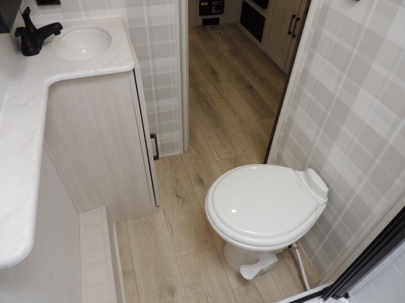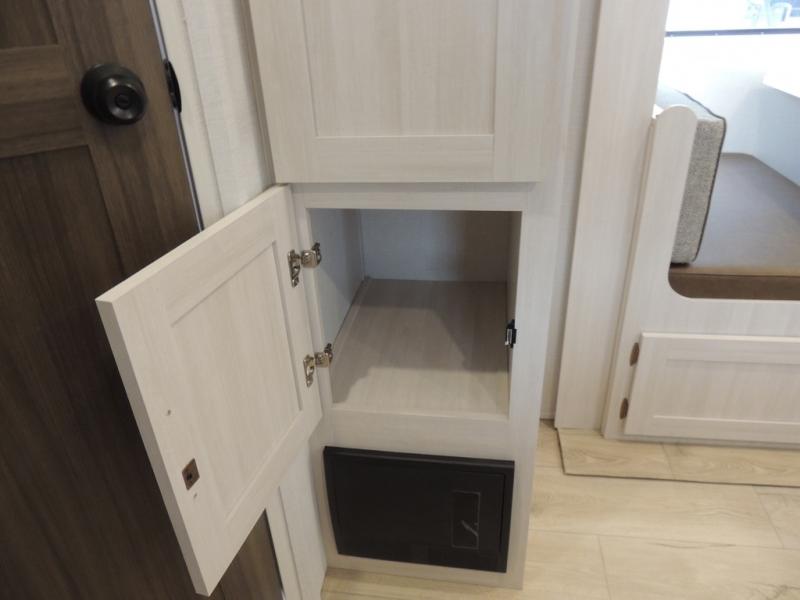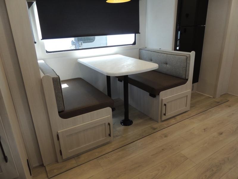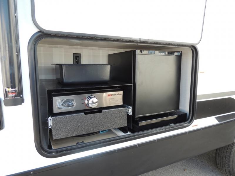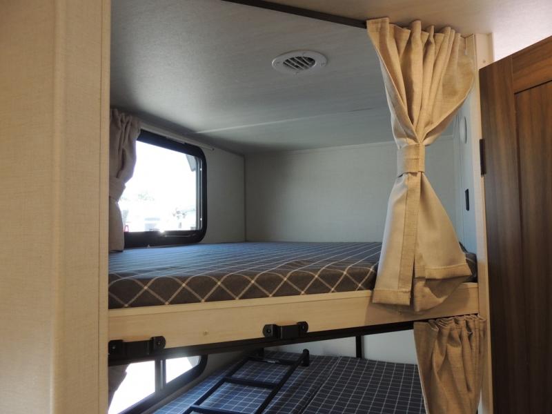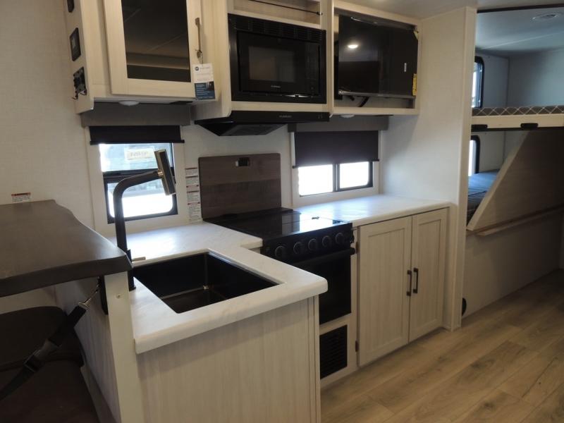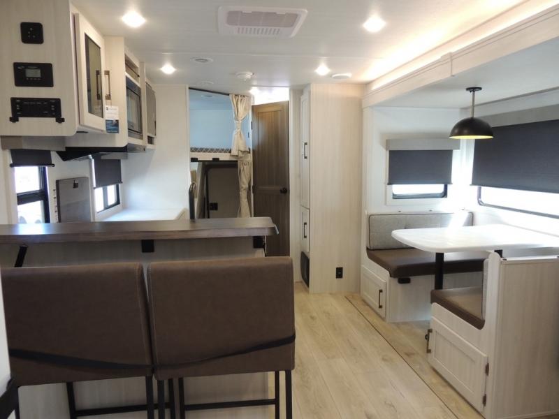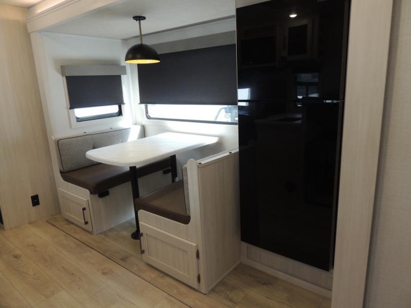 Every trip to the campground will be spent in comfort with this single slide out travel trailer. Once you arrive at the site, remove the kayaks or bikes from the rear storage door, start lunch on the outside kitchen, and put out the 15' power awning with LED lights. The interior includes a booth dinette slide with storage, a bar top with stools, plus an HD TV for movie nights. After a day of fun, head to the front private bedroom for a great night's rest on the queen bed, and you can store your belongings in the dual bedroom wardrobes!