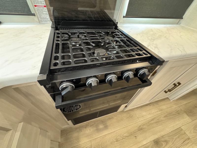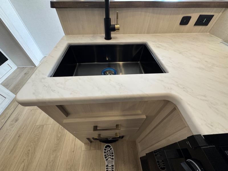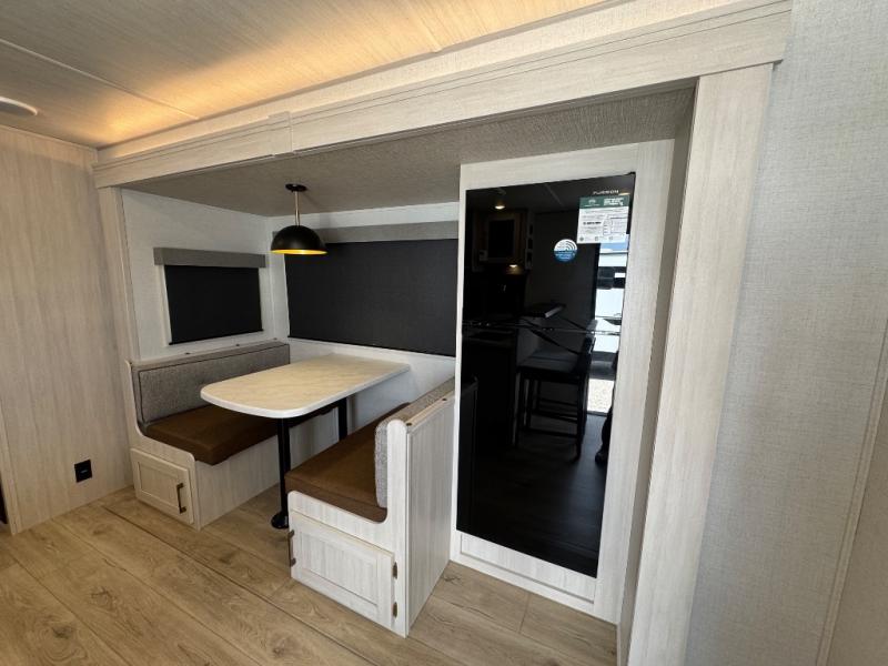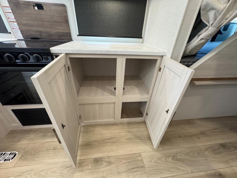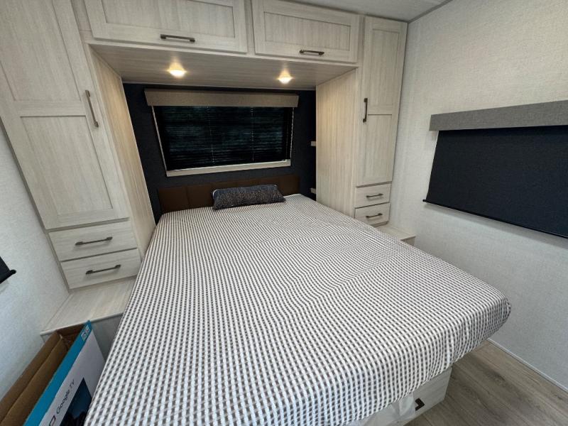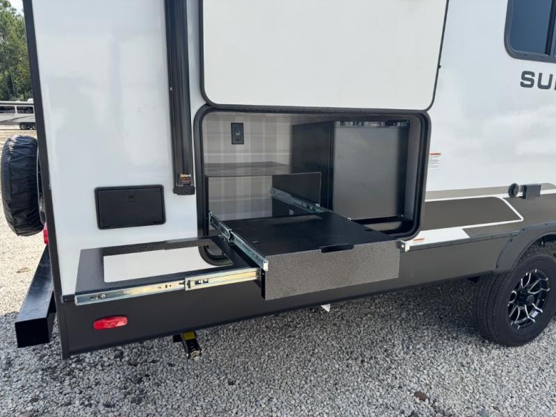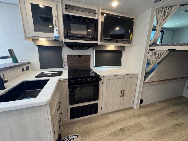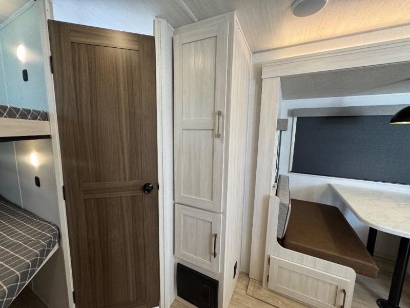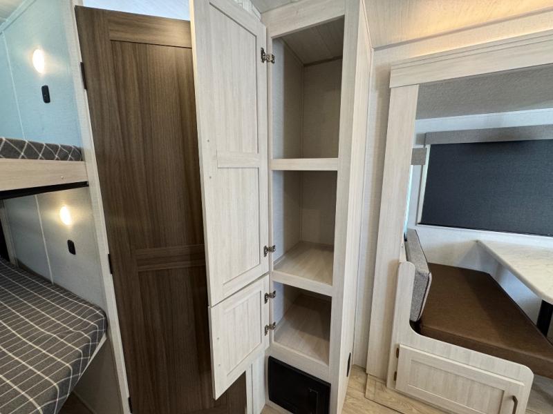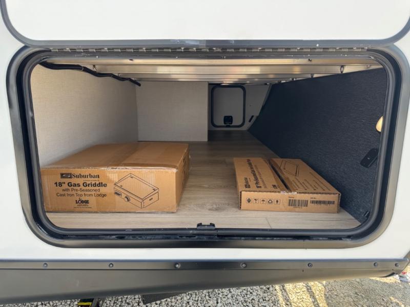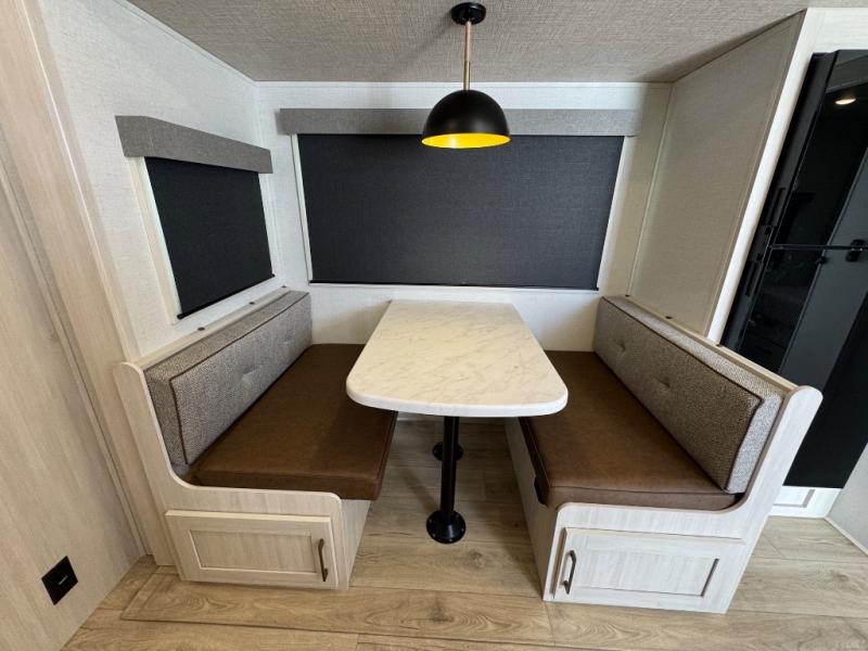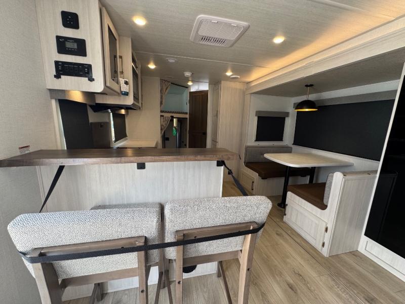 Every trip to the campground will be spent in comfort with this single slide out travel trailer. Once you arrive at the site, remove the kayaks or bikes from the rear storage door, start lunch on the outside kitchen, and put out the 15' power awning with LED lights. The interior includes a booth dinette slide with storage, a bar top with stools, plus an HD TV for movie nights. After a day of fun, head to the front private bedroom for a great night's rest on the queen bed, and you can store your belongings in the dual bedroom wardrobes!