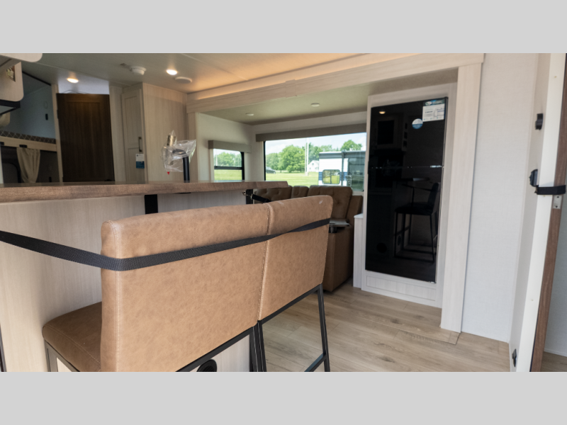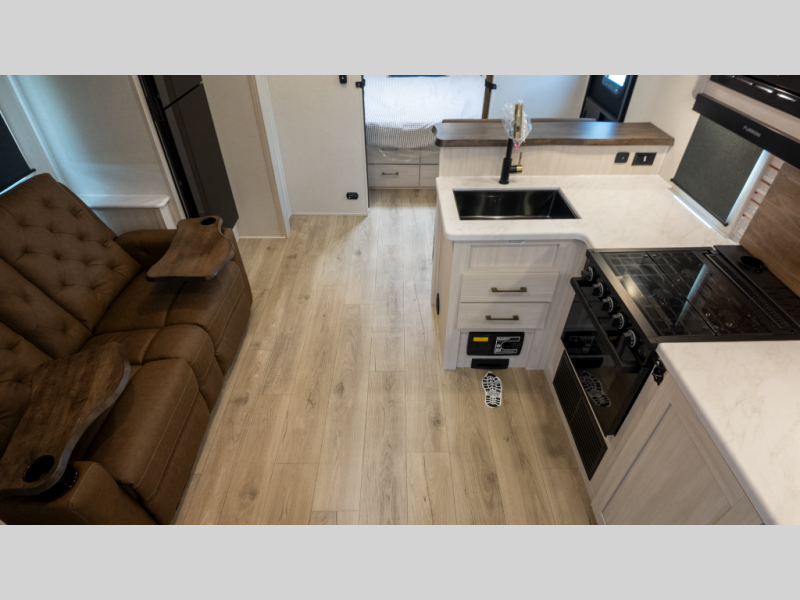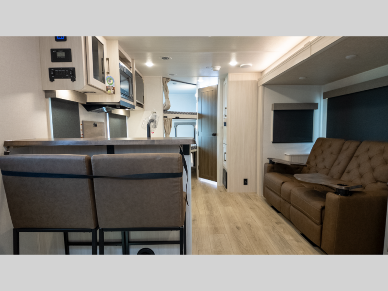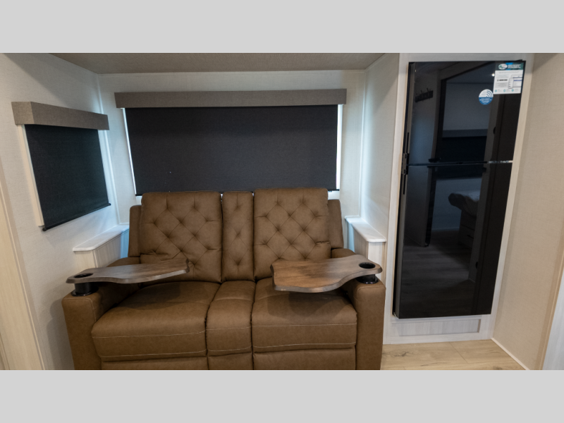 - Slide-out living with theater seating and HD TV for destination-style comfort