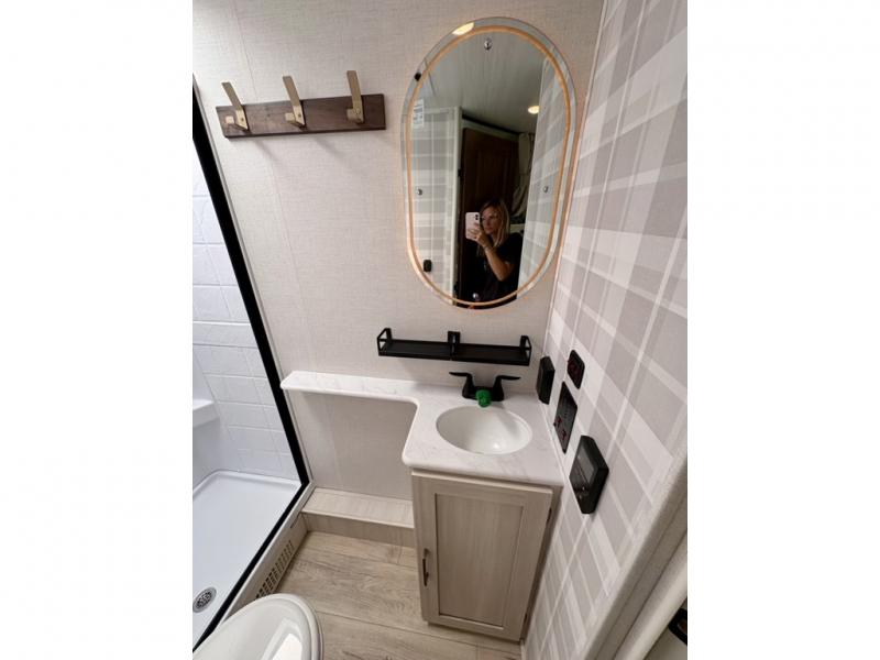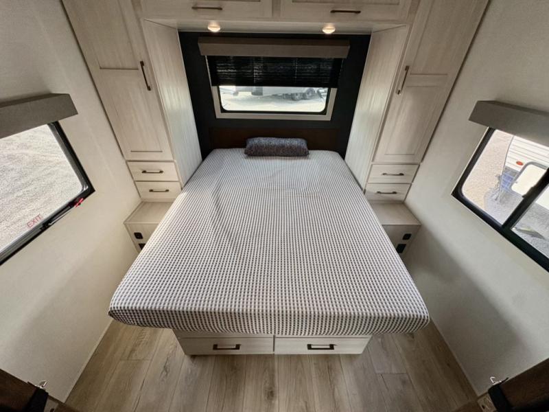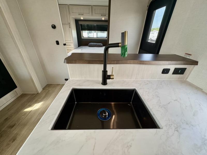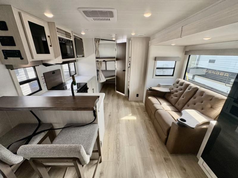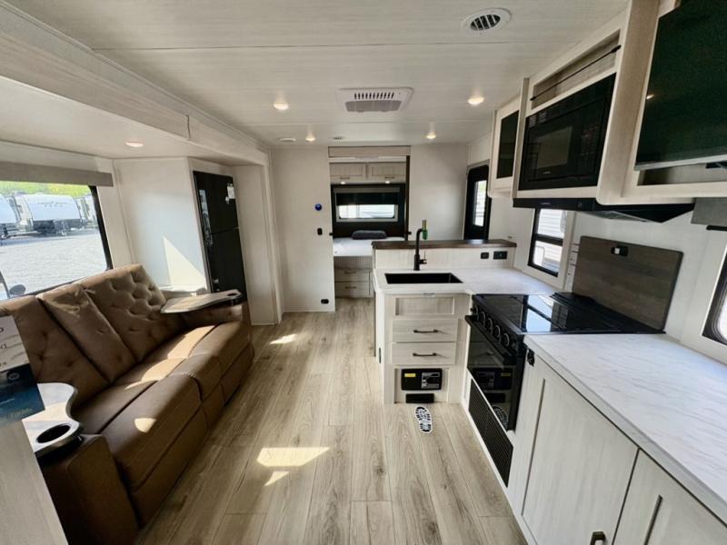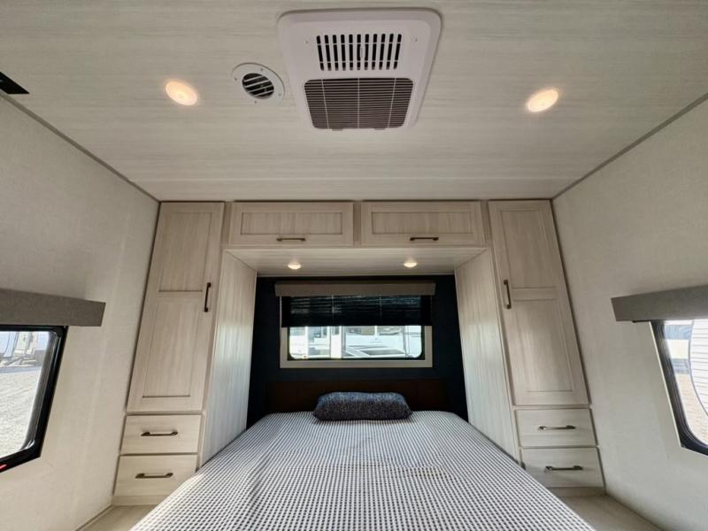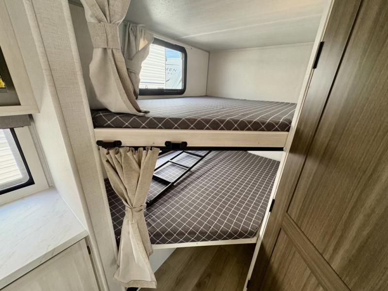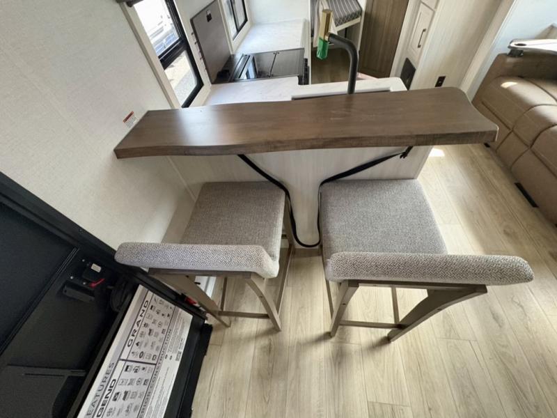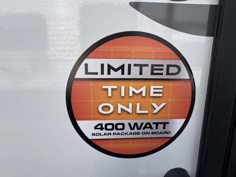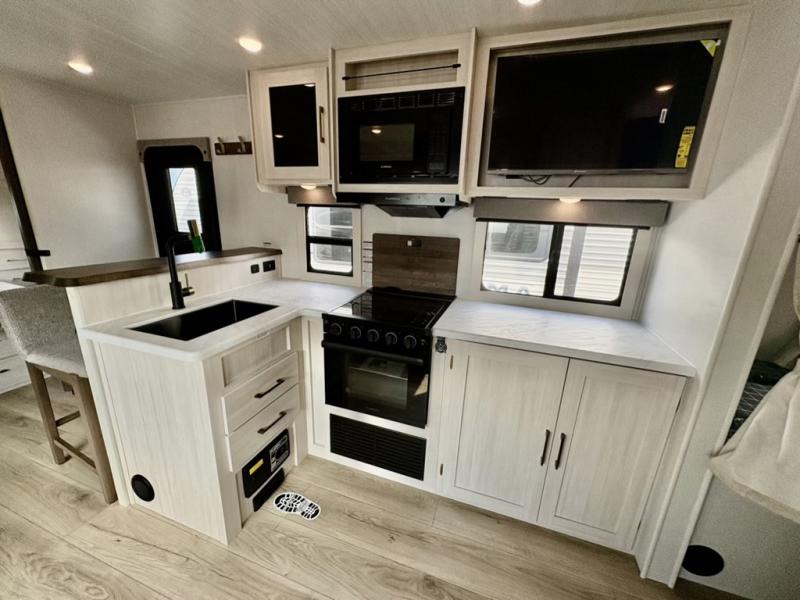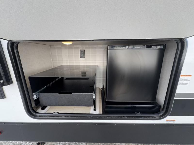 Every trip to the campground will be spent in comfort with this single slide out travel trailer. Once you arrive at the site, remove the kayaks or bikes from the rear storage door, start lunch on the outside kitchen, and put out the 15' power awning with LED lights. The interior includes a booth dinette slide with storage, a bar top with stools, plus an HD TV for movie nights. After a day of fun, head to the front private bedroom for a great night's rest on the queen bed, and you can store your belongings in the dual bedroom wardrobes!