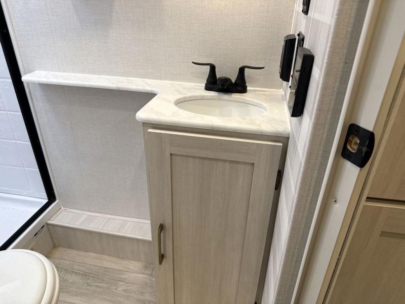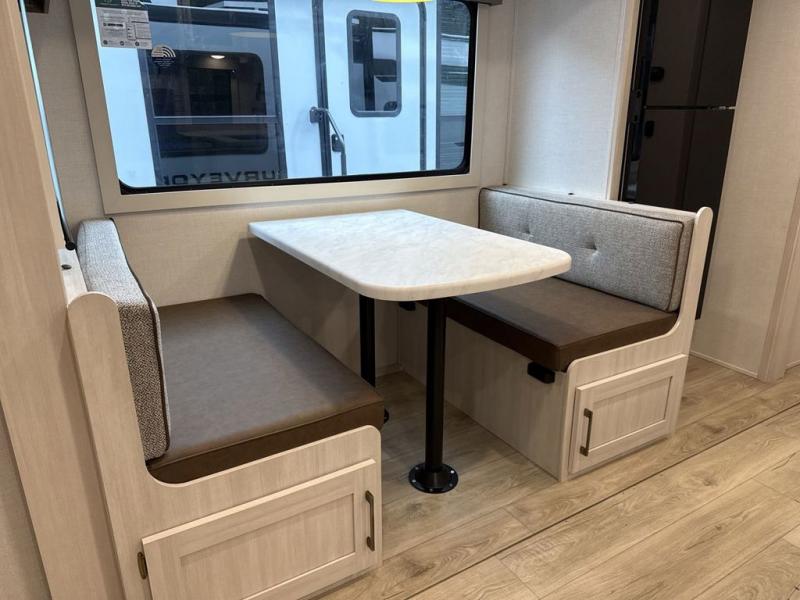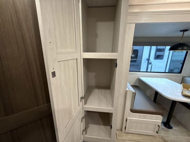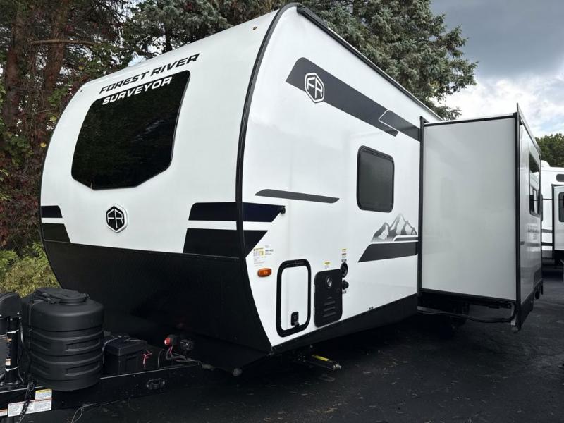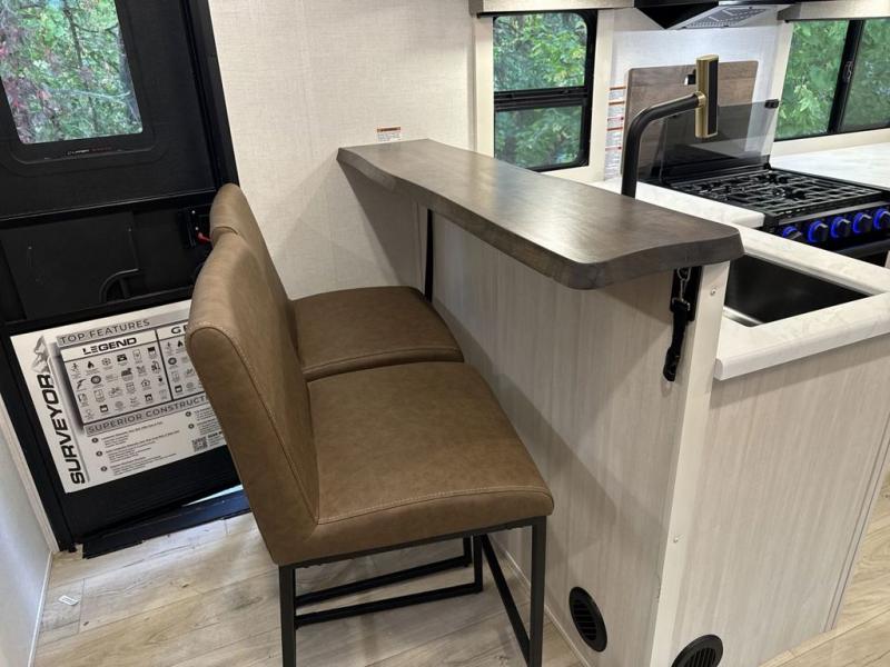 With any Surveyor Legend travel trailer by Forest River you will enjoy quality craftsmanship, convenient amenities, and at-home comforts. The Azdel composite walls provide a longer-lasting trailer, and the power tongue jack with a hitch light will get you back on the road in no-time. There are also Goodyear tires and a tire pressure monitoring system for hassle-free towing. Each model includes the Surveyor Legend Package that comes standard with oversized dinette storage access doors, front slam latch baggage doors, plus an automotive style tinted front windshield. You'll appreciate camping with a tankless water heater for endless hot showers, a 2" accessory hitch to bring bikes along, plus carpet-free interiors and a central vacuum system for easy clean up.