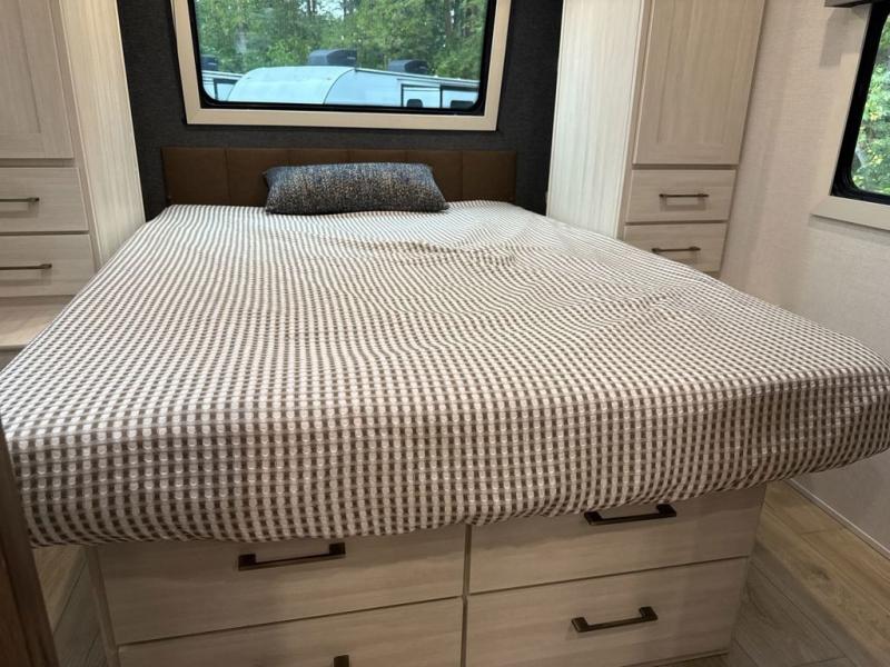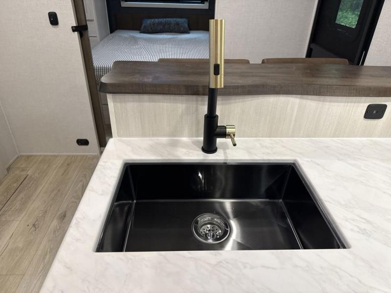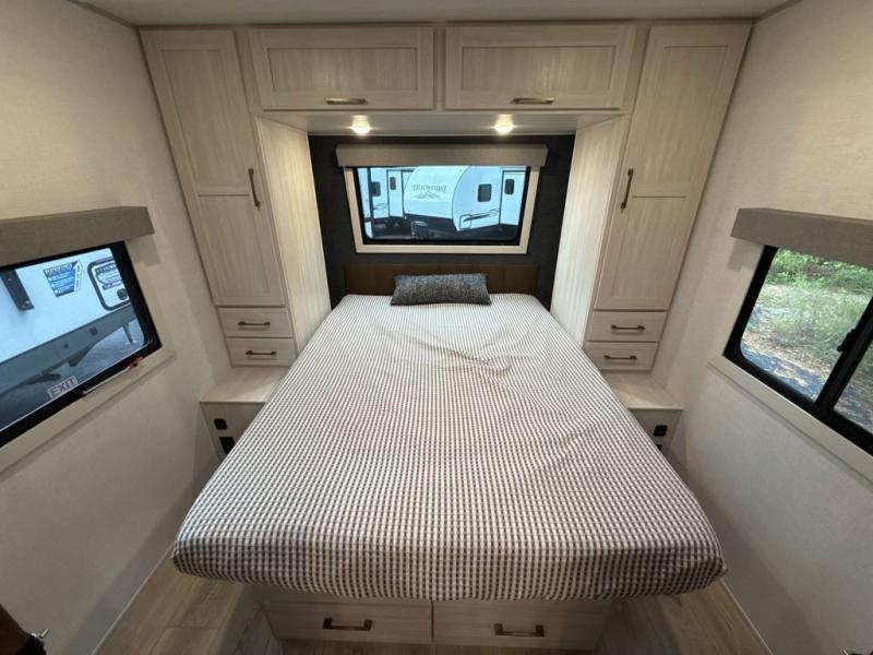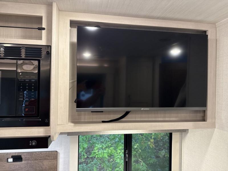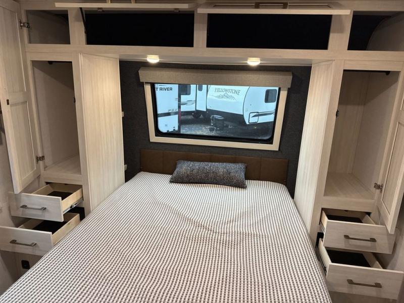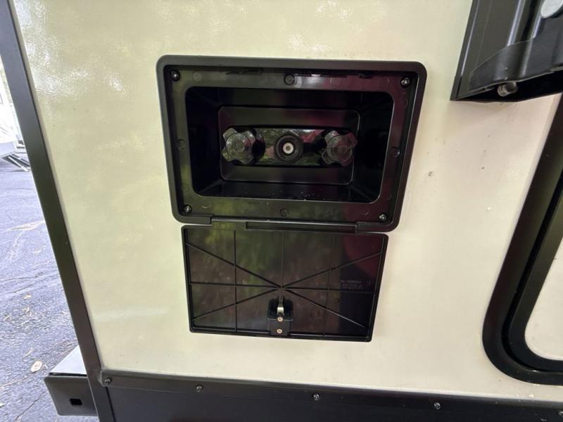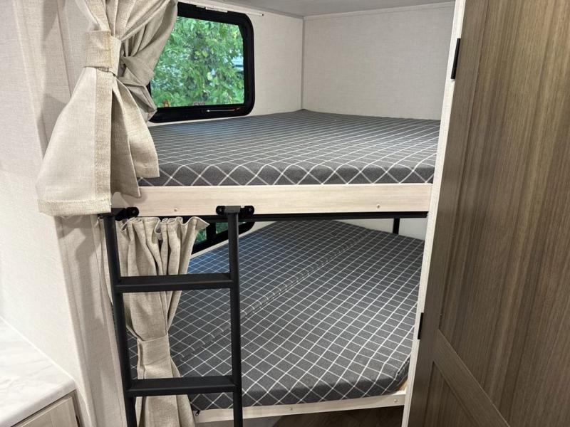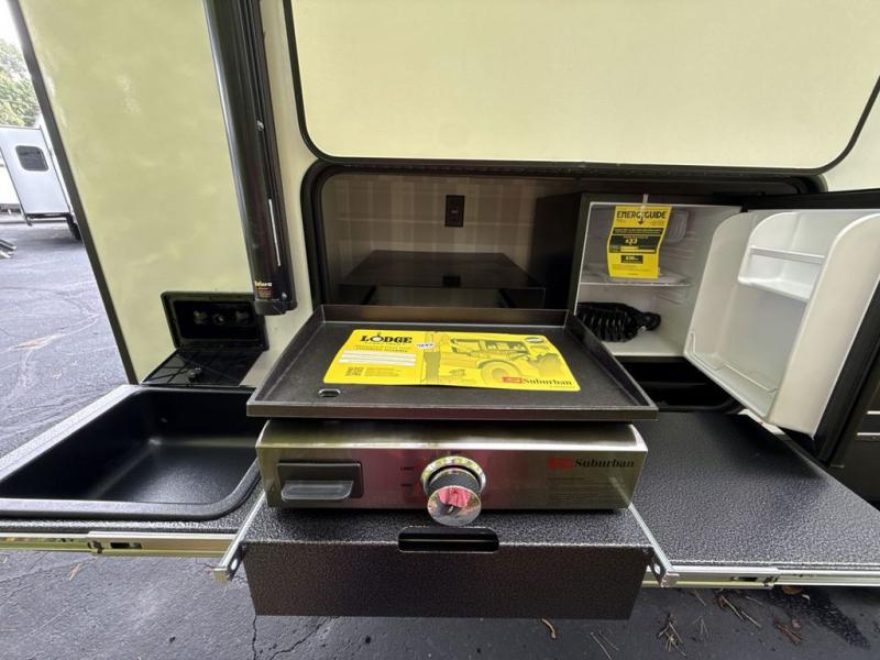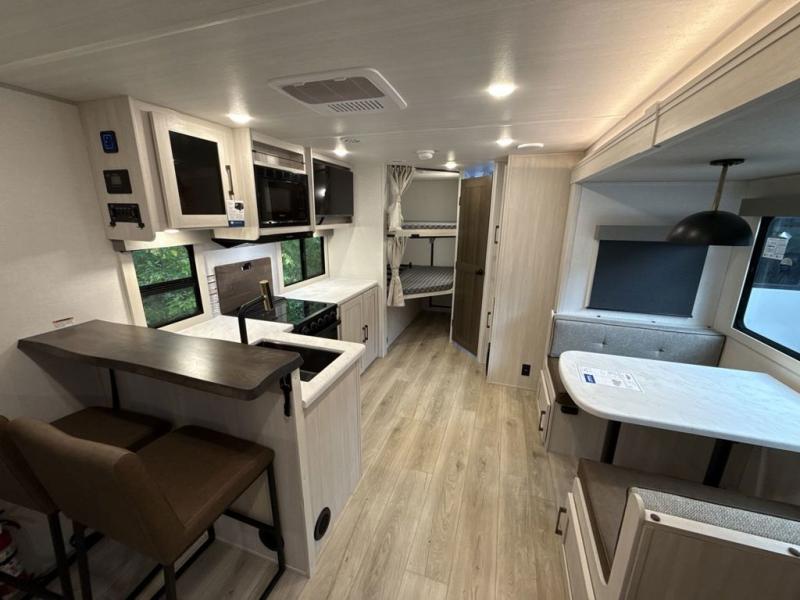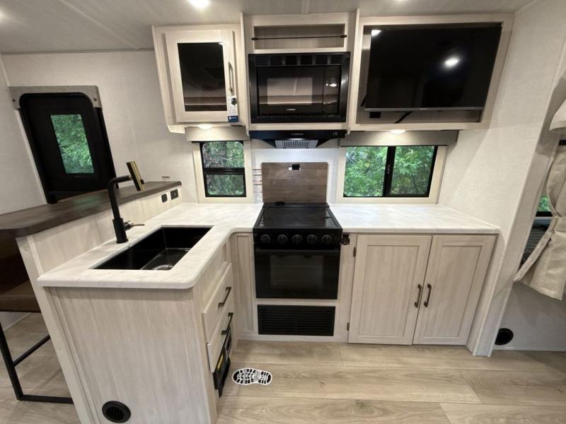 Every trip to the campground will be spent in comfort with this single slide out travel trailer. Once you arrive at the site, remove the kayaks or bikes from the rear storage door, start lunch on the outside kitchen, and put out the 15' power awning with LED lights. The interior includes a booth dinette slide with storage, a bar top with stools, plus an HD TV for movie nights. After a day of fun, head to the front private bedroom for a great night's rest on the queen bed, and you can store your belongings in the dual bedroom wardrobes!