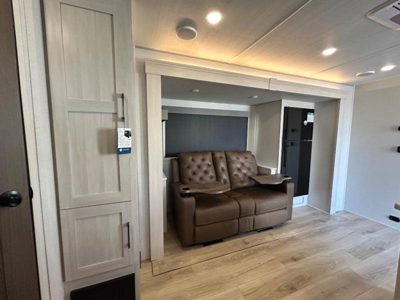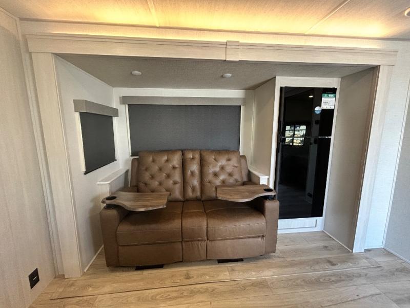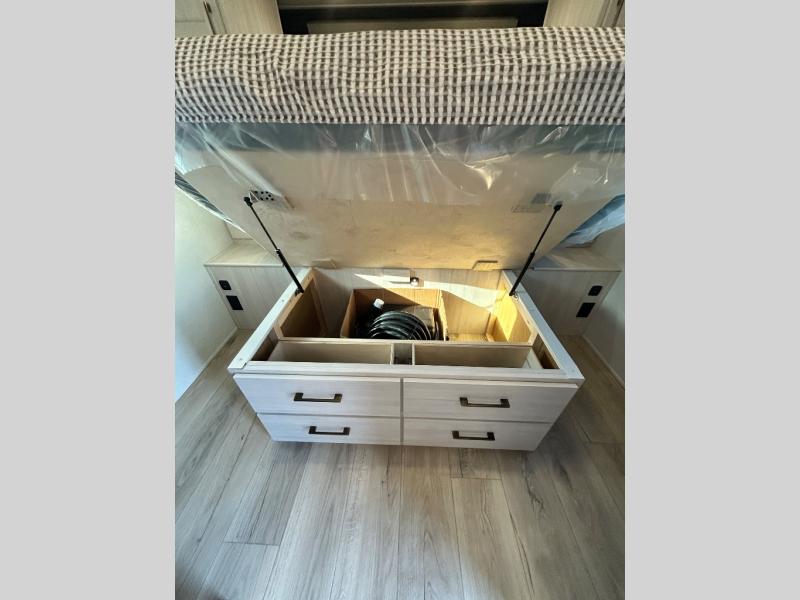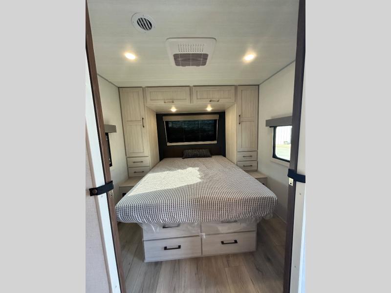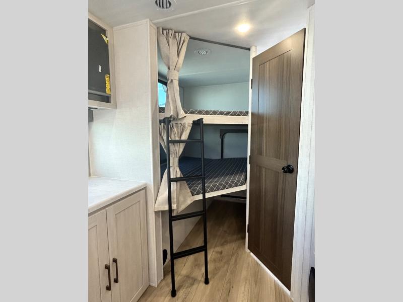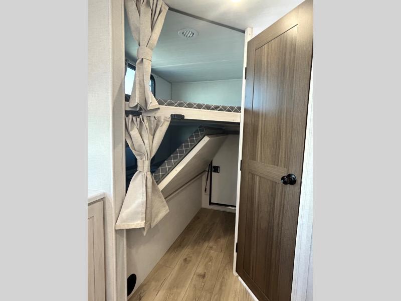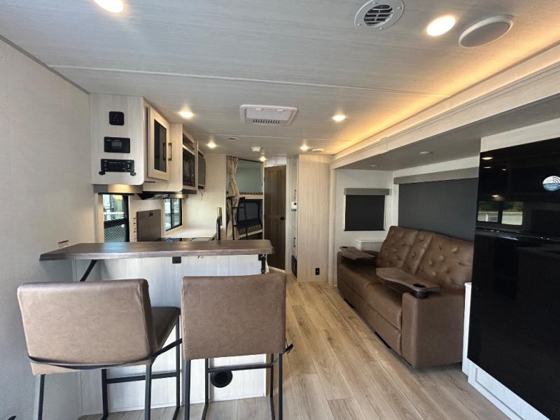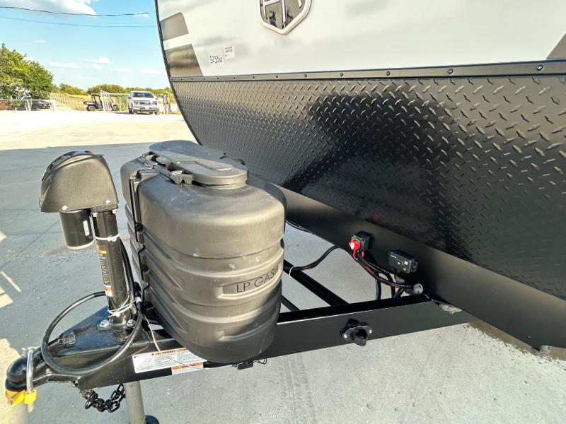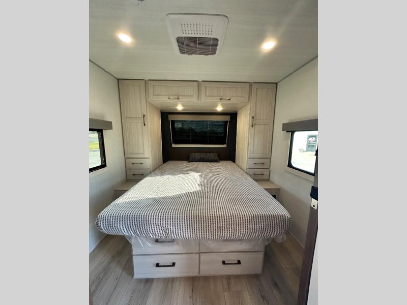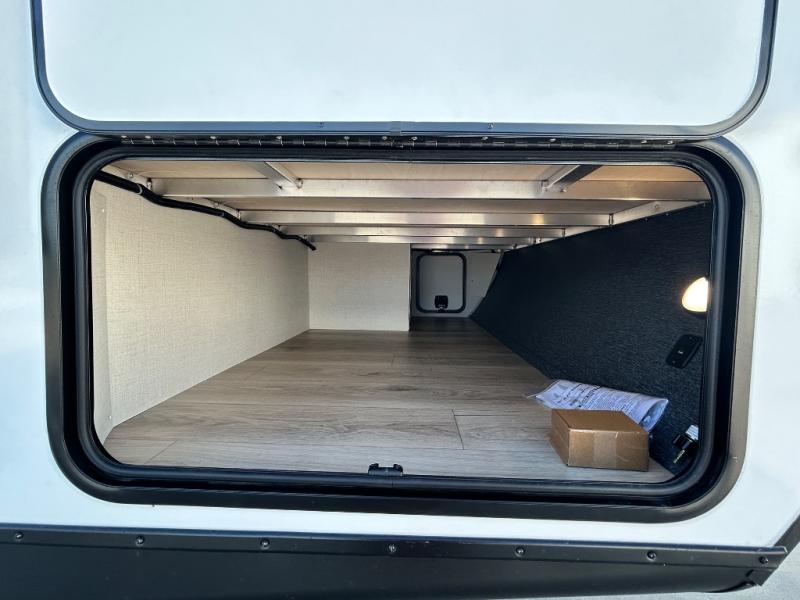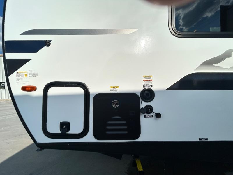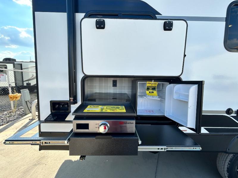 Every trip to the campground will be spent in comfort with this single slide out travel trailer. Once you arrive at the site, remove the kayaks or bikes from the rear storage door, start lunch on the outside kitchen, and put out the 15' power awning with LED lights. The interior includes a booth dinette slide with storage, a bar top with stools, plus an HD TV for movie nights. After a day of fun, head to the front private bedroom for a great night's rest on the queen bed, and you can store your belongings in the dual bedroom wardrobes!
