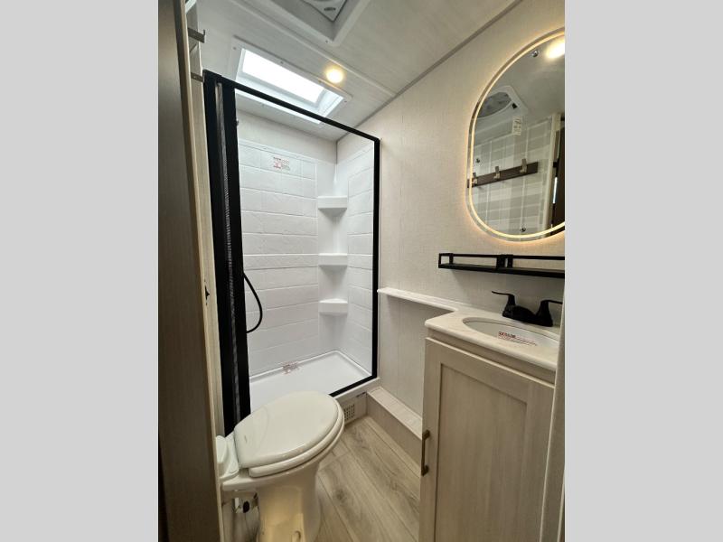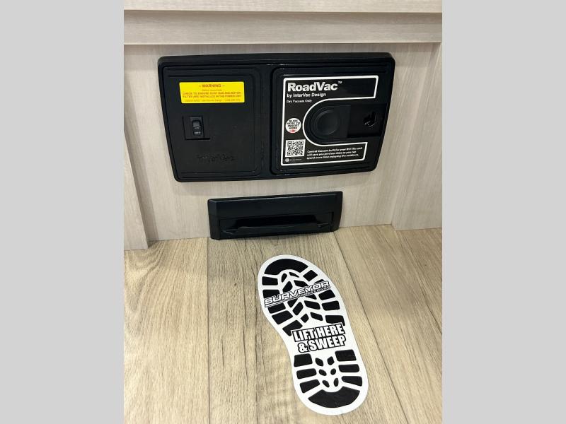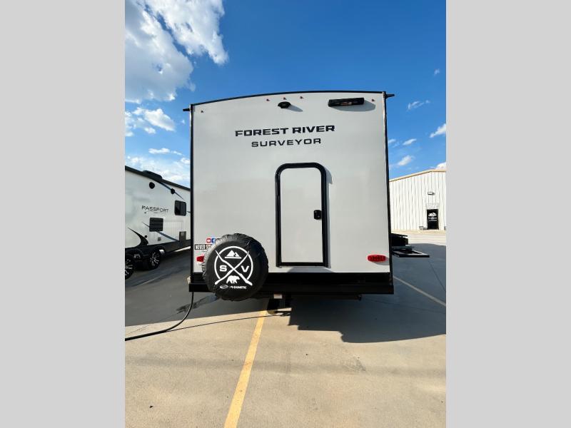 With any Surveyor Legend travel trailer by Forest River you will enjoy quality craftsmanship, convenient amenities, and at-home comforts. The Azdel composite walls provide a longer-lasting trailer, and the power tongue jack with a hitch light will get you back on the road in no-time. There are also Goodyear tires and a tire pressure monitoring system for hassle-free towing. Each model includes the Surveyor Legend Package that comes standard with oversized dinette storage access doors, front slam latch baggage doors, plus an automotive style tinted front windshield. You'll appreciate camping with a tankless water heater for endless hot showers, a 2" accessory hitch to bring bikes along, plus carpet-free interiors and a central vacuum system for easy clean up.