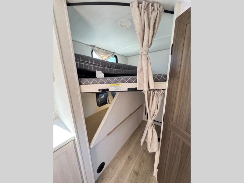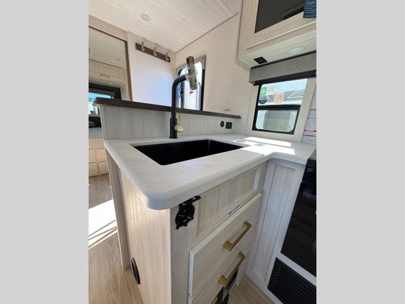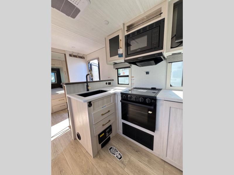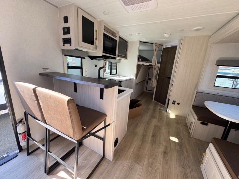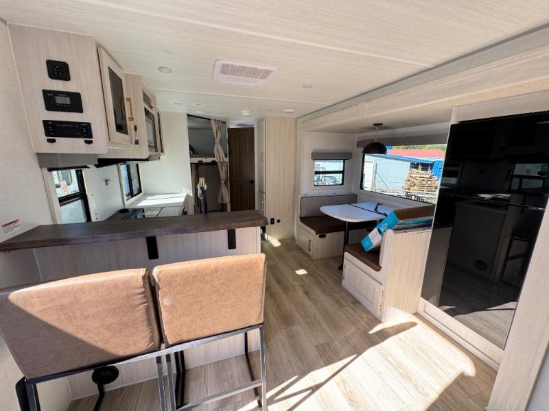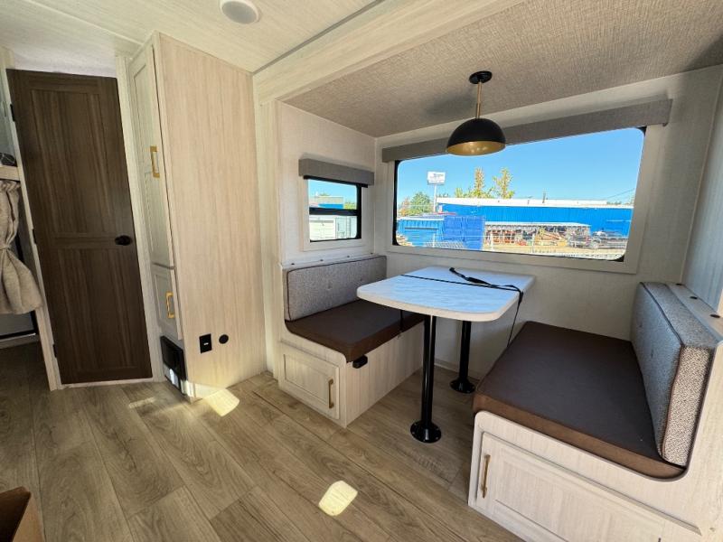 Every trip to the campground will be spent in comfort with this single slide out travel trailer. Once you arrive at the site, remove the kayaks or bikes from the rear storage door, start lunch on the outside kitchen, and put out the 15' power awning with LED lights. The interior includes a booth dinette slide with storage, a bar top with stools, plus an HD TV for movie nights. After a day of fun, head to the front private bedroom for a great night's rest on the queen bed, and you can store your belongings in the dual bedroom wardrobes!
