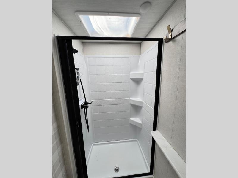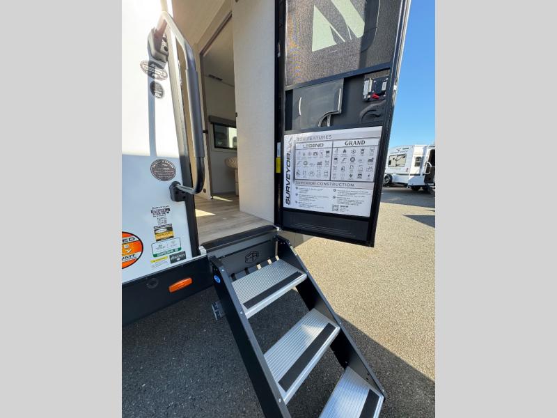 With any Surveyor Legend travel trailer by Forest River you will enjoy quality craftsmanship, convenient amenities, and at-home comforts. The Azdel composite walls provide a longer-lasting trailer, and the power tongue jack with a hitch light will get you back on the road in no-time. There are also Goodyear tires and a tire pressure monitoring system for hassle-free towing. Each model includes the Surveyor Legend Package that comes standard with oversized dinette storage access doors, front slam latch baggage doors, plus an automotive style tinted front windshield. You'll appreciate camping with a tankless water heater for endless hot showers, a 2" accessory hitch to bring bikes along, plus carpet-free interiors and a central vacuum system for easy clean up.