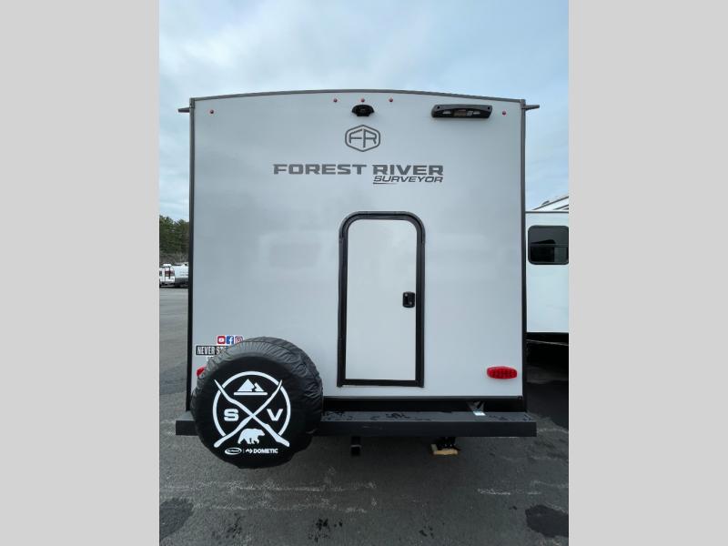 With any Surveyor Legend travel trailer by Forest River you will enjoy quality craftsmanship, convenient amenities, and at-home comforts. The Azdel composite walls provide a longer-lasting trailer, and the power tongue jack with a hitch light will get you back on the road in no-time. There are also Goodyear tires and a tire pressure monitoring system for hassle-free towing. Each model includes the Surveyor Legend Package that comes standard with oversized dinette storage access doors, front slam latch baggage doors, plus an automotive style tinted front windshield. You'll appreciate camping with a tankless water heater for endless hot showers, a 2" accessory hitch to bring bikes along, plus carpet-free interiors and a central vacuum system for easy clean up.