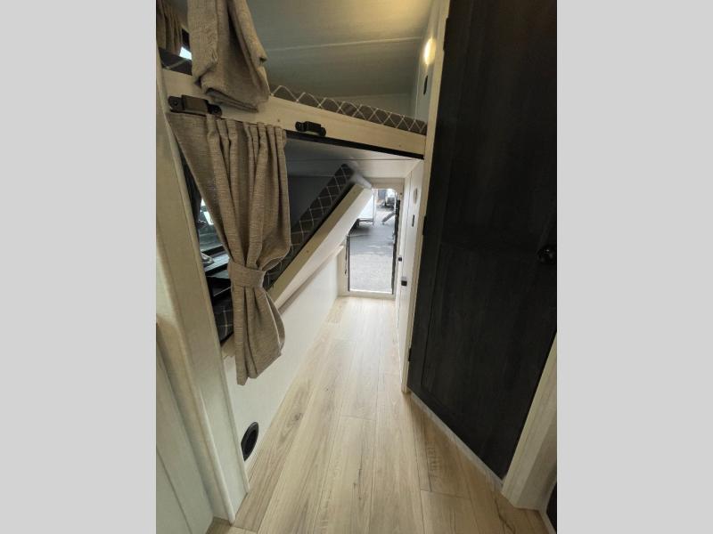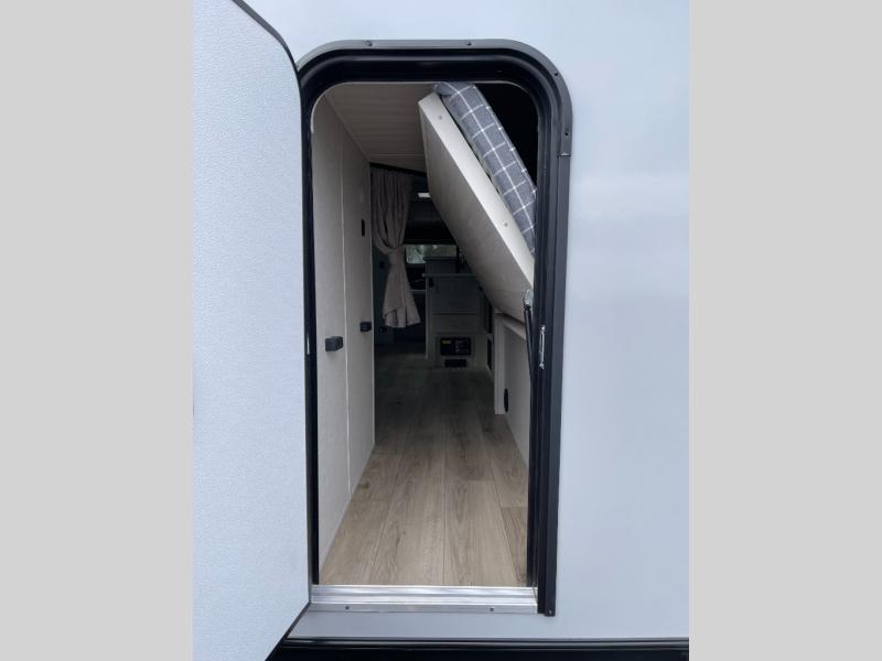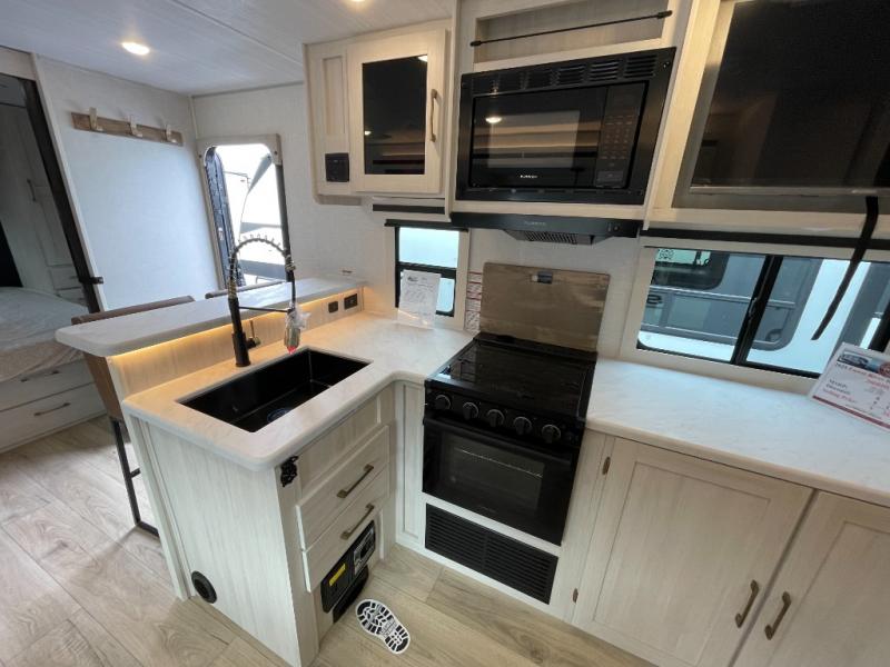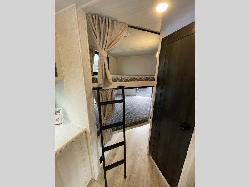 Every trip to the campground will be spent in comfort with this single slide out travel trailer. Once you arrive at the site, remove the kayaks or bikes from the rear storage door, start lunch on the outside kitchen, and put out the 15' power awning with LED lights. The interior includes a booth dinette slide with storage, a bar top with stools, plus an HD TV for movie nights. After a day of fun, head to the front private bedroom for a great night's rest on the queen bed, and you can store your belongings in the dual bedroom wardrobes!