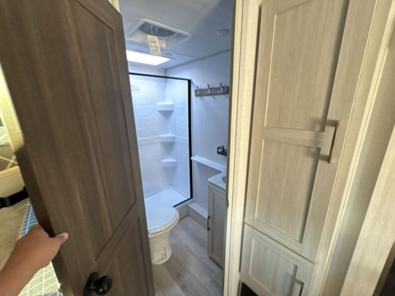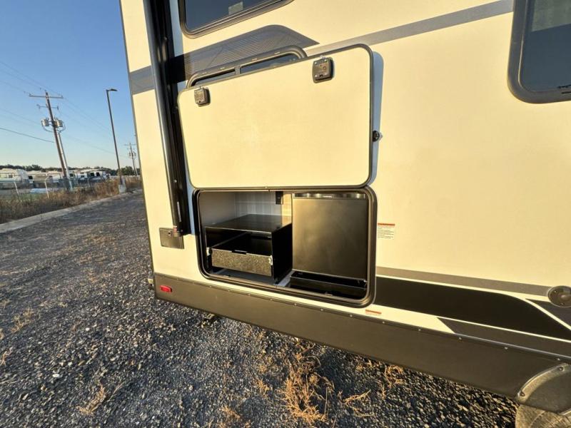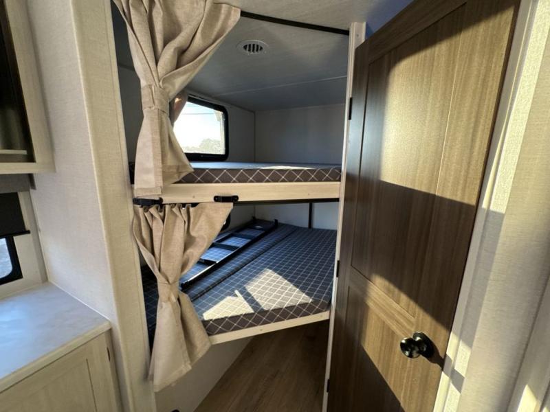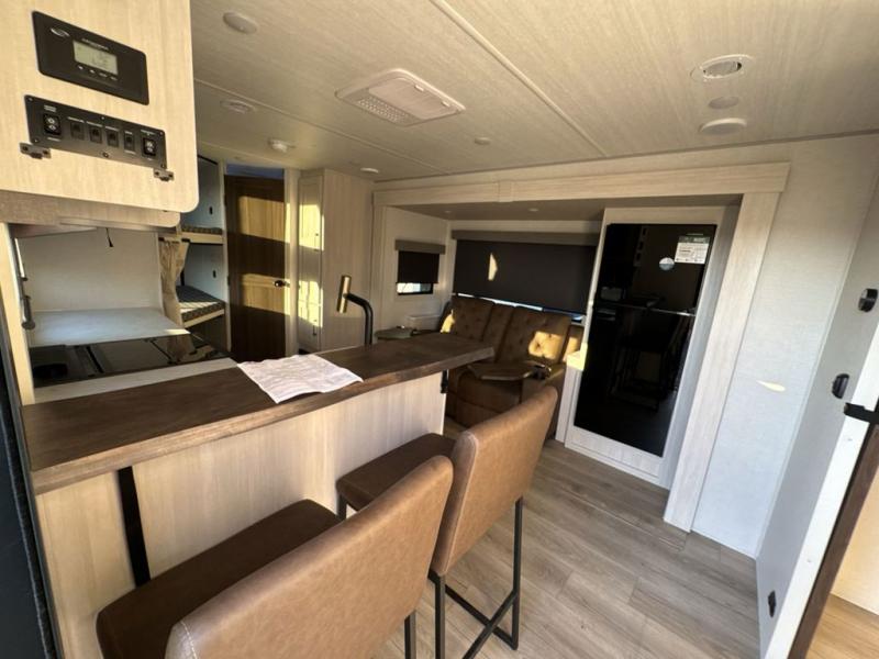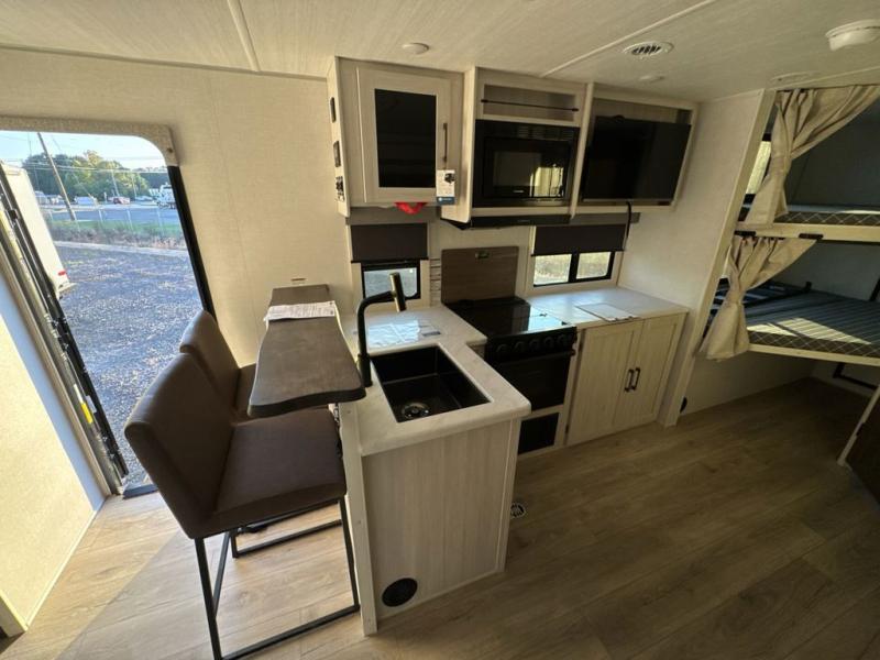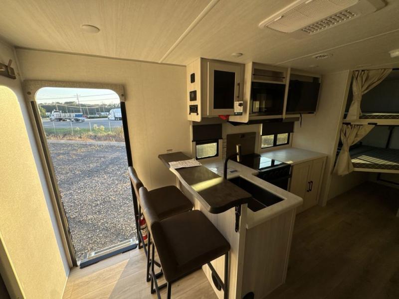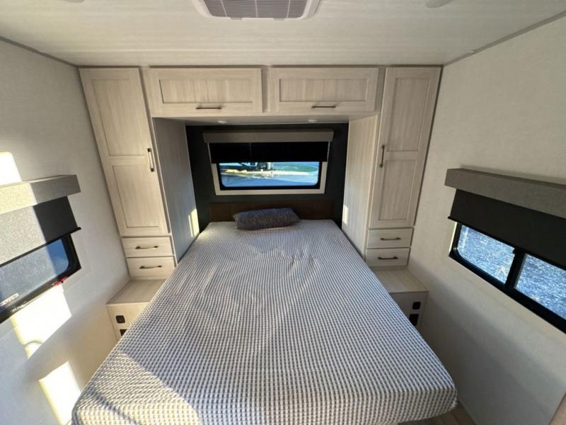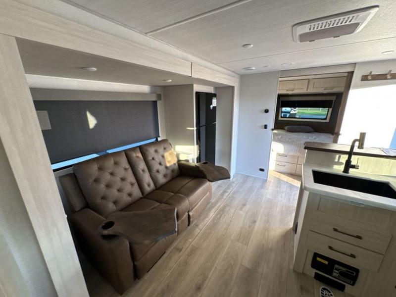 Every trip to the campground will be spent in comfort with this single slide out travel trailer. Once you arrive at the site, remove the kayaks or bikes from the rear storage door, start lunch on the outside kitchen, and put out the 15' power awning with LED lights. The interior includes a booth dinette slide with storage, a bar top with stools, plus an HD TV for movie nights. After a day of fun, head to the front private bedroom for a great night's rest on the queen bed, and you can store your belongings in the dual bedroom wardrobes!