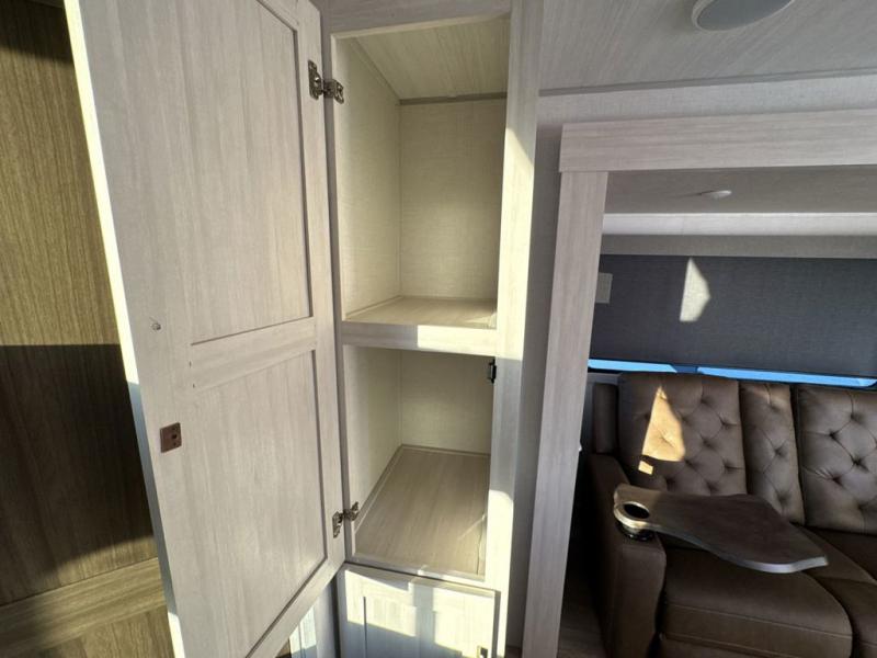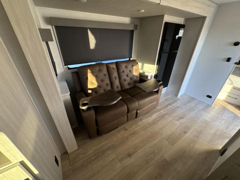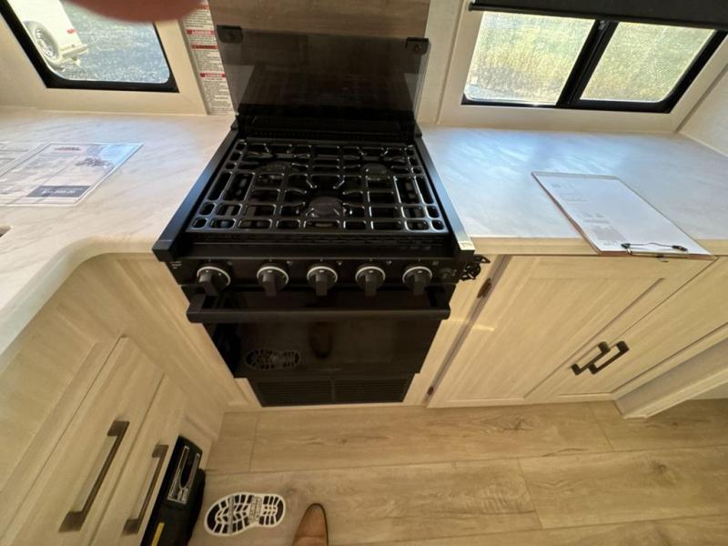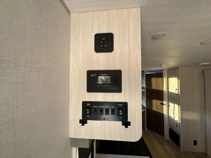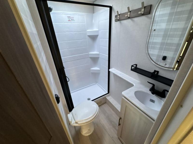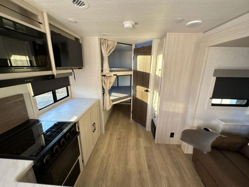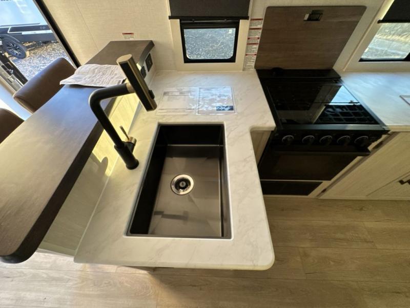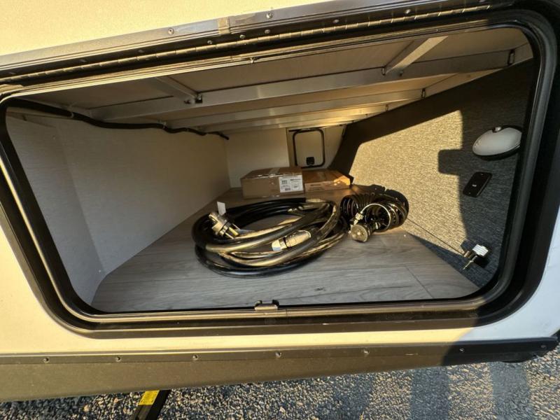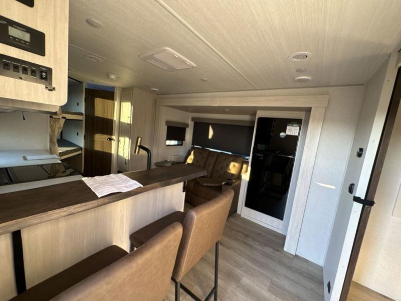 Every trip to the campground will be spent in comfort with this single slide out travel trailer. Once you arrive at the site, remove the kayaks or bikes from the rear storage door, start lunch on the outside kitchen, and put out the 15' power awning with LED lights. The interior includes a booth dinette slide with storage, a bar top with stools, plus an HD TV for movie nights. After a day of fun, head to the front private bedroom for a great night's rest on the queen bed, and you can store your belongings in the dual bedroom wardrobes!