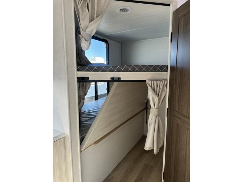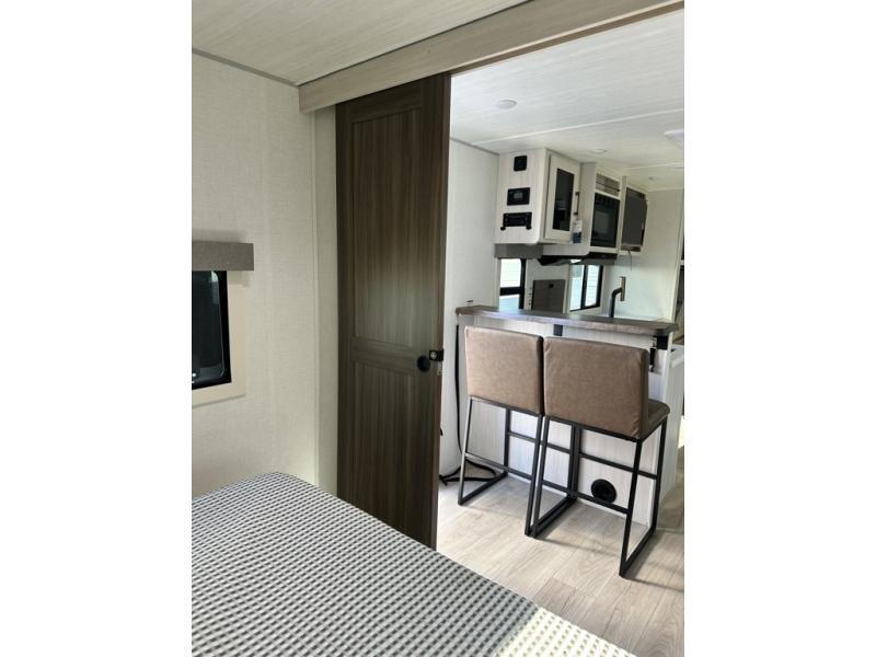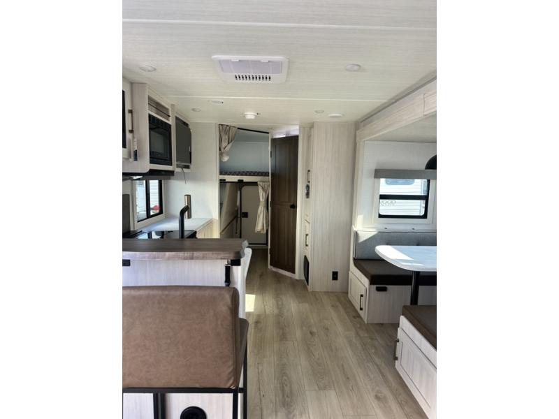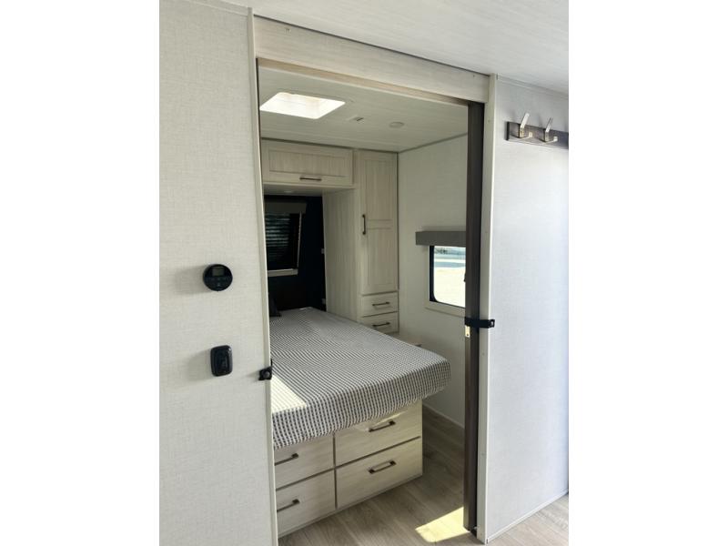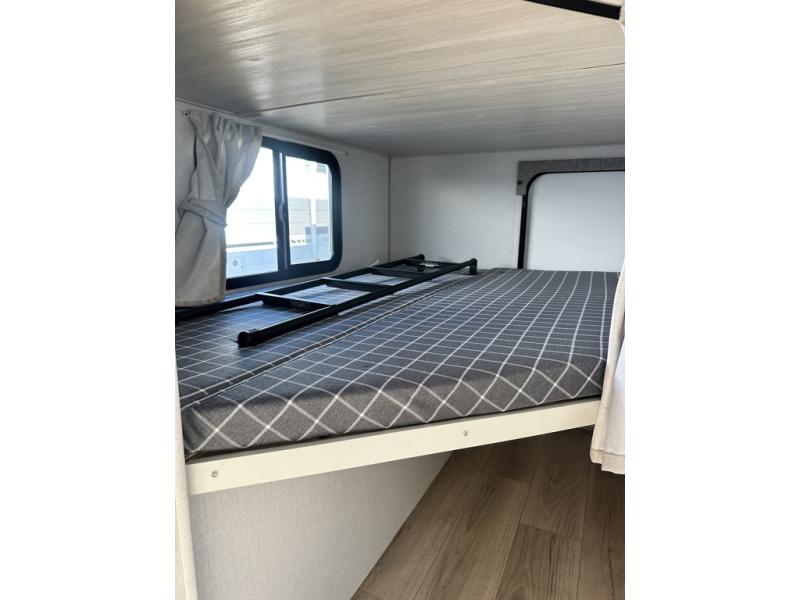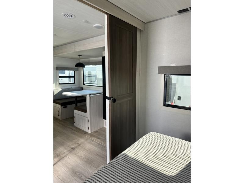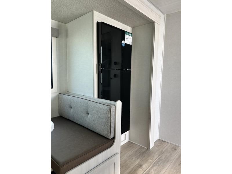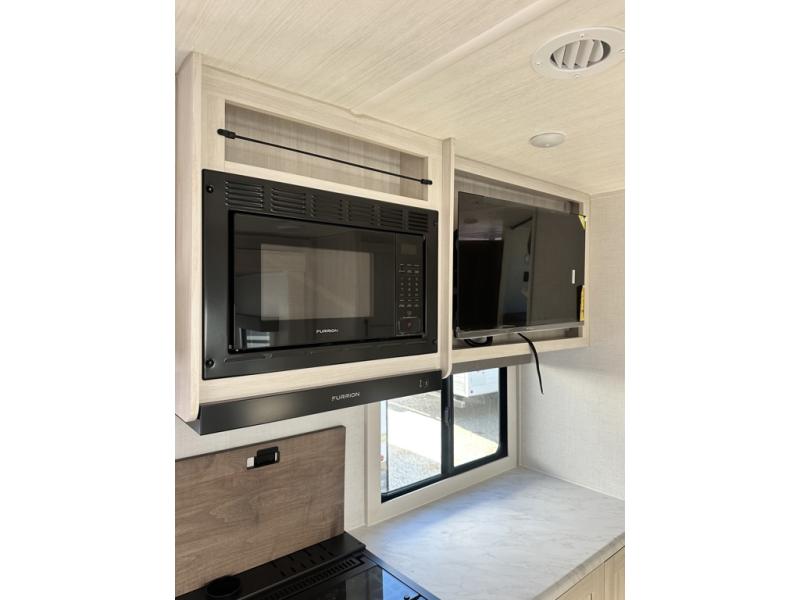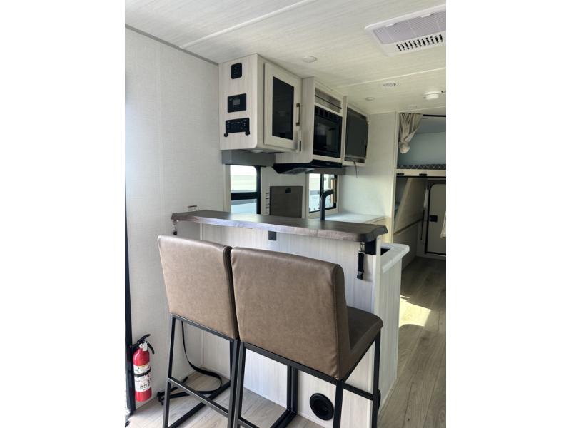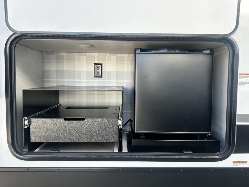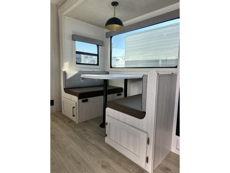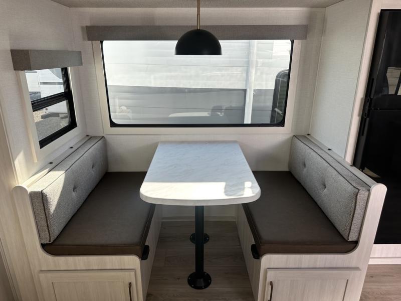 Every trip to the campground will be spent in comfort with this single slide out travel trailer. Once you arrive at the site, remove the kayaks or bikes from the rear storage door, start lunch on the outside kitchen, and put out the 15' power awning with LED lights. The interior includes a booth dinette slide with storage, a bar top with stools, plus an HD TV for movie nights. After a day of fun, head to the front private bedroom for a great night's rest on the queen bed, and you can store your belongings in the dual bedroom wardrobes!