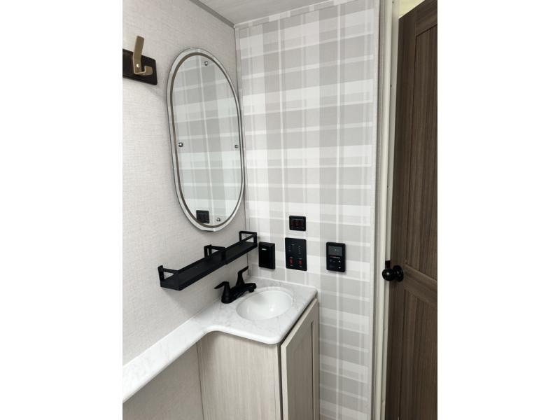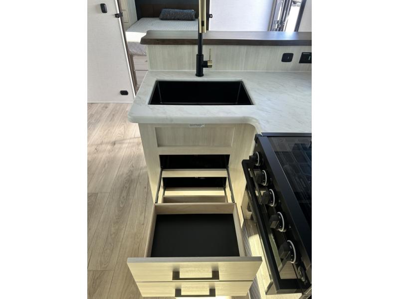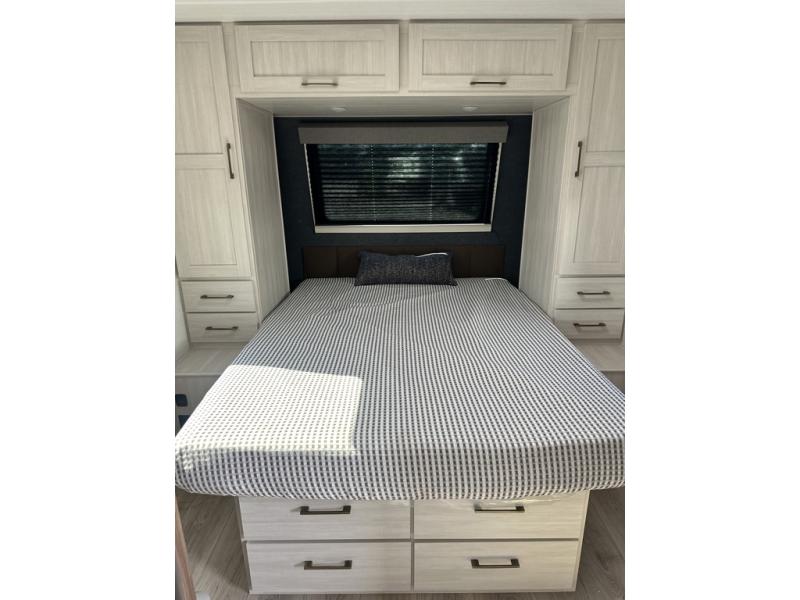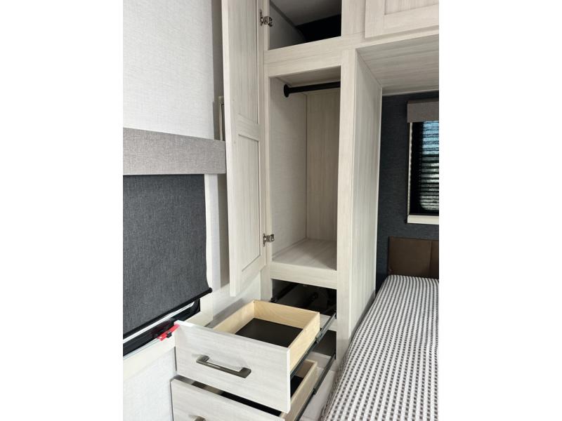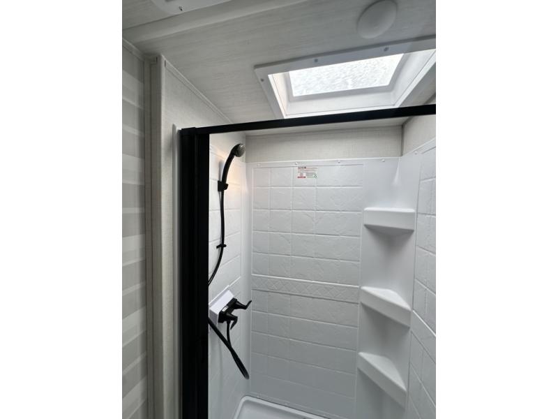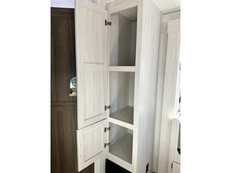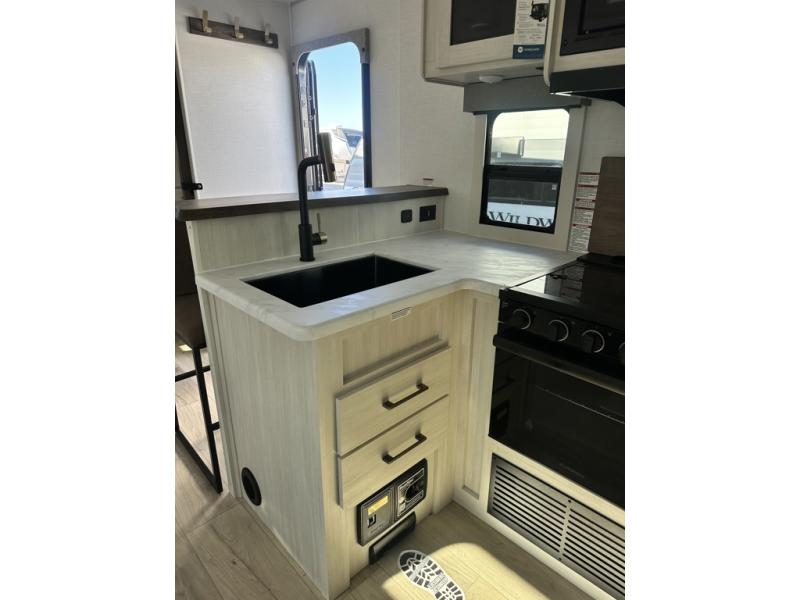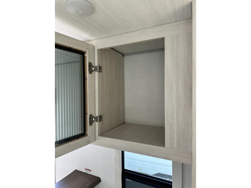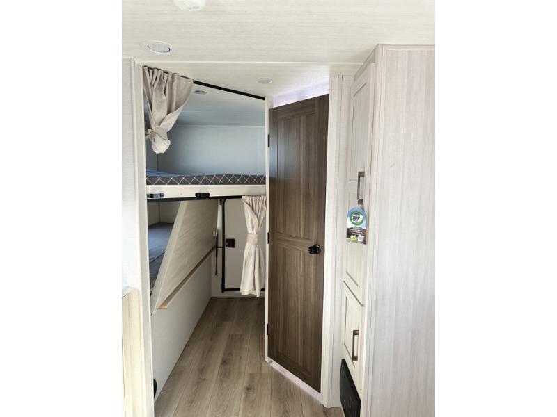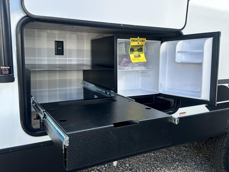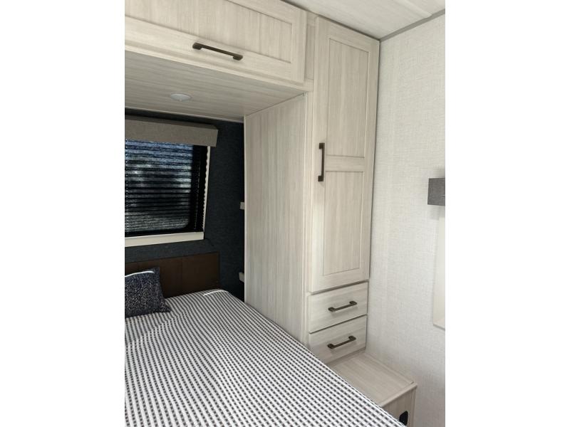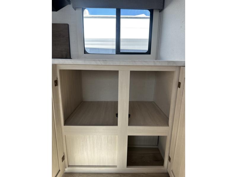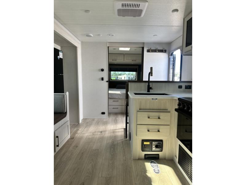 Every trip to the campground will be spent in comfort with this single slide out travel trailer. Once you arrive at the site, remove the kayaks or bikes from the rear storage door, start lunch on the outside kitchen, and put out the 15' power awning with LED lights. The interior includes a booth dinette slide with storage, a bar top with stools, plus an HD TV for movie nights. After a day of fun, head to the front private bedroom for a great night's rest on the queen bed, and you can store your belongings in the dual bedroom wardrobes!