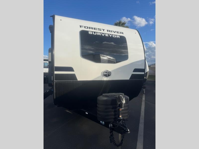 With any Surveyor Legend travel trailer by Forest River you will enjoy quality craftsmanship, convenient amenities, and at-home comforts. The Azdel composite walls provide a longer-lasting trailer, and the power tongue jack with a hitch light will get you back on the road in no-time. There are also Goodyear tires and a tire pressure monitoring system for hassle-free towing. Each model includes the Surveyor Legend Package that comes standard with oversized dinette storage access doors, front slam latch baggage doors, plus an automotive style tinted front windshield. You'll appreciate camping with a tankless water heater for endless hot showers, a 2" accessory hitch to bring bikes along, plus carpet-free interiors and a central vacuum system for easy clean up.
