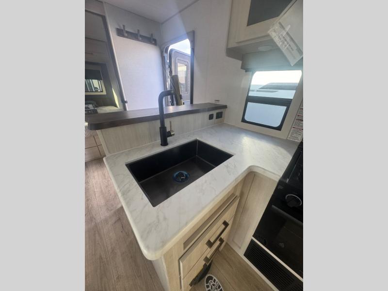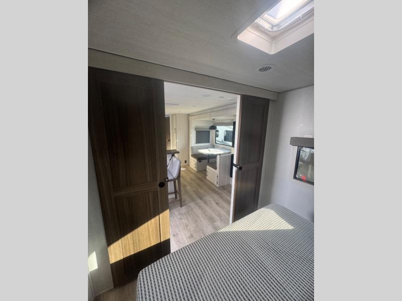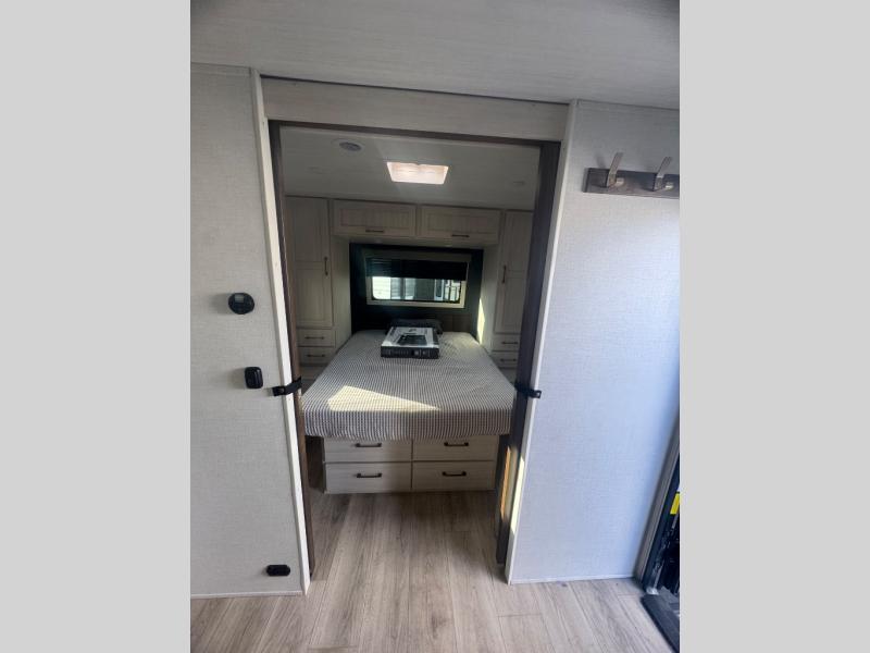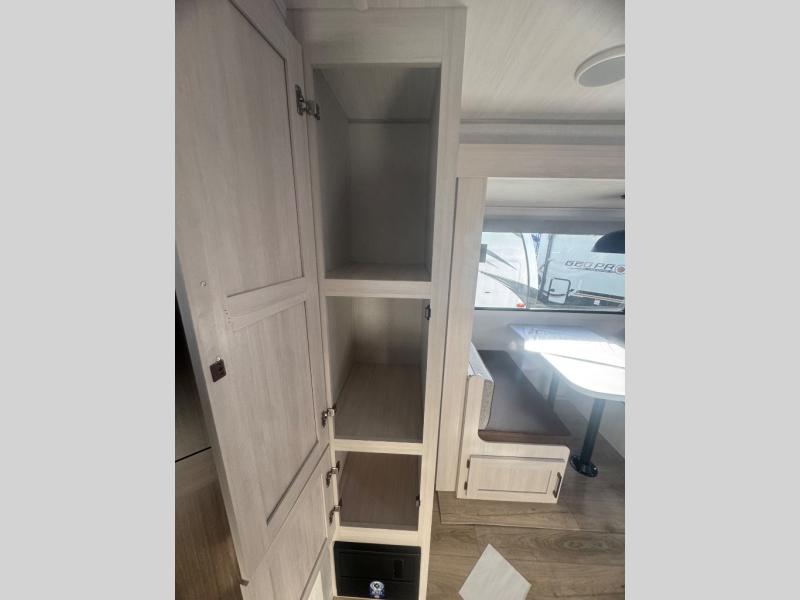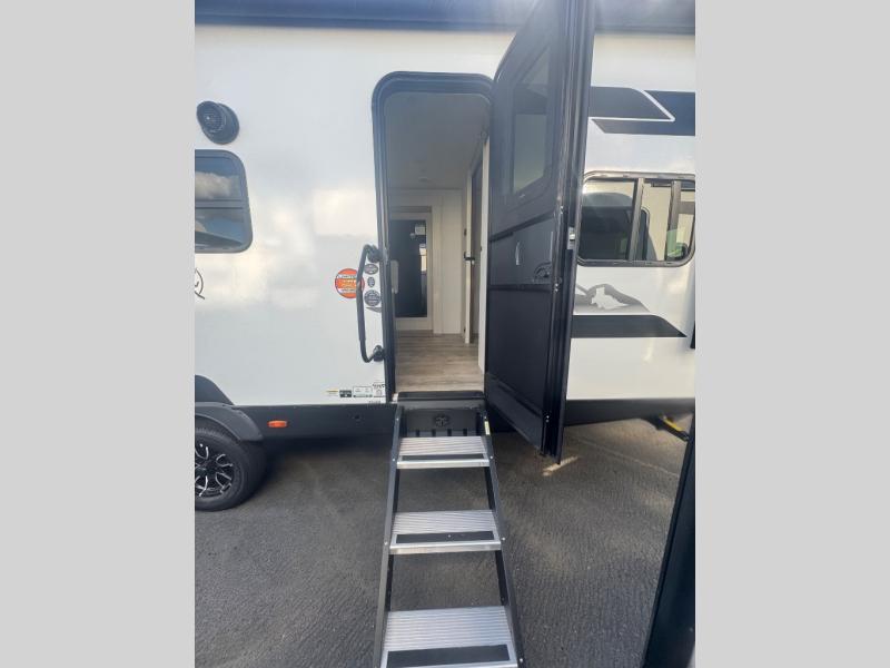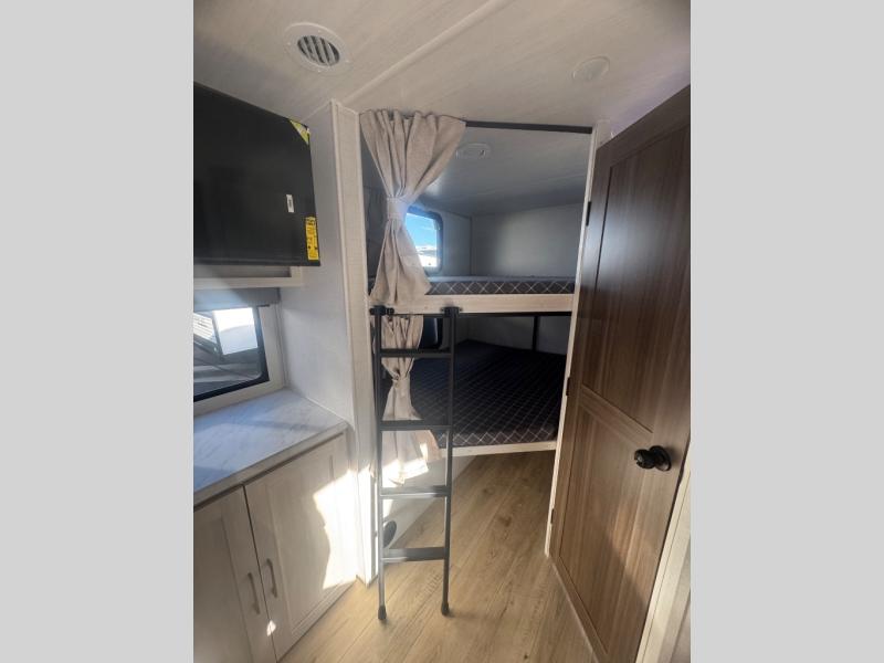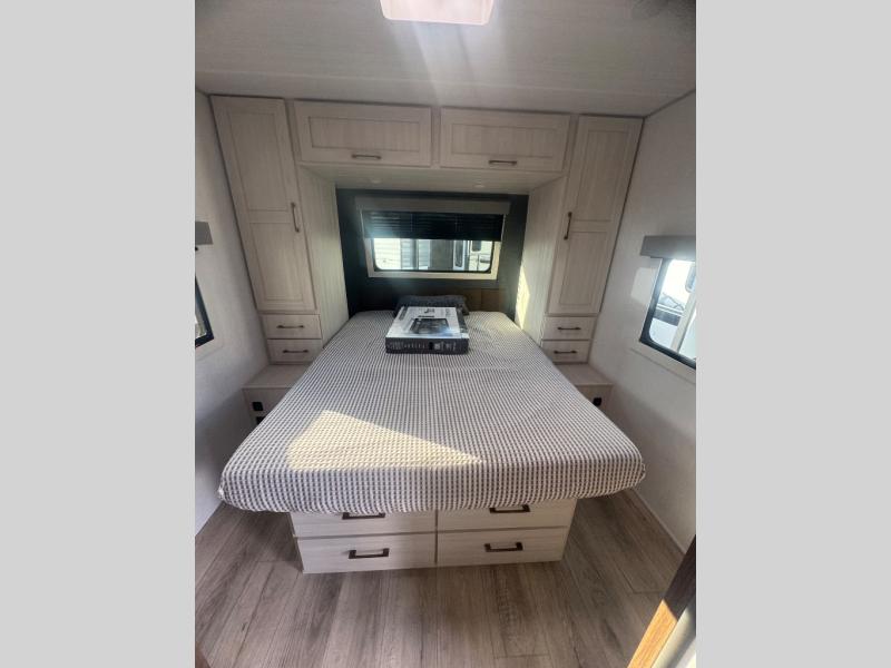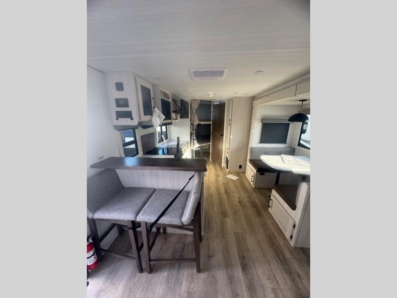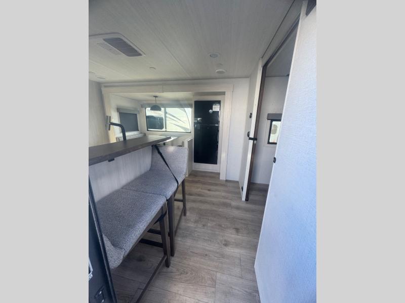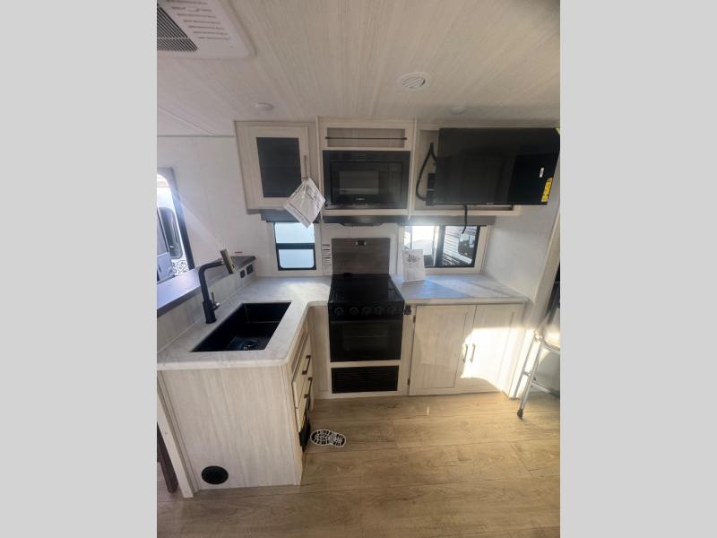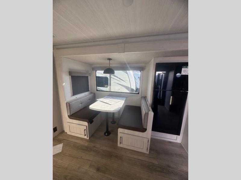 Every trip to the campground will be spent in comfort with this single slide out travel trailer. Once you arrive at the site, remove the kayaks or bikes from the rear storage door, start lunch on the outside kitchen, and put out the 15' power awning with LED lights. The interior includes a booth dinette slide with storage, a bar top with stools, plus an HD TV for movie nights. After a day of fun, head to the front private bedroom for a great night's rest on the queen bed, and you can store your belongings in the dual bedroom wardrobes!