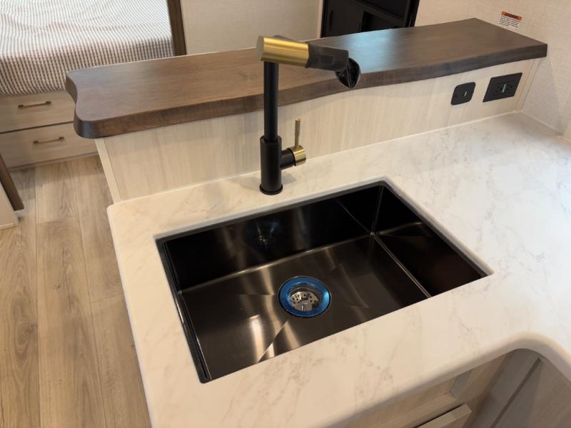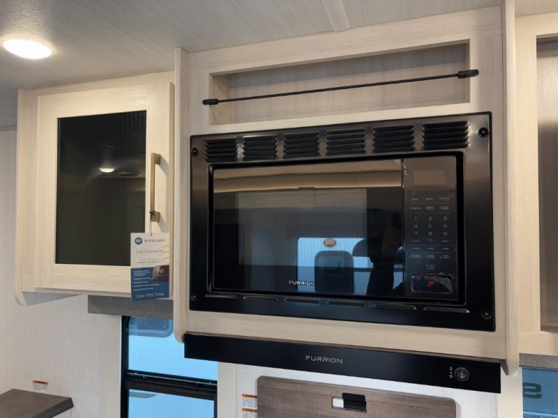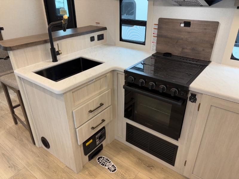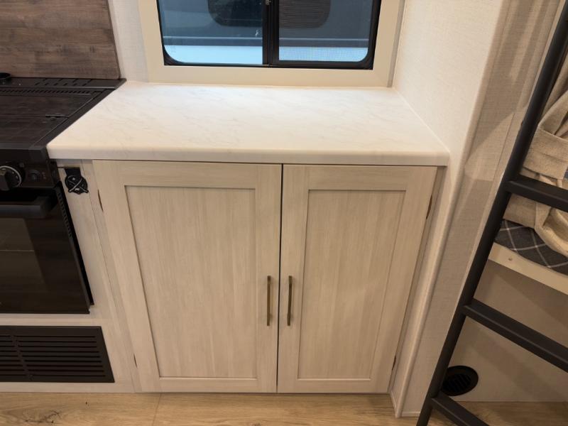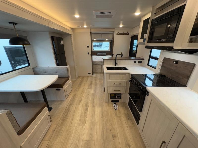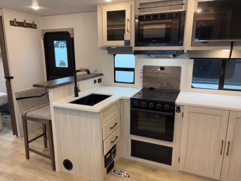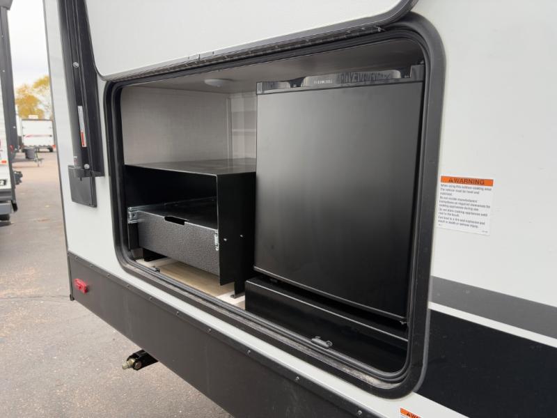 Every trip to the campground will be spent in comfort with this single slide out travel trailer. Once you arrive at the site, remove the kayaks or bikes from the rear storage door, start lunch on the outside kitchen, and put out the 15' power awning with LED lights. The interior includes a booth dinette slide with storage, a bar top with stools, plus an HD TV for movie nights. After a day of fun, head to the front private bedroom for a great night's rest on the queen bed, and you can store your belongings in the dual bedroom wardrobes!
